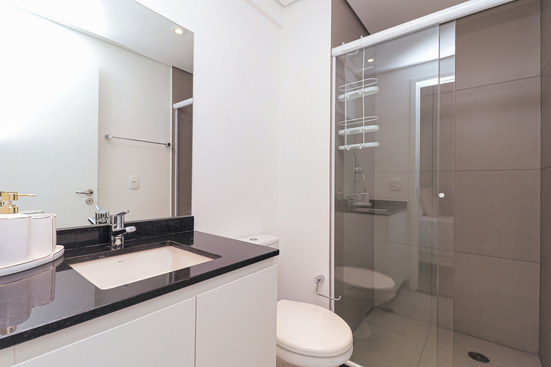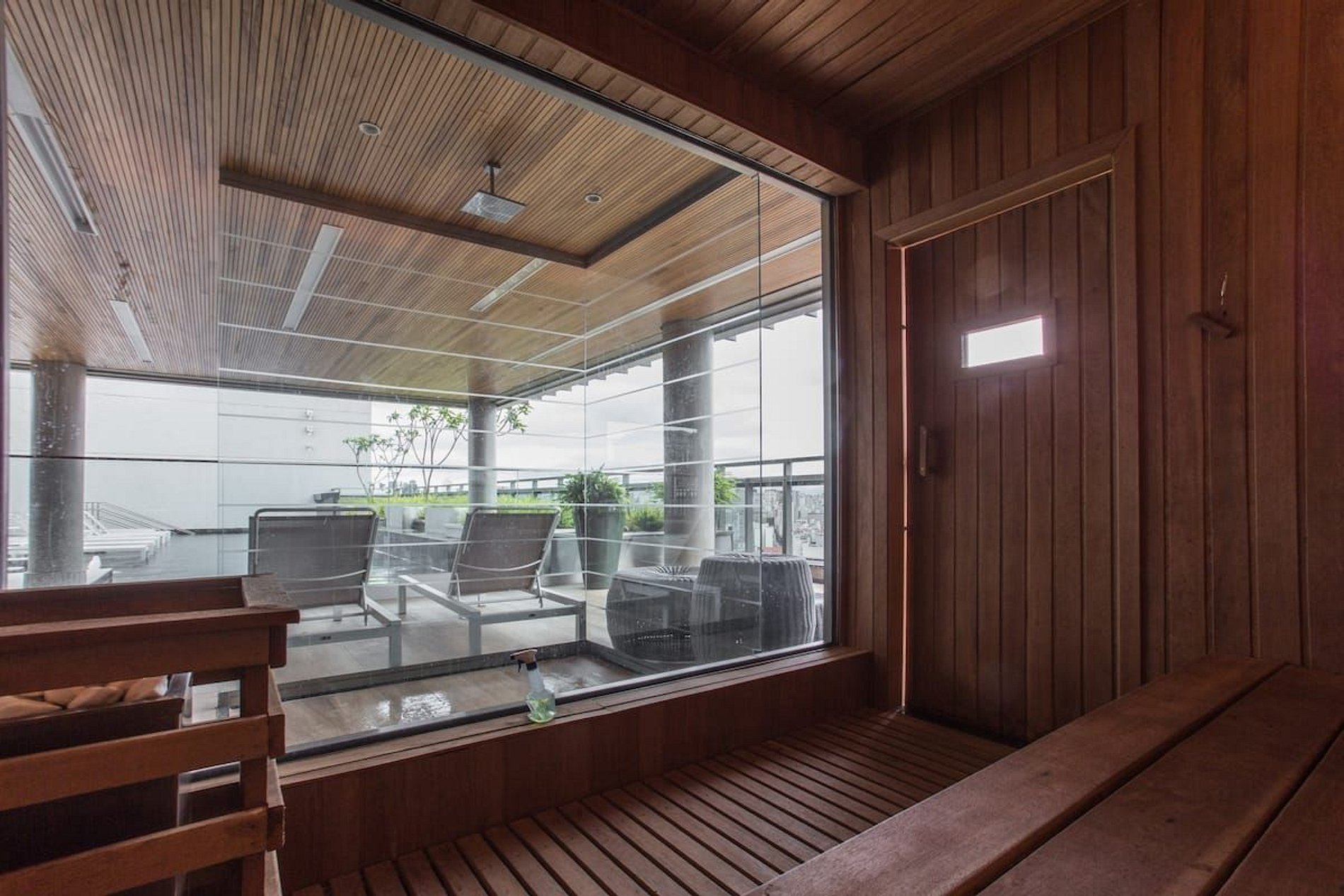 Edifício residencial com lazer completo. Piscina, sauna e academia disponíveis para inquilinos de curta temporada.