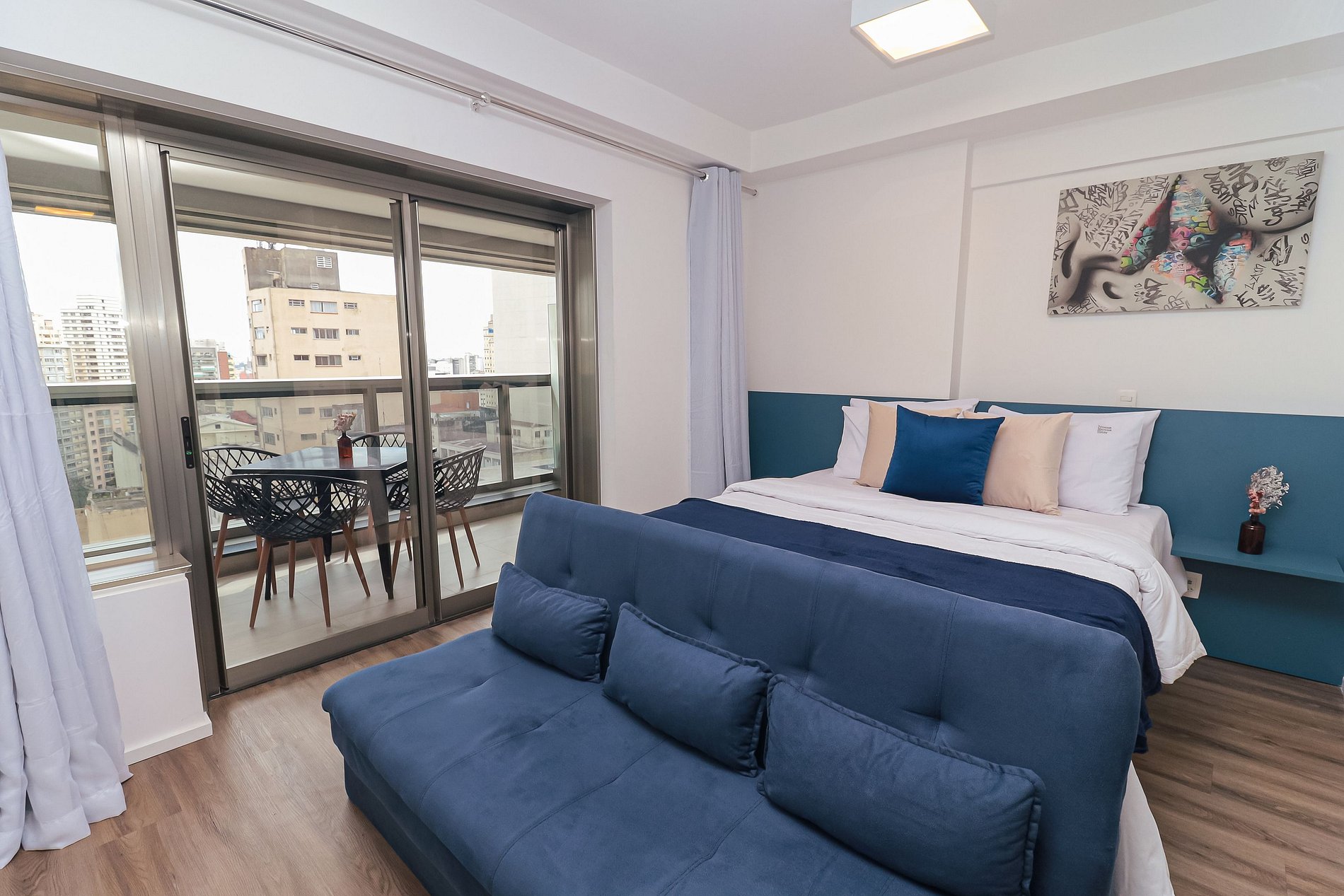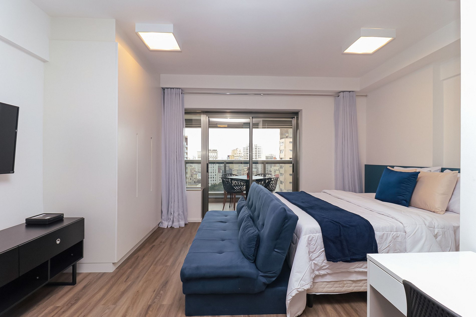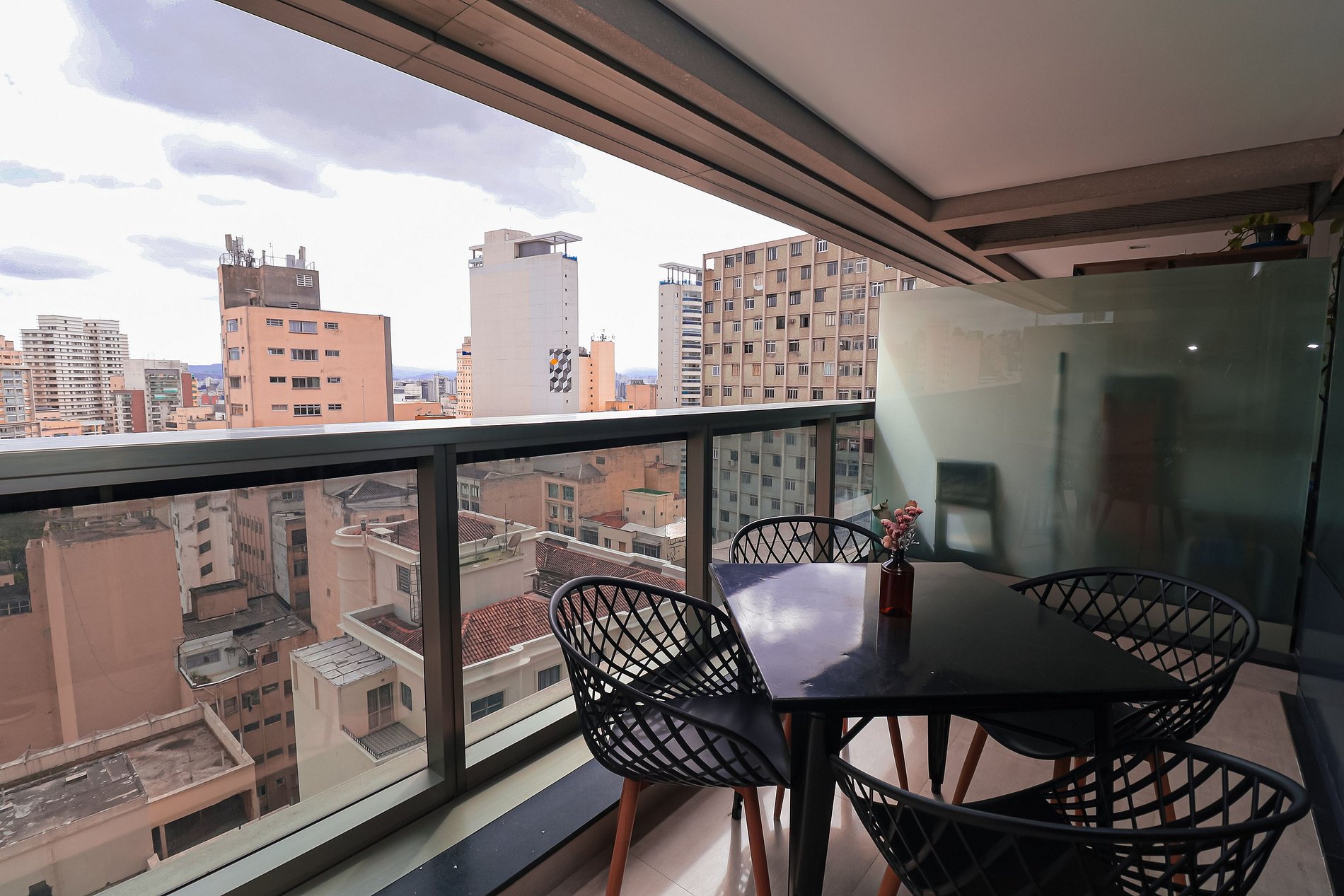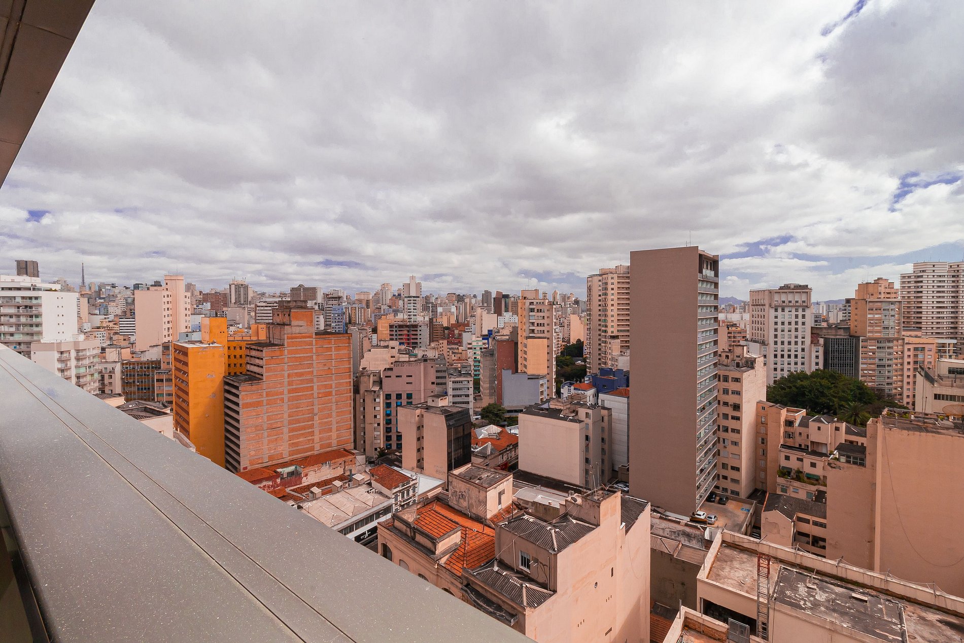 O estúdio é amplo e completo com a presença de tons aconchegantes e varanda com vista pra cidade. Essa é uma acomodação pra quem procura por praticidade e conforto, pois conta com cozinha, cama confortável, marcenaria embutida e ar condicionado. Além do apartamento ser maravilhoso, o edifício em que está localizado conta com piscina, academia, lavanderia (paga), e é ao lado da estação de metrô República, tendo toda praticidade ao acesso da cidade.