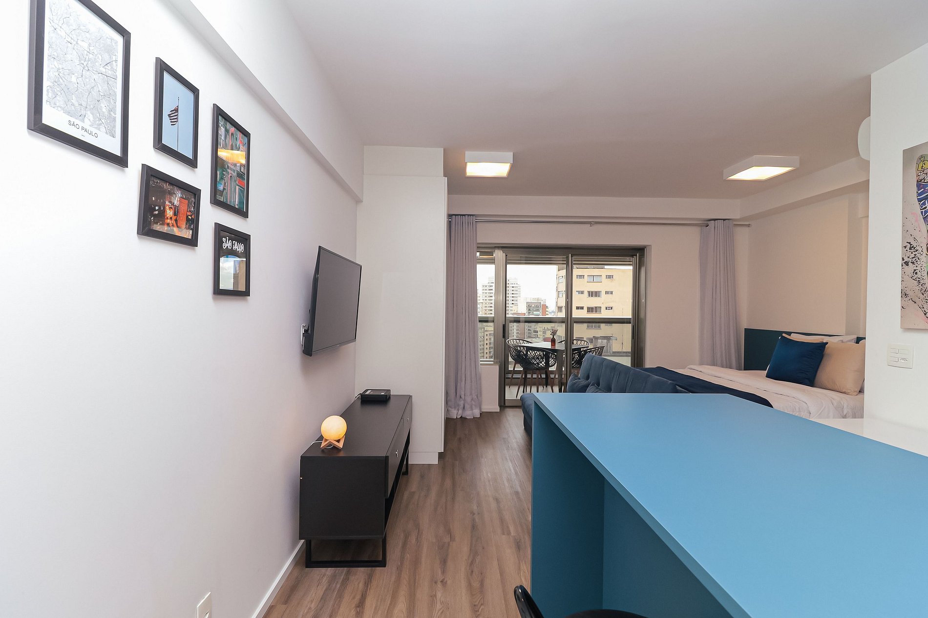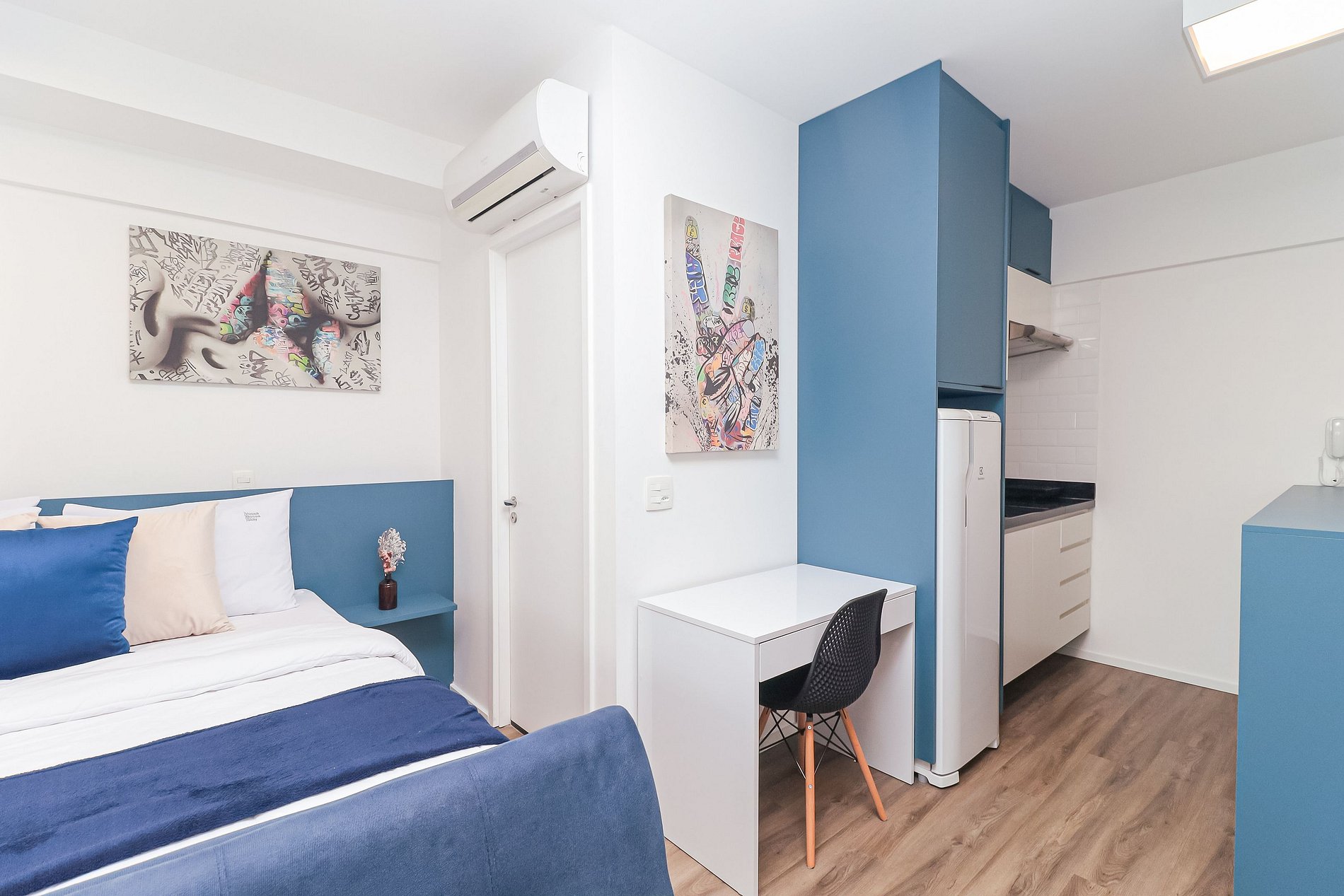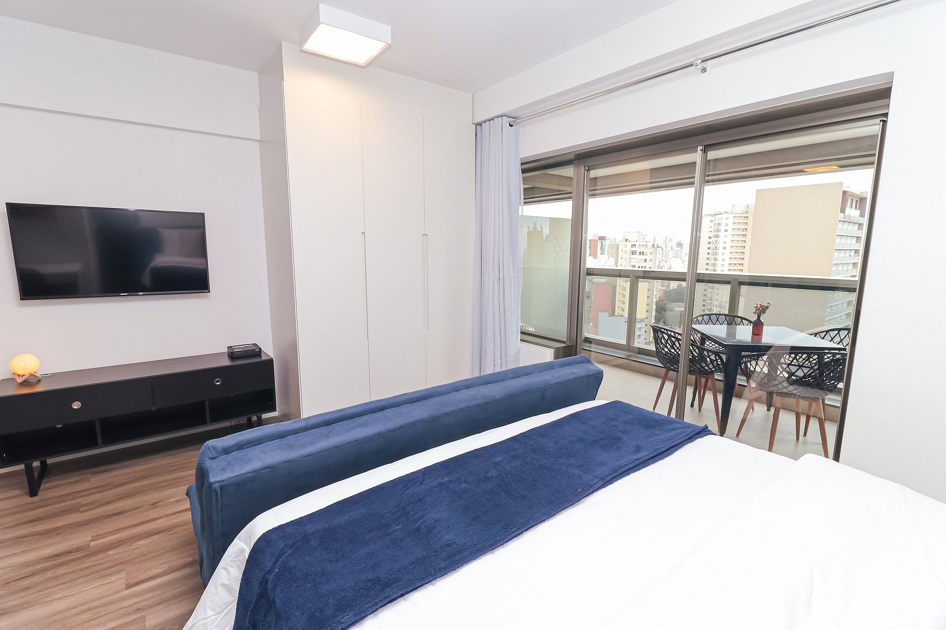 O estúdio é amplo e completo com a presença de tons aconchegantes e varanda com vista pra cidade. Essa é uma acomodação pra quem procura por praticidade e conforto, pois conta com cozinha, cama confortável, marcenaria embutida e ar condicionado. Além do apartamento ser maravilhoso, o edifício em que está localizado conta com piscina, academia, lavanderia (paga), e é ao lado da estação de metrô República, tendo toda praticidade ao acesso da cidade.