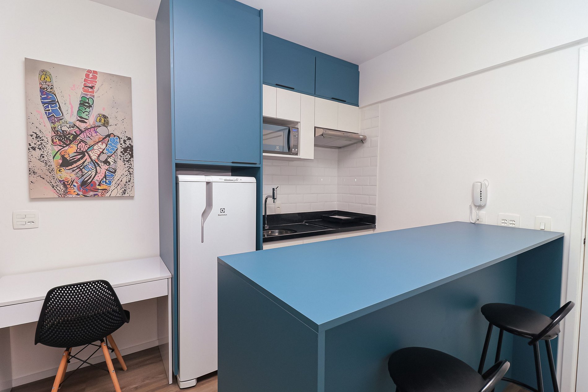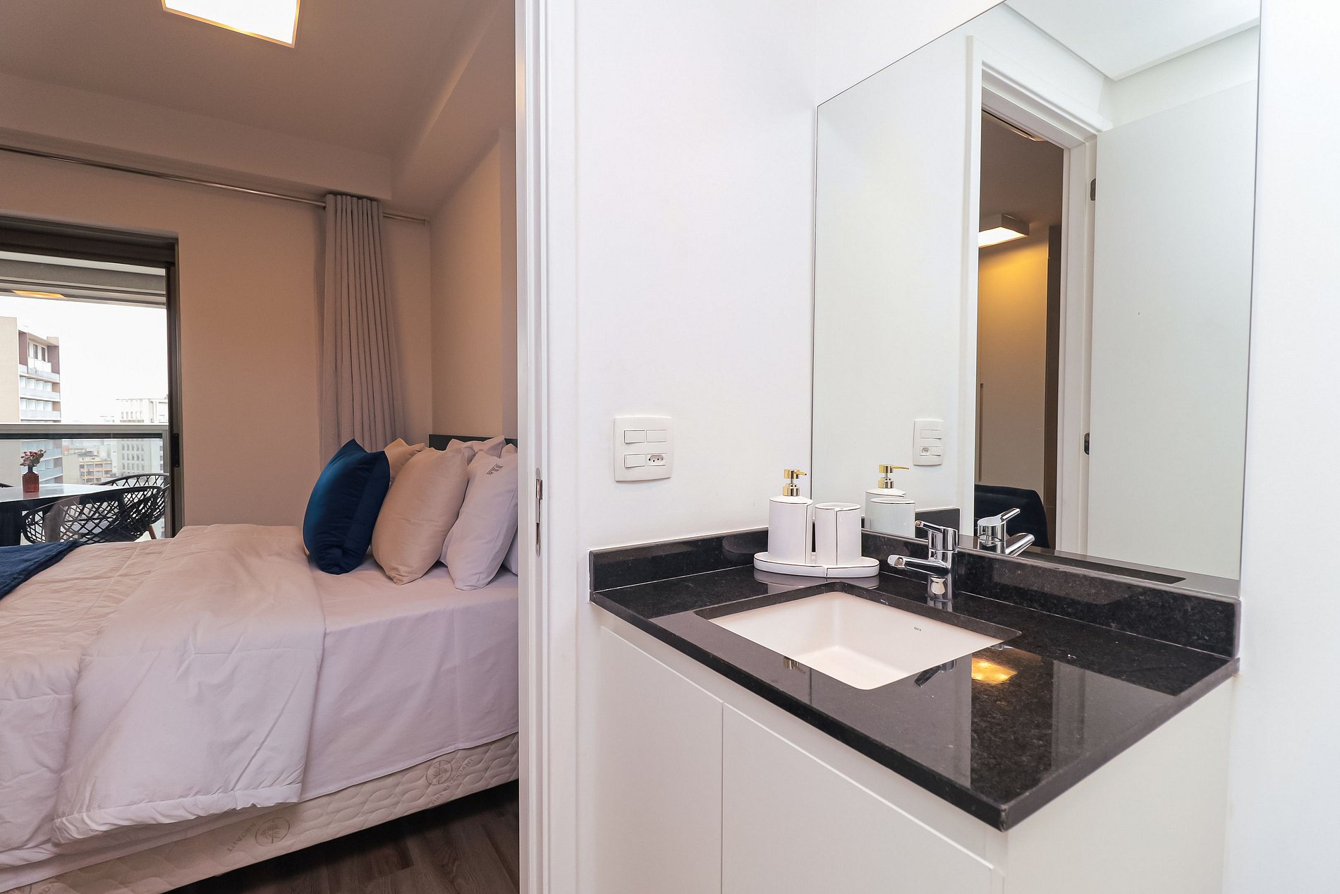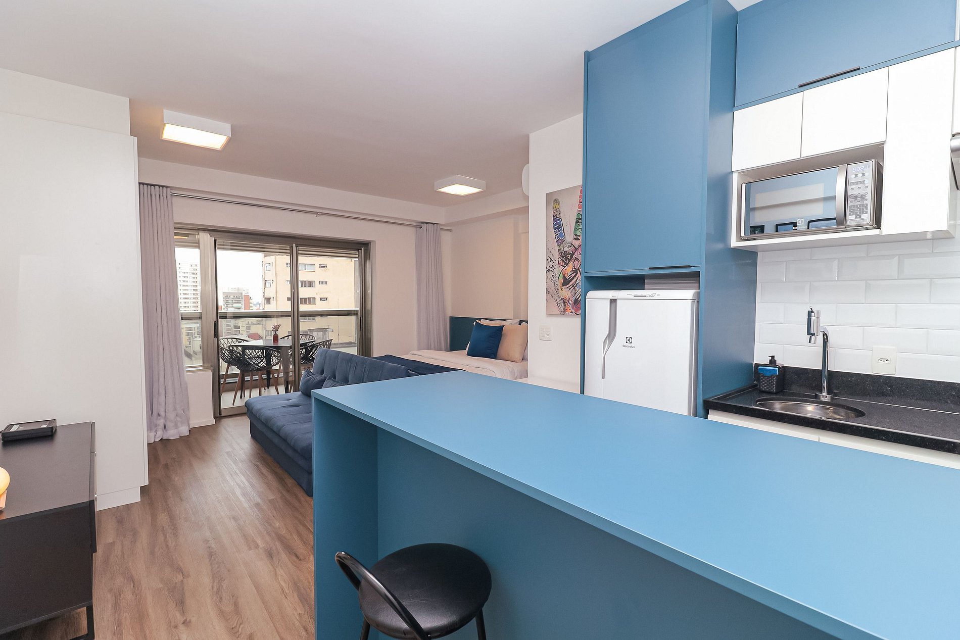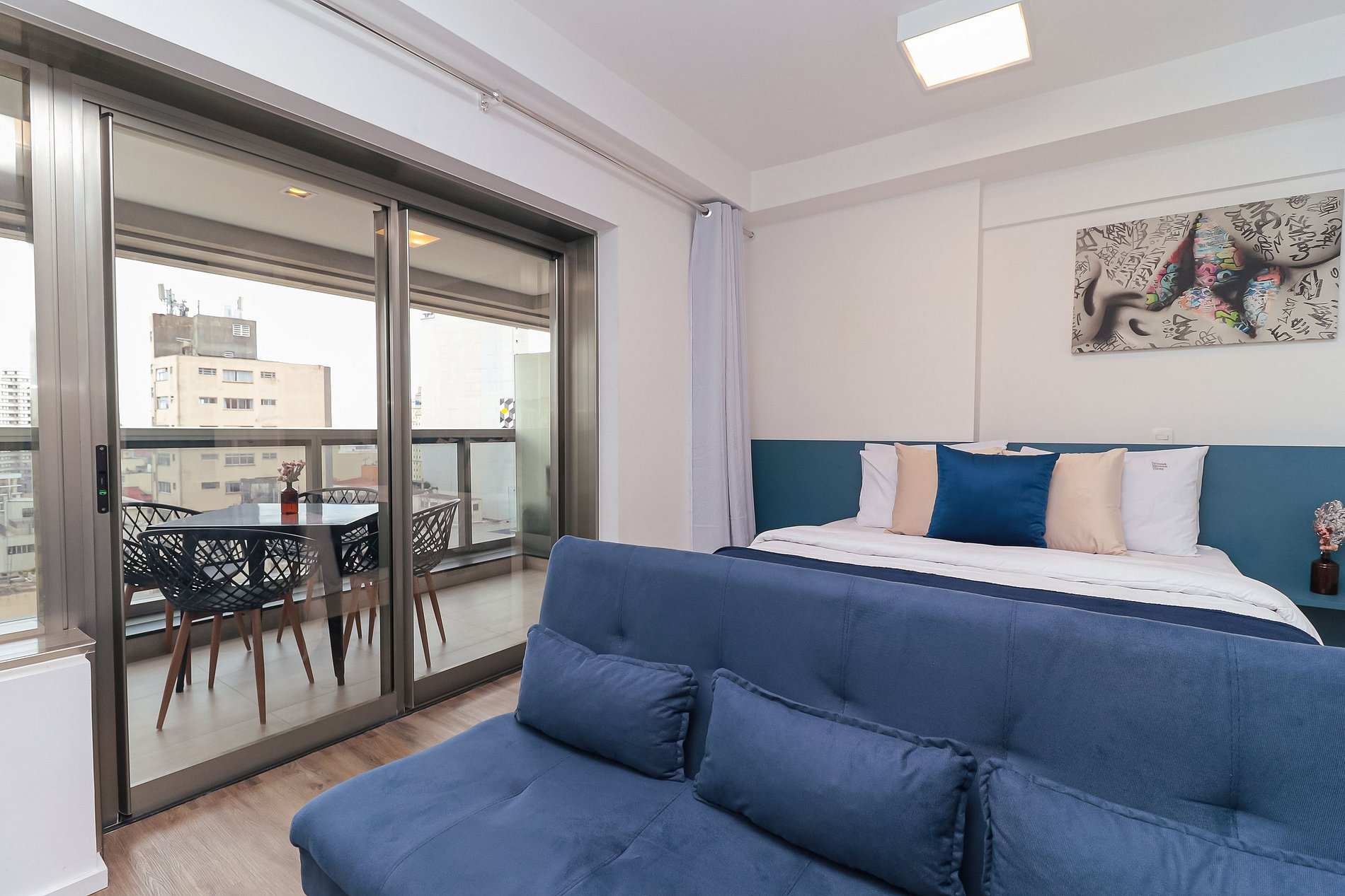 O estúdio é amplo e completo com a presença de tons aconchegantes e varanda com vista pra cidade. Essa é uma acomodação pra quem procura por praticidade e conforto, pois conta com cozinha, cama confortável, marcenaria embutida e ar condicionado. Além do apartamento ser maravilhoso, o edifício em que está localizado conta com piscina, academia, lavanderia (paga), e é ao lado da estação de metrô República, tendo toda praticidade ao acesso da cidade.
