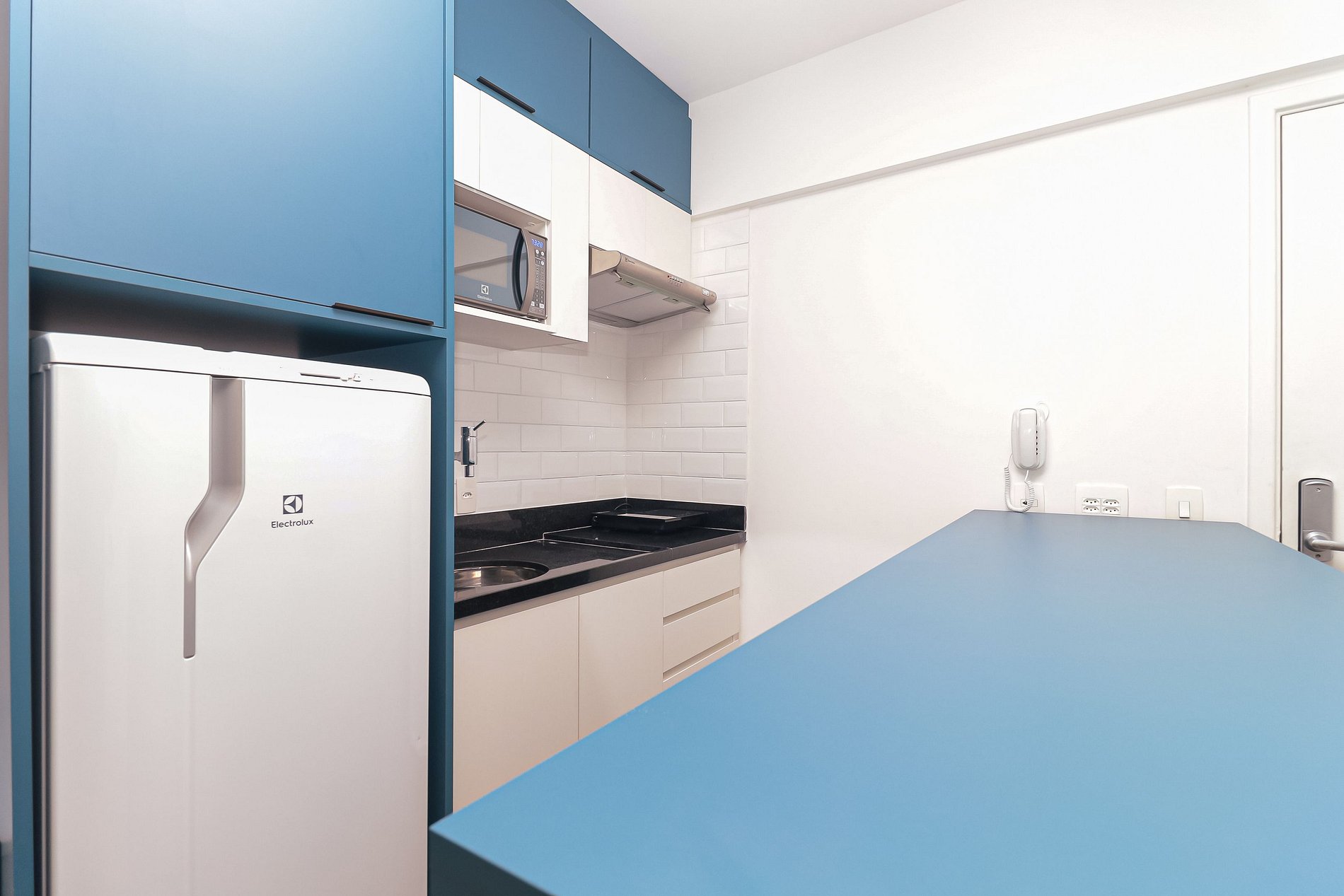 O espaço é composto por varanda com vista, quarto amplo, cozinha completa e banheiro, tudo compactado e otimizado da melhor forma. Os ambientes conversam entre cores e texturas, com tons escolhidos a dedo pra trazer praticidade e conforto ao hóspede.