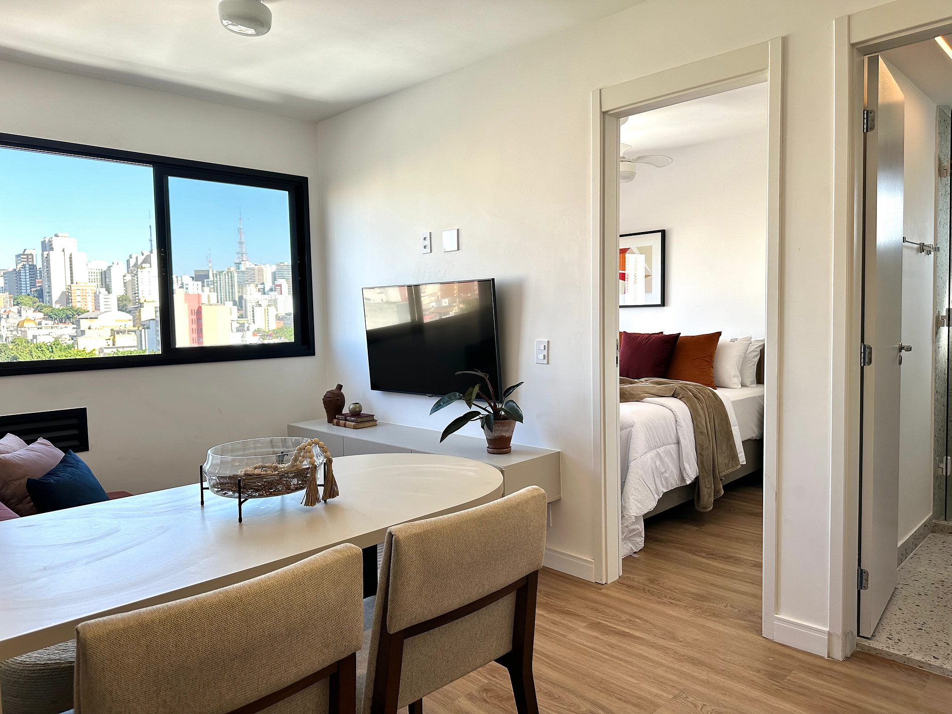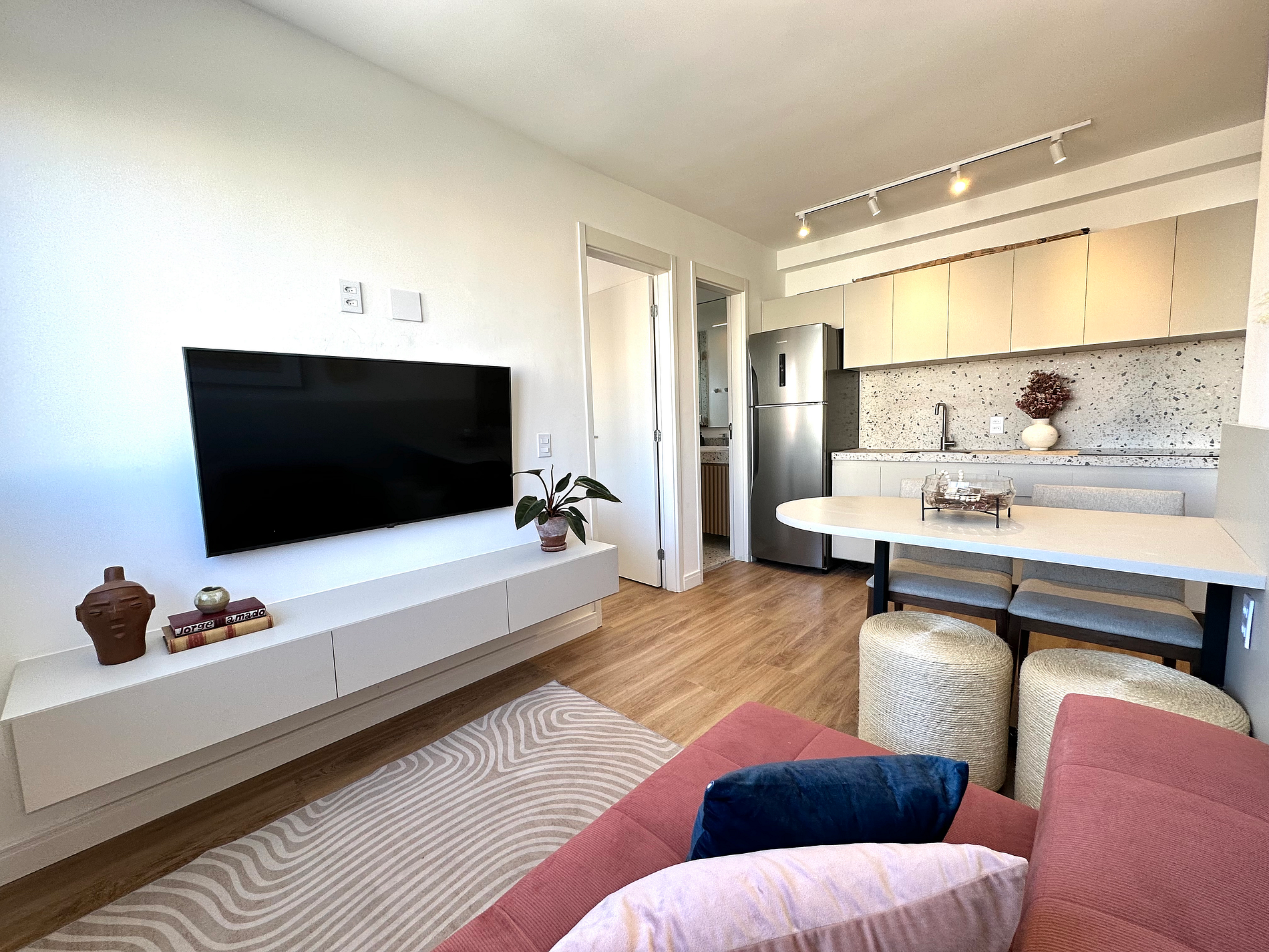 Ao primeiro olhar, já é possível observar os acabamentos únicos e com bom gosto feitos em marcenaria. Uma sala ampla que se conecta aos quartos, banheiro e cozinha, sendo um lugar perfeito para se hospedar.