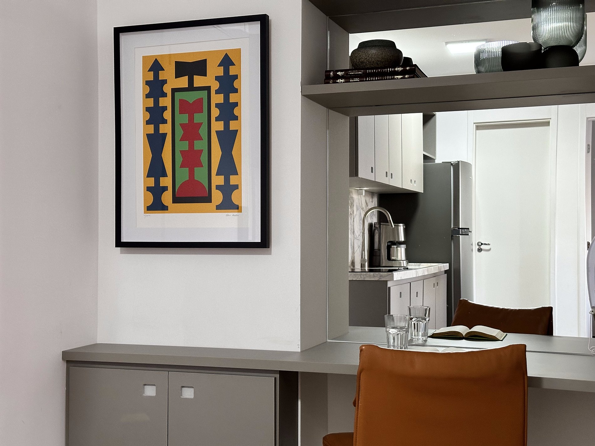 Ao primeiro olhar, já é possível observar os acabamentos únicos e com bom gosto feitos em marcenaria complementados com uma decoração escolhida a dedo com vários elementos de garimpo.