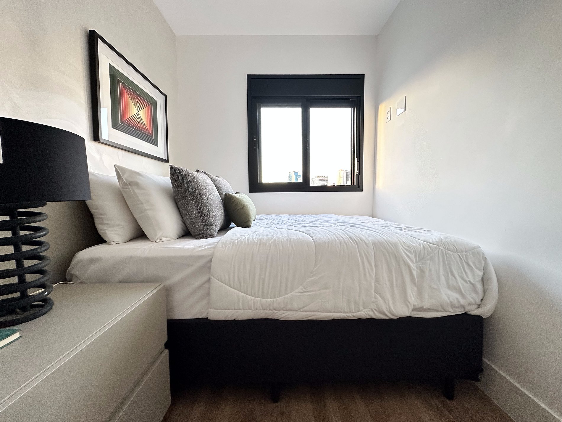 Apartamento recém-reformado em uma região central da cidade. No 12º andar, este espaço de 37m² oferece dois dormitórios otimizados, uma cozinha completa integrada à sala de estar e um banheiro. Sua localização é estratégica, próximo ao Hospital Sírio Libanês e com fácil acesso a diversas comodidades para uma estadia confortável. O edifício conta com portaria 24 horas e academia gratuita para os hóspedes, além de lavanderia paga para praticidade adicional.