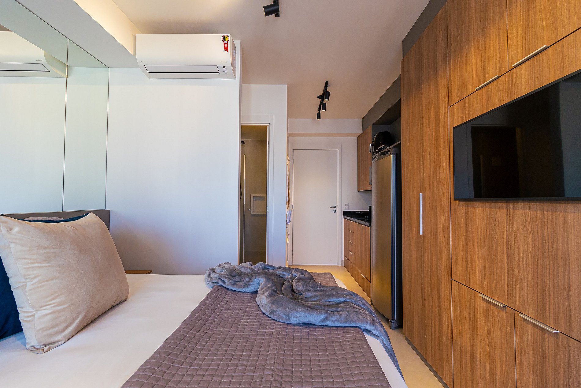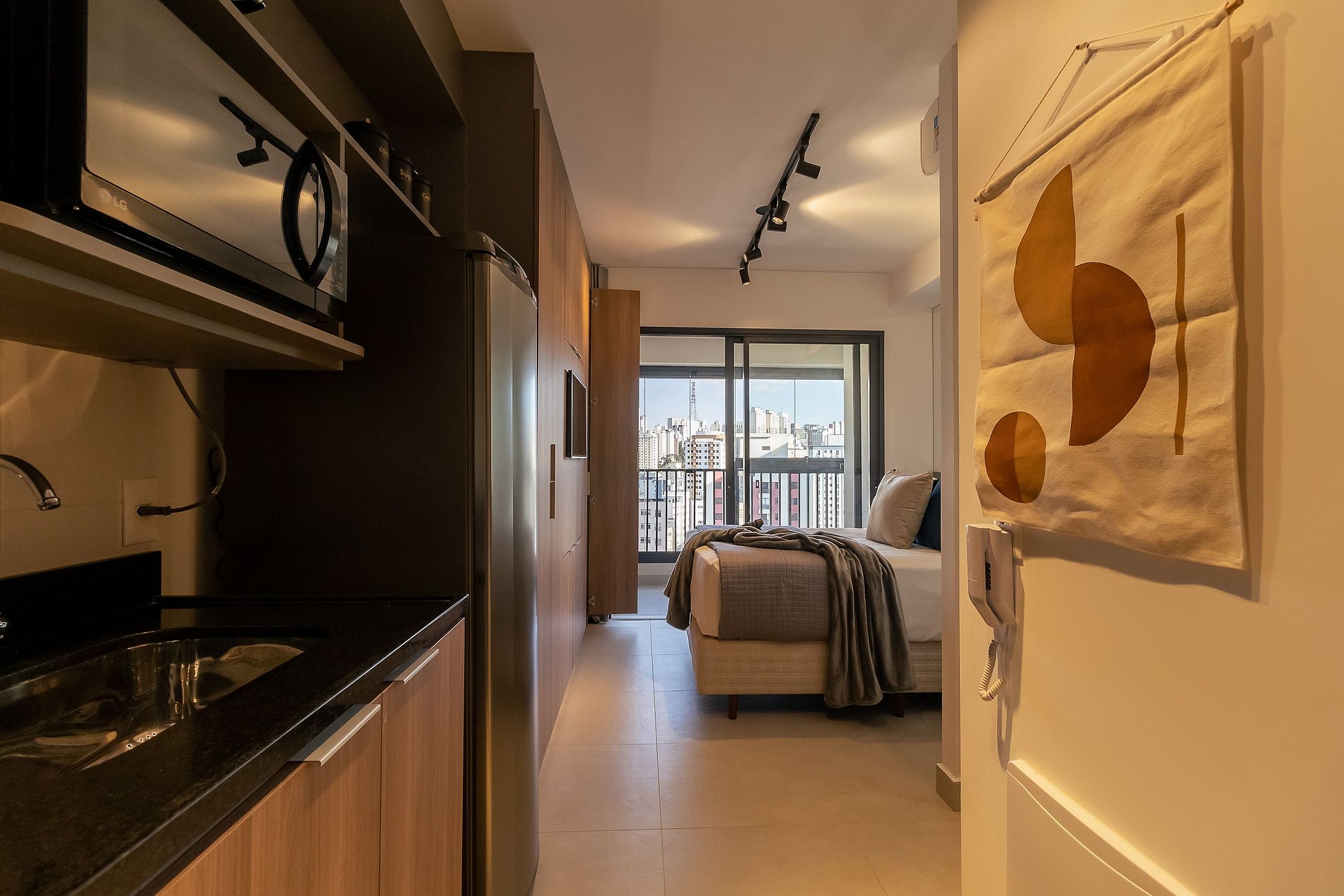 Studio lindo com vista da cidade, piscina interna, externa e academia completa.