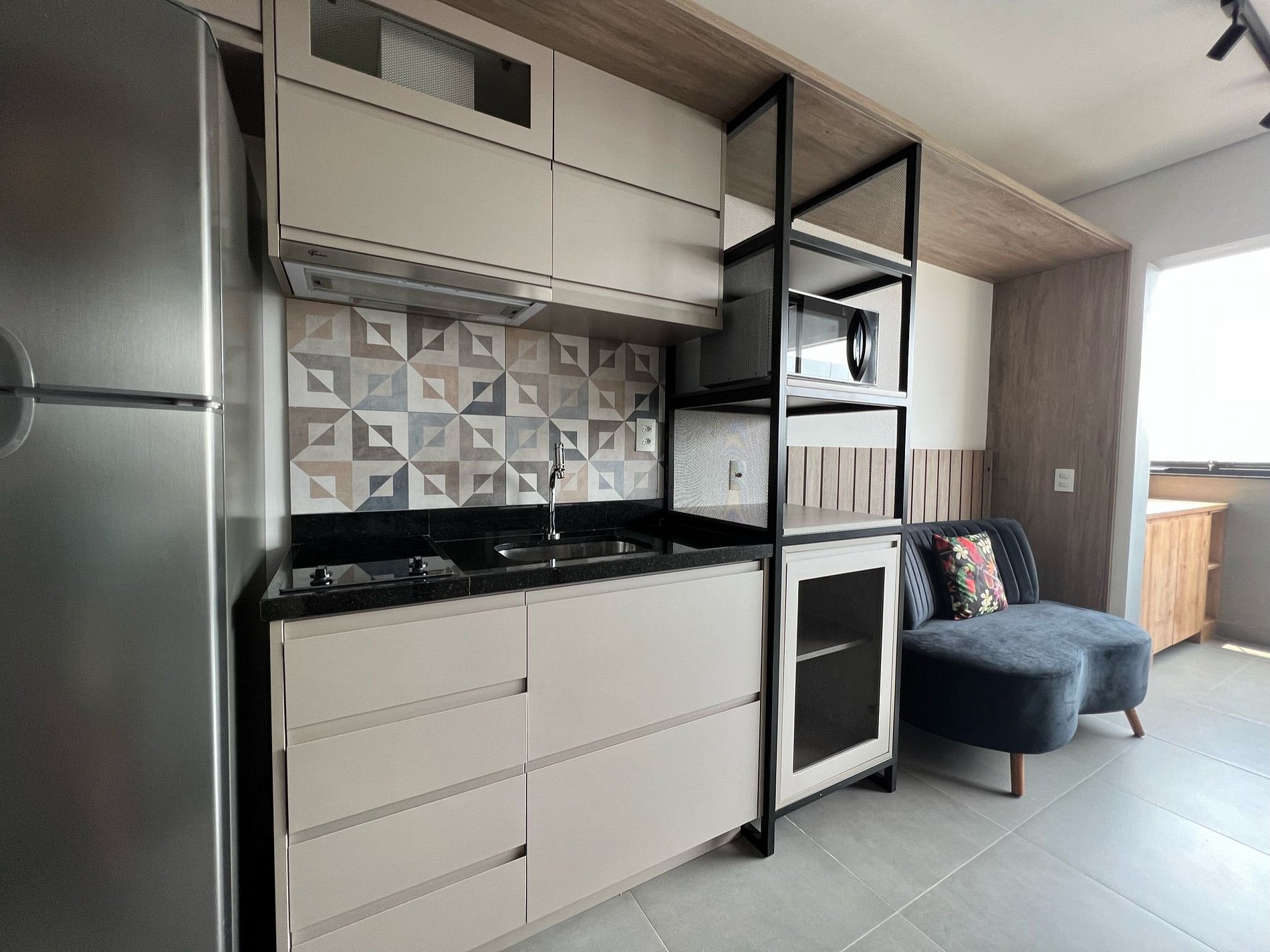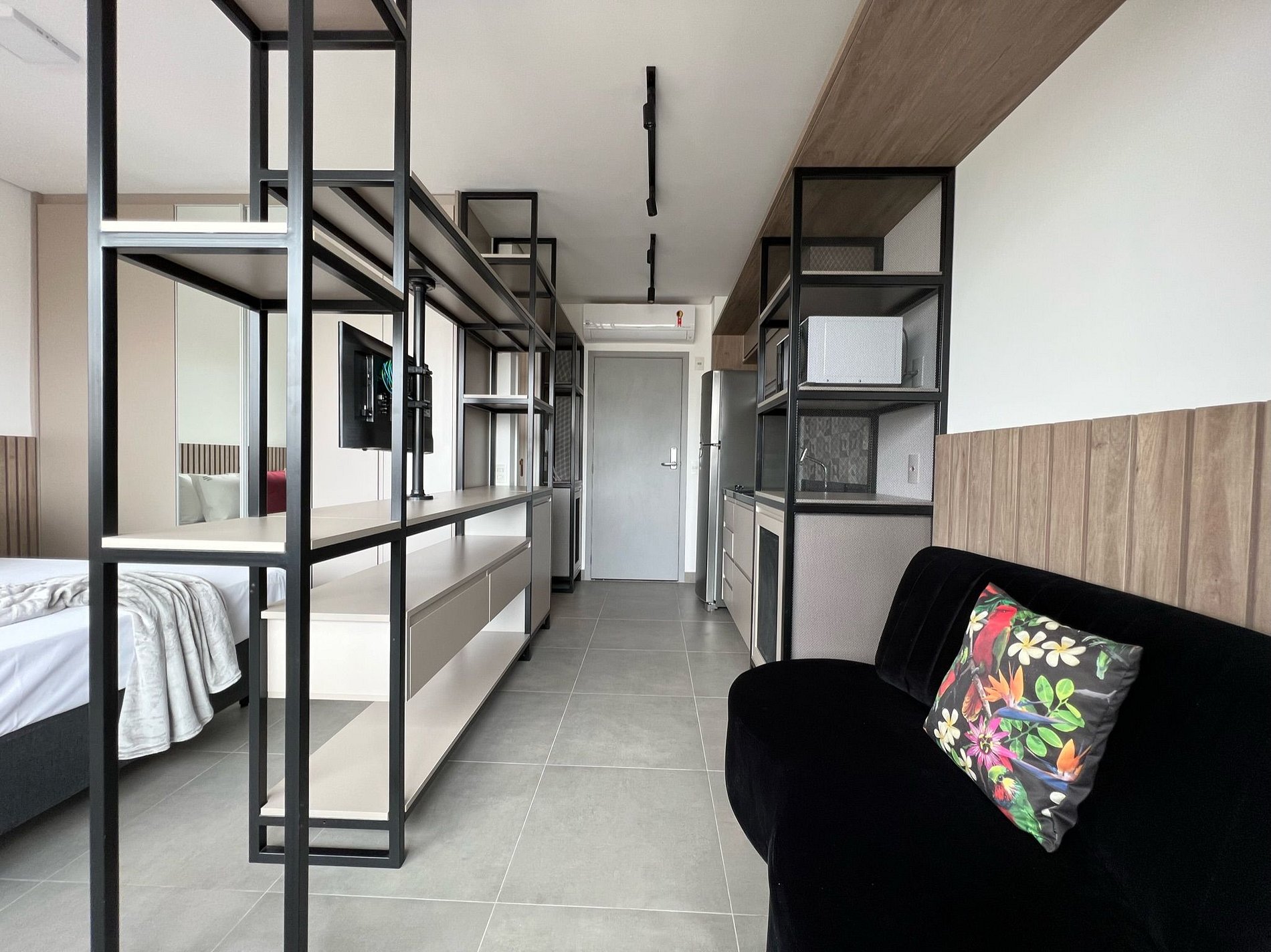 O studio com móveis sob medida é muito bem decorado na estilo industrial, nas cores cinza, preto e com elementos em madeira trazem um ar de sofisticação e modernidade, sua varanda estendida e janelas grandes o deixa amplo e com uma vista alta para dar luminosidade ao apartamento, o armário de 6 portas com espelho ao lado da cama ajuda a dar mais amplitude ao quarto.