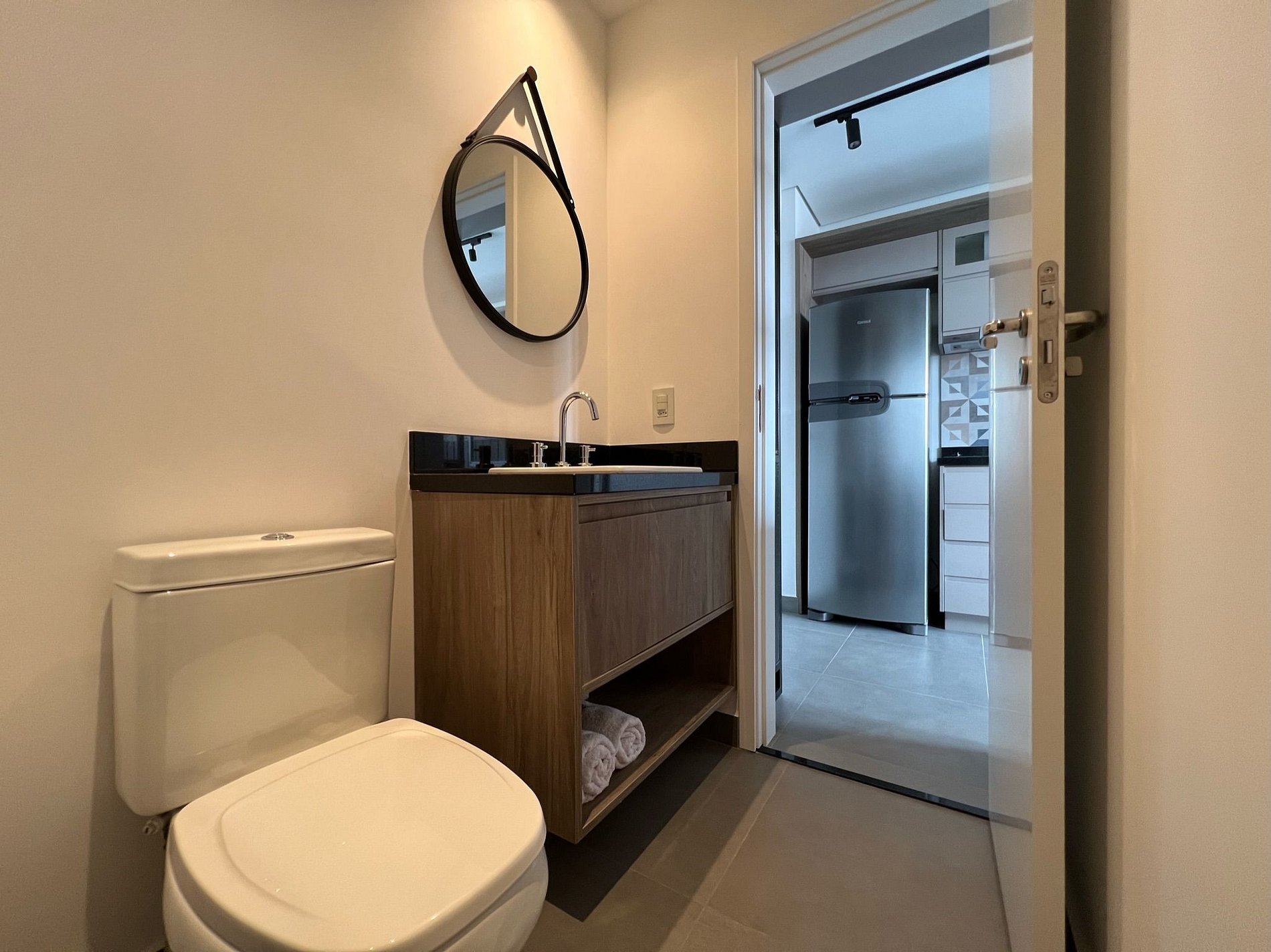 Com gavetas e prateleiras de sobra tem bastante espaço para organizar suas coisas, além de uma cozinha com geladeira, fogão por indução, micro-ondas, televisão em frente a cama de casal, o banheiro é recém reformado com pia de mármore seguindo o estilo e as cores do apartamento, tudo para você ficar aconchegado e relaxar em um dos bairros mais chiques da cidade de São Paulo.