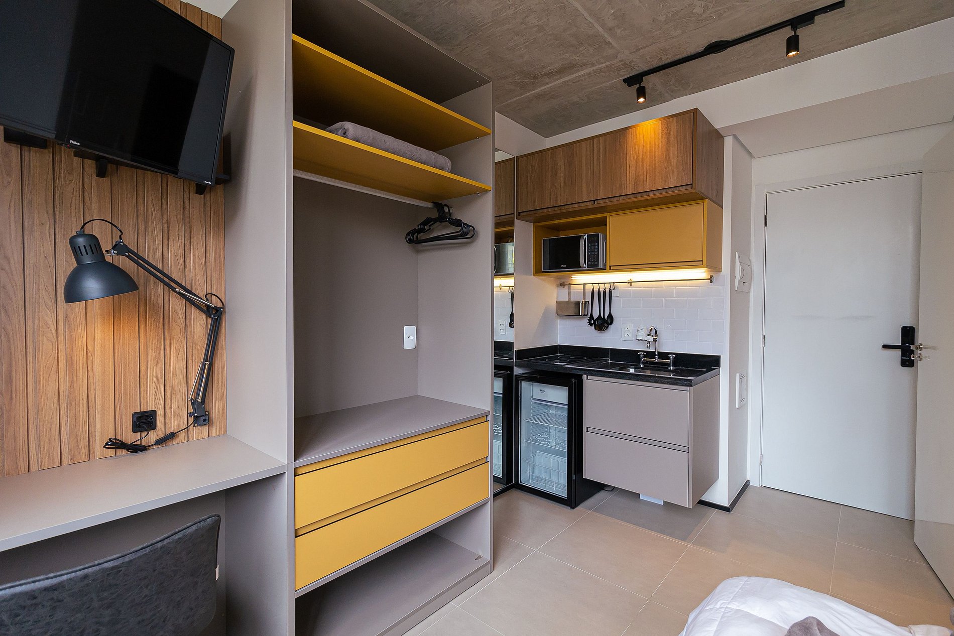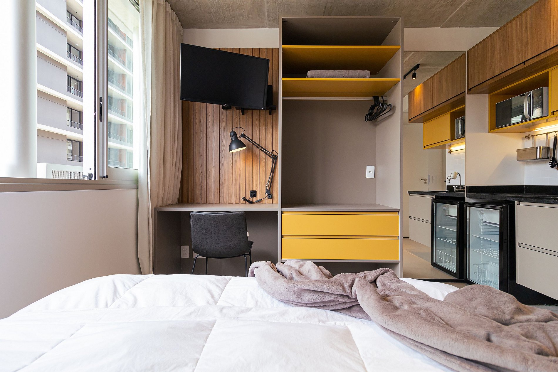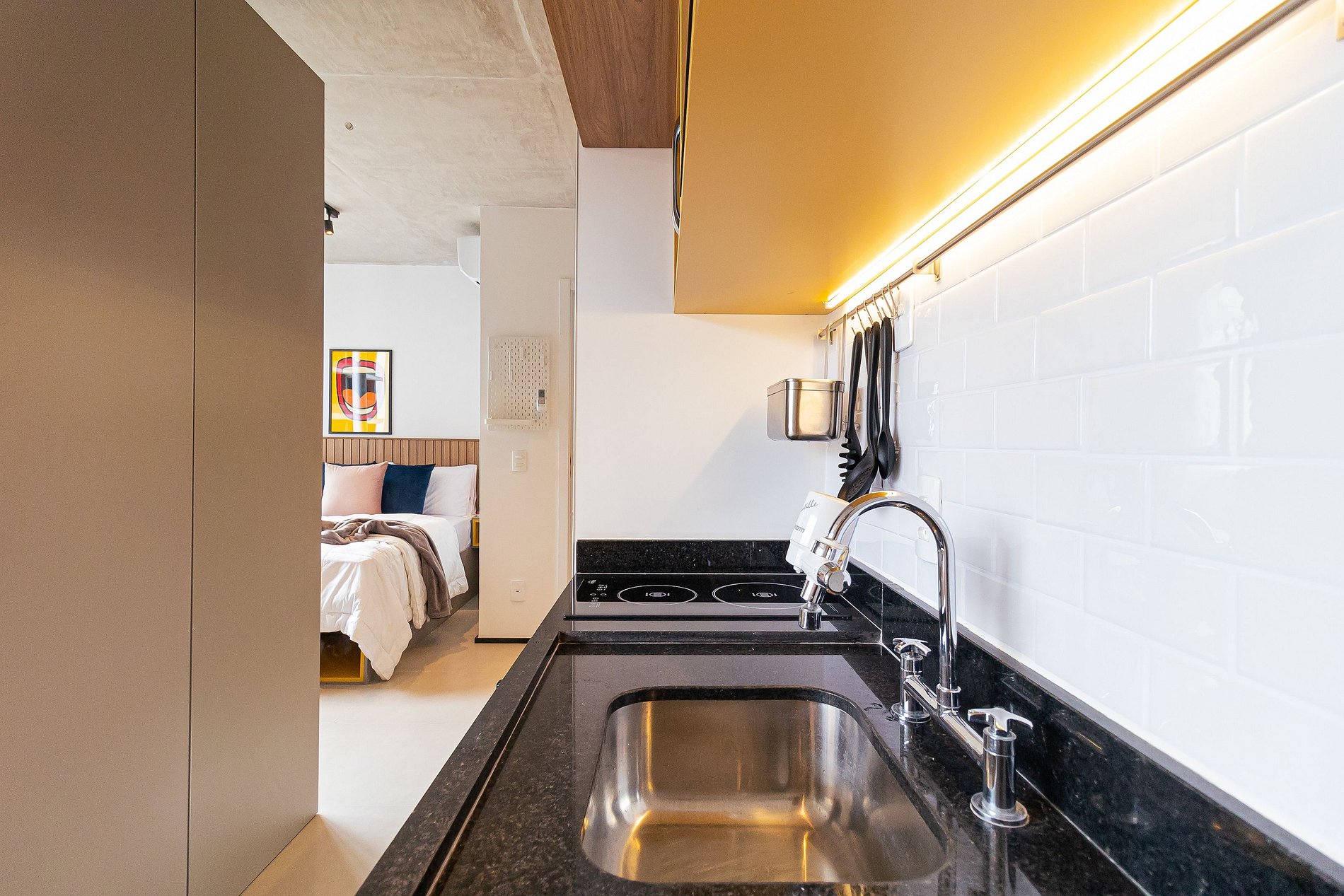 Lindo estúdio na Frei Caneca, seu espaço é bem aproveitado e iluminado, possui spots de luz e luz de sanca no armário da cozinha que dão um toque moderno à acomodação, possui televisão, wifi, frigobar, filtro de água, fogão por indução, utensílios de cozinha, micro-ondas, ar-condicionado, cama queen-size e espelho de corpo inteiro que traz amplitude ao apartamento.