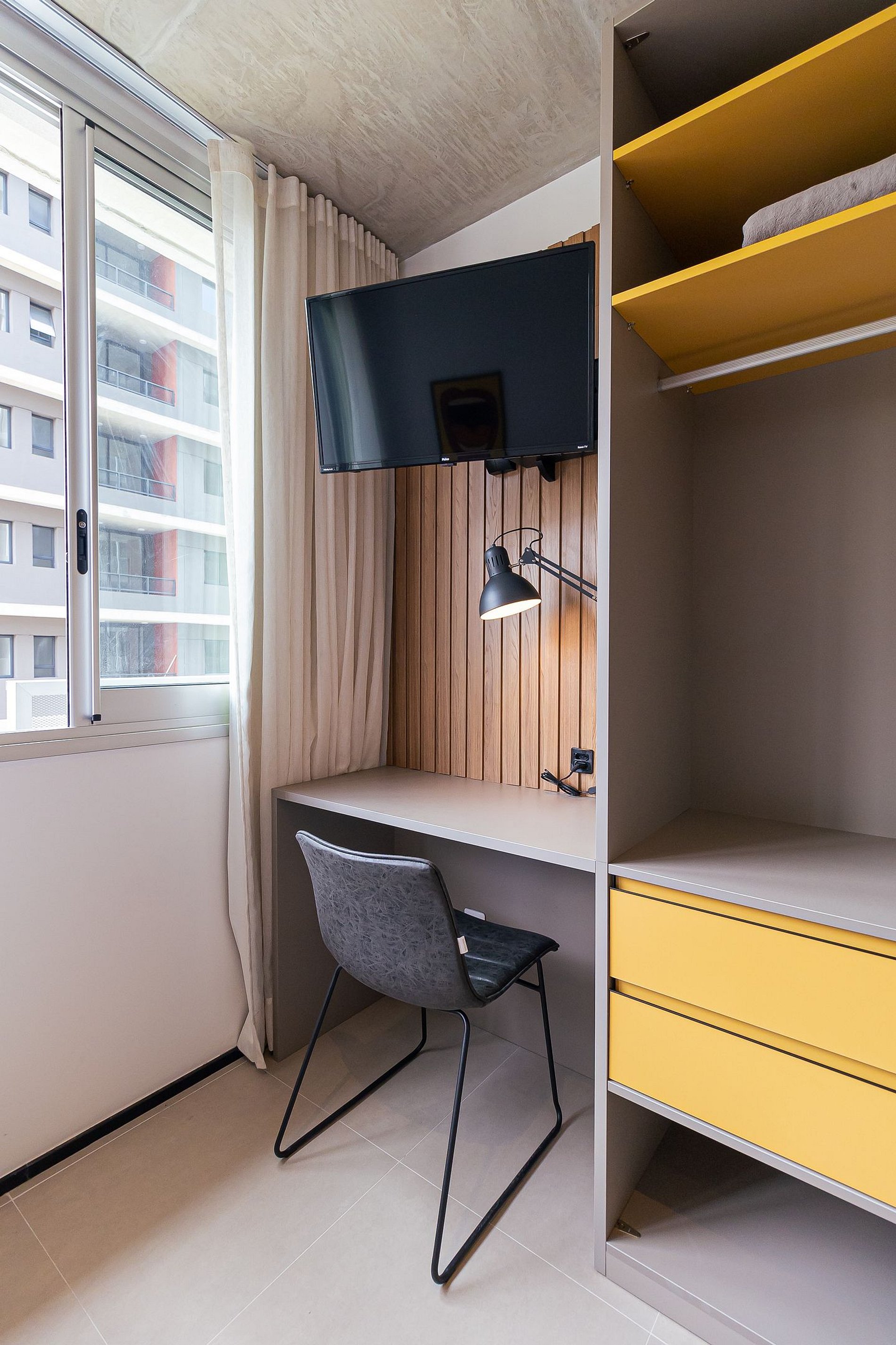Possui também um espaço na cobertura com cadeiras para tomar sol e chuveiro, piscina, área com redes, co-working e espaço pet.