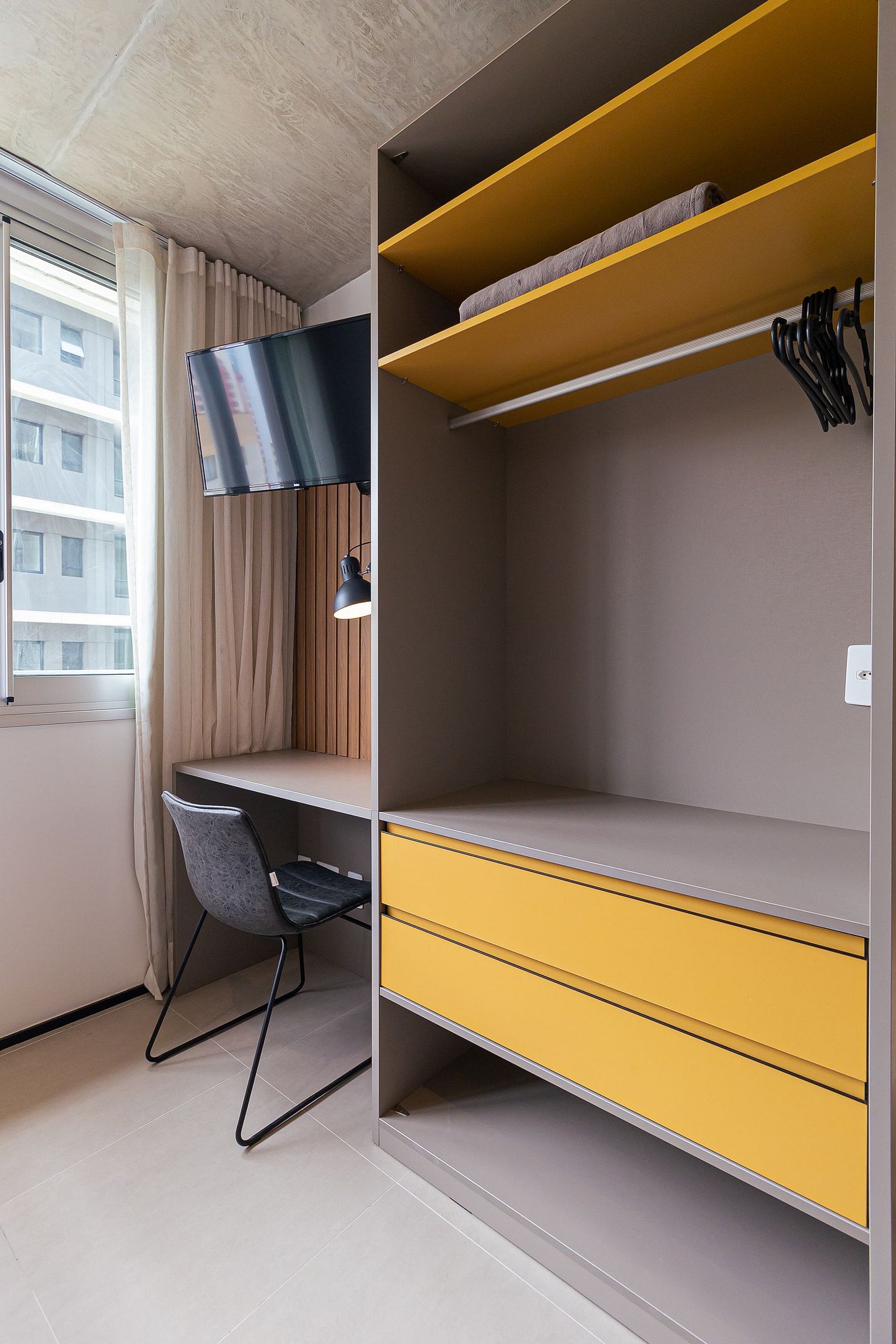 Possui também um espaço na cobertura com cadeiras para tomar sol e chuveiro, piscina, área com redes, co-working e espaço pet.