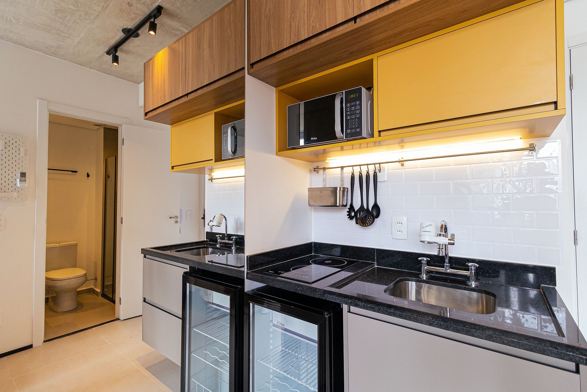 Lindo estúdio na Frei Caneca, seu espaço é bem aproveitado e iluminado, possui spots de luz e luz de sanca no armário da cozinha que dão um toque moderno à acomodação, possui televisão, wifi, frigobar, filtro de água, fogão por indução, utensílios de cozinha, micro-ondas, ar-condicionado, cama queen-size e espelho de corpo inteiro que traz amplitude ao apartamento.