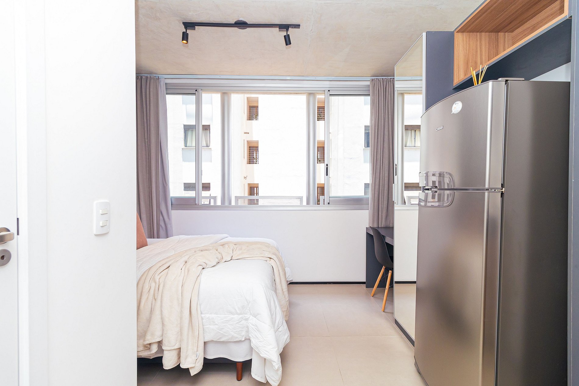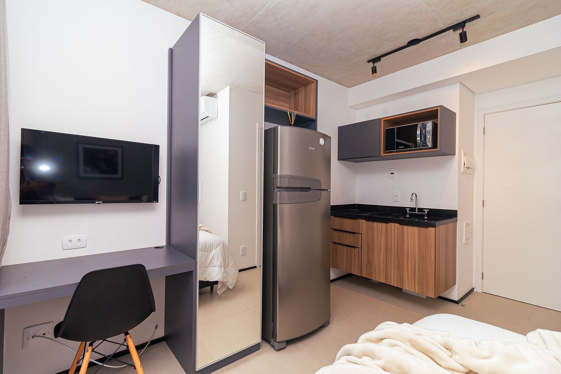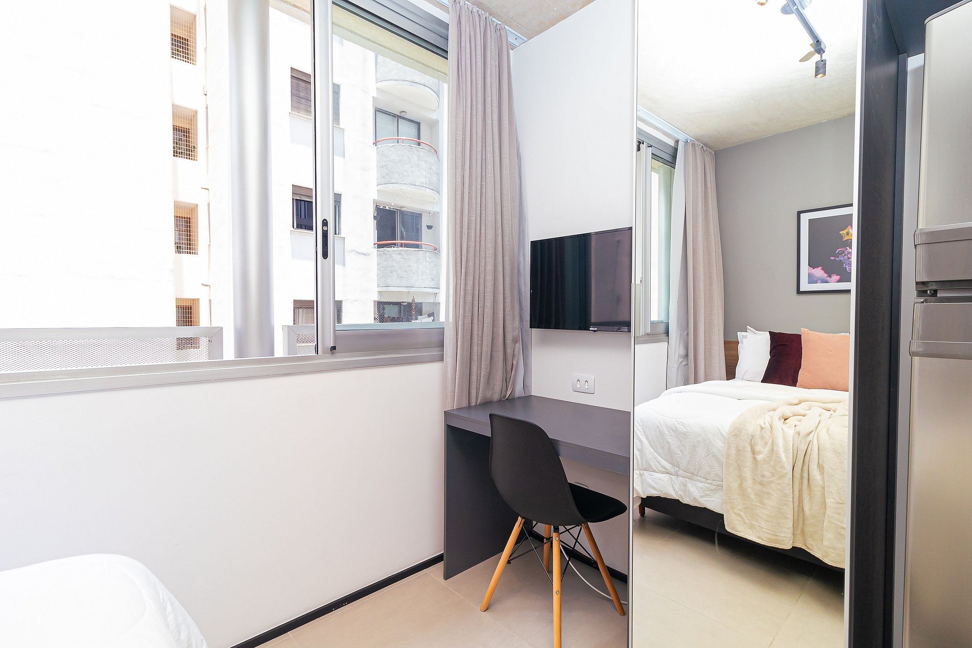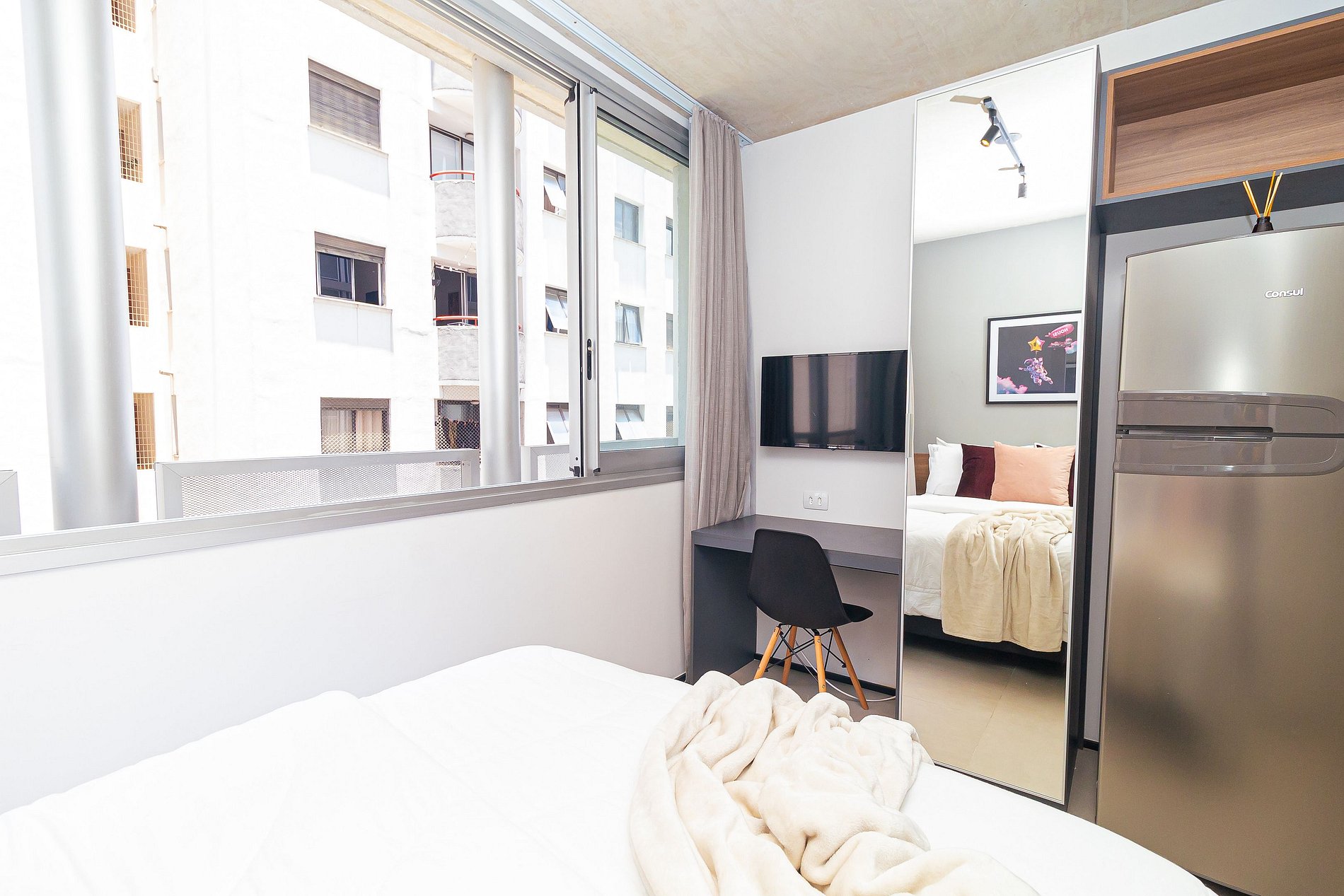 Lindo estúdio na Frei Caneca, seu espaço é bem aproveitado e iluminado , possui televisão, wifi, geladeira, fogão por indução, utensílios de cozinha, micro-ondas, ar-condicionado, cama casal e espelho de corpo inteiro que traz amplitude ao apartamento.