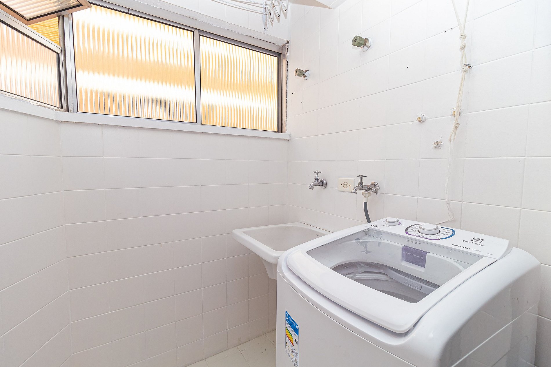 A ampla sala de estar conta com mesa para quatro pessoas, cristaleira de madeira branca e vidro, sofá e televisão, a cozinha completa em cor azul-esverdeado conta com geladeira, filtro, micro-ondas, fogão 4 bocas com forno e utensílios para o preparo das refeições, a lavanderia tem uma maquina de lavar e ainda tem uma varanda com vista para a rua de trás do edifício.