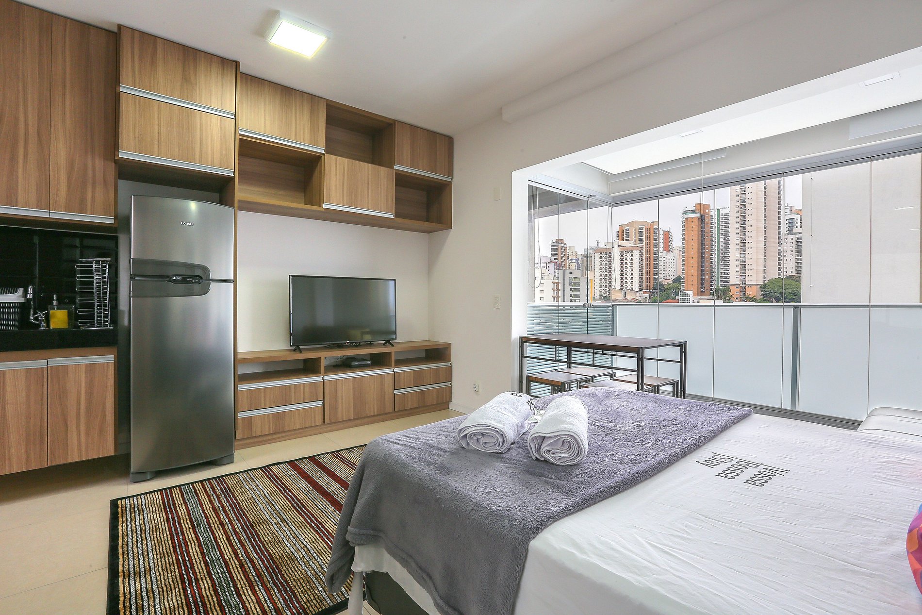 Estudio espaçoso e completo ao lado do Allianz Parque, possui garagem, portaria 24h, varanda estendida, televisão, wi-fi e utensílios de cozinha, cama queen-size e ar-condicionado para seu aconchego.