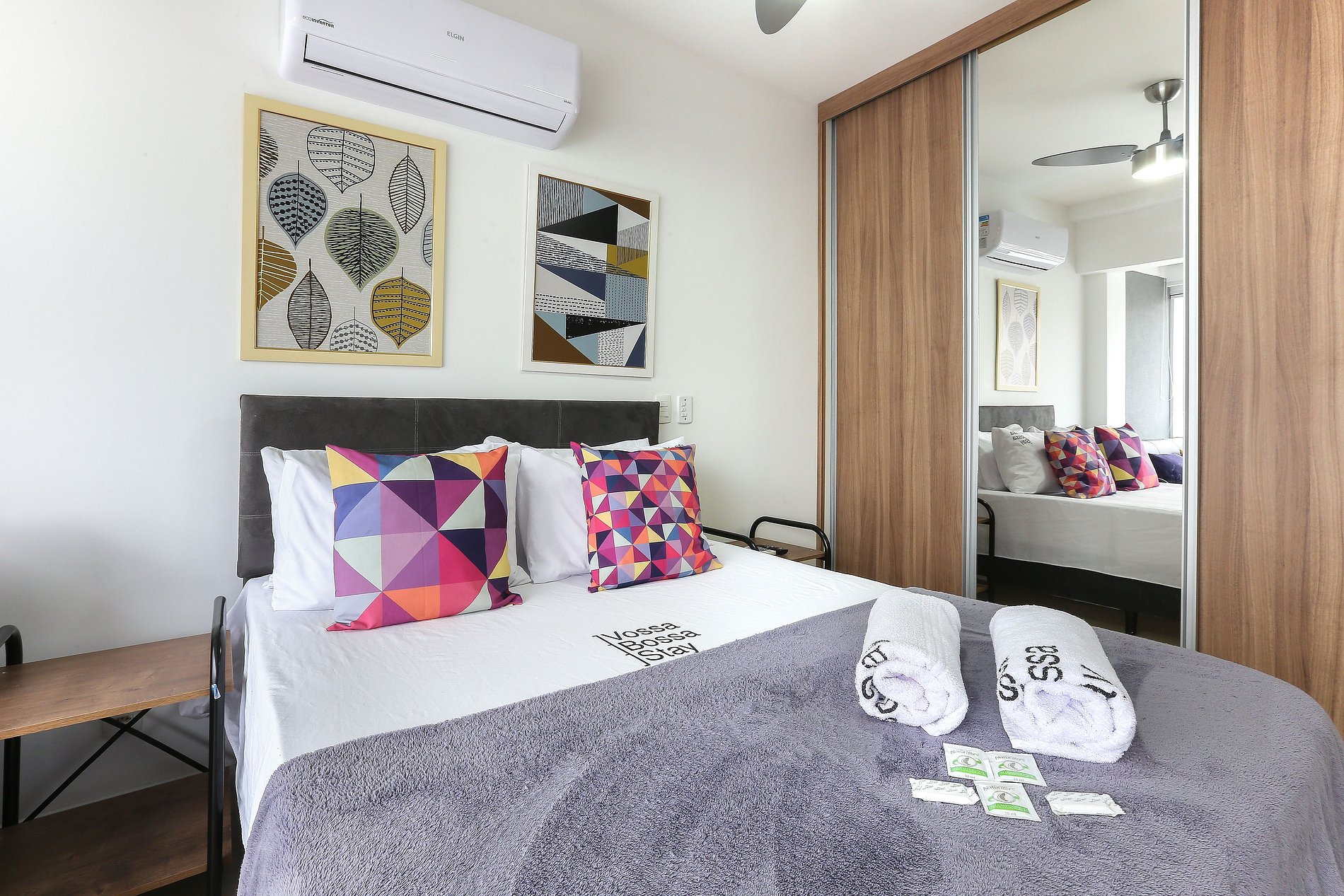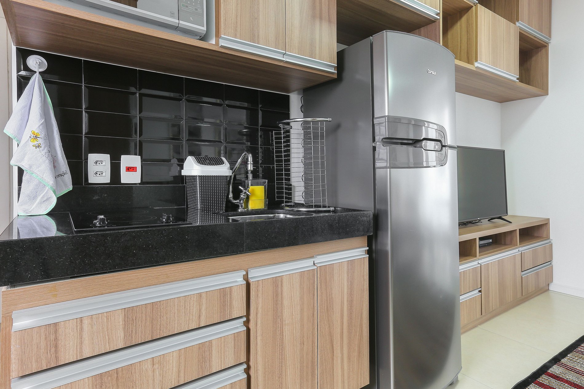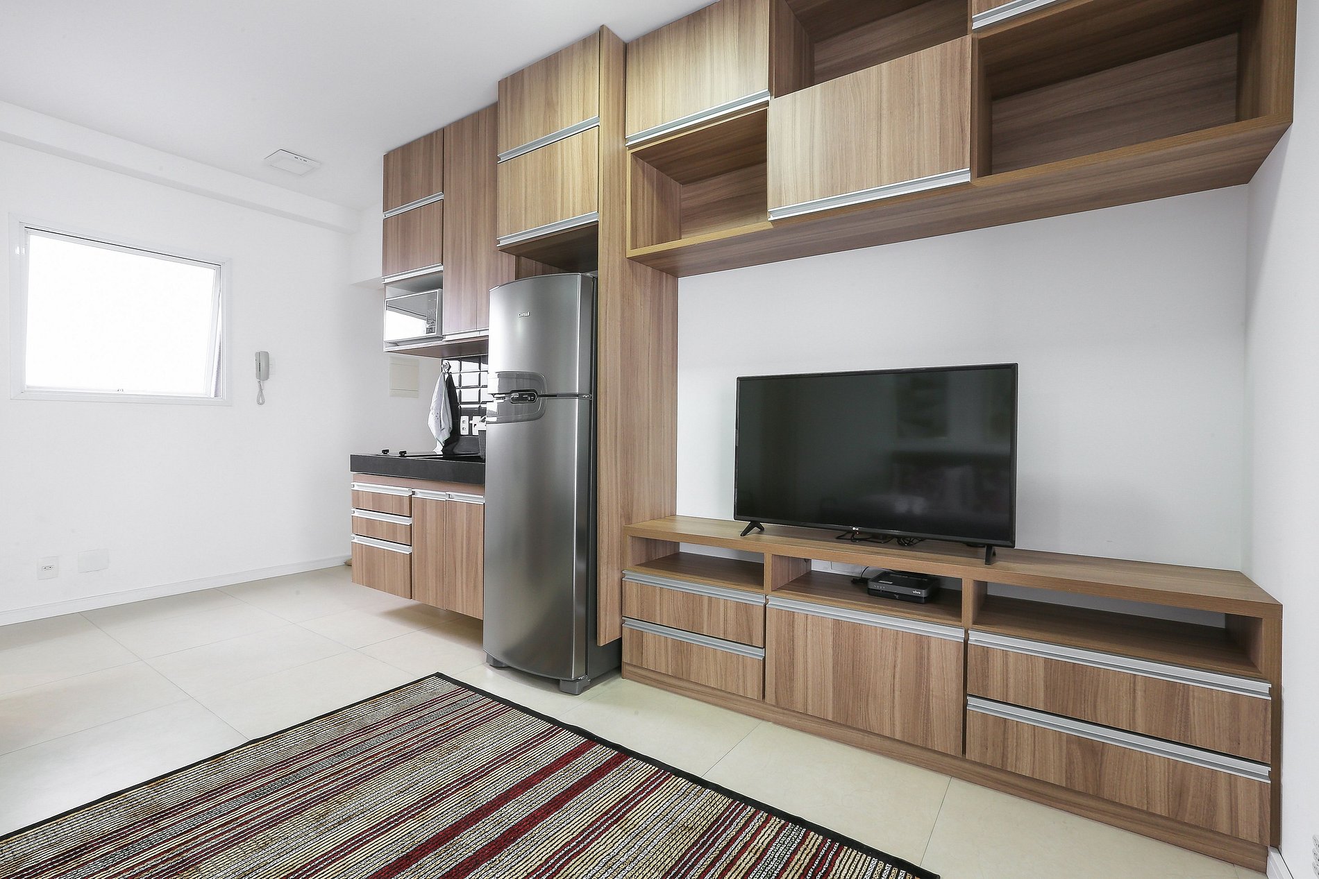 Acomodação completa para sua estadia, o espaço é moderno, bem aproveitado e decorado nas cores cinza e branco com móveis em madeira para você se hospedar com conforto e elegância na rua Turiassú ao lado do Allianz Parque, com geladeira, fogão por indução, microondas, utensílios de cozinha, ar-condicionado, cama queen-size, wi-fi e televisão.
