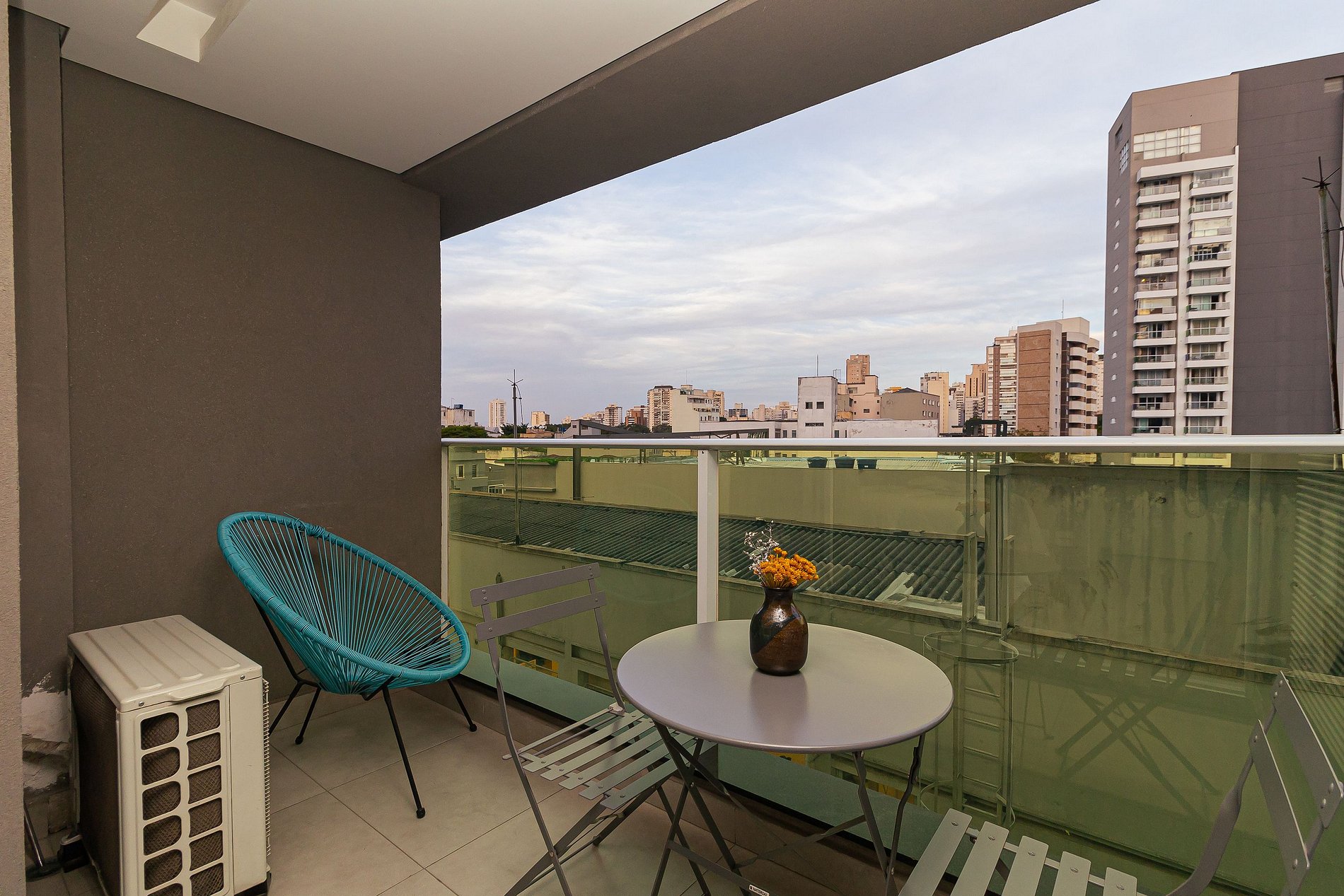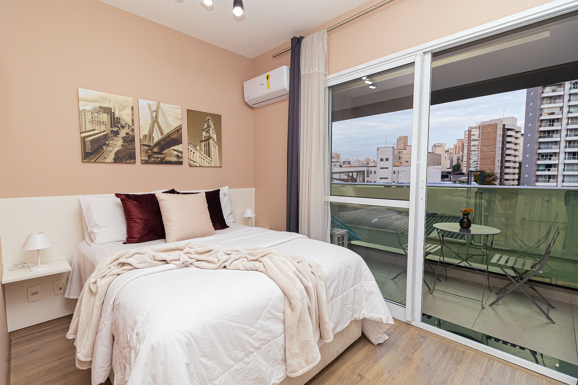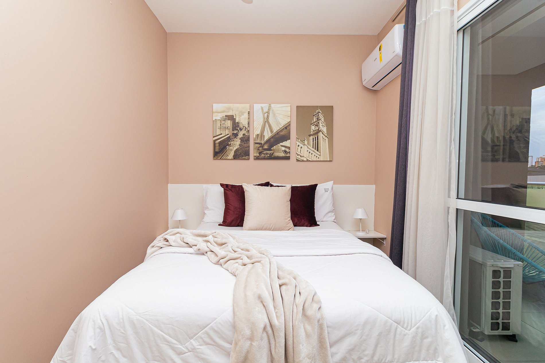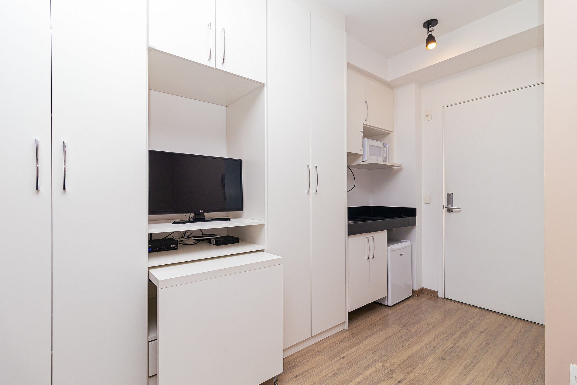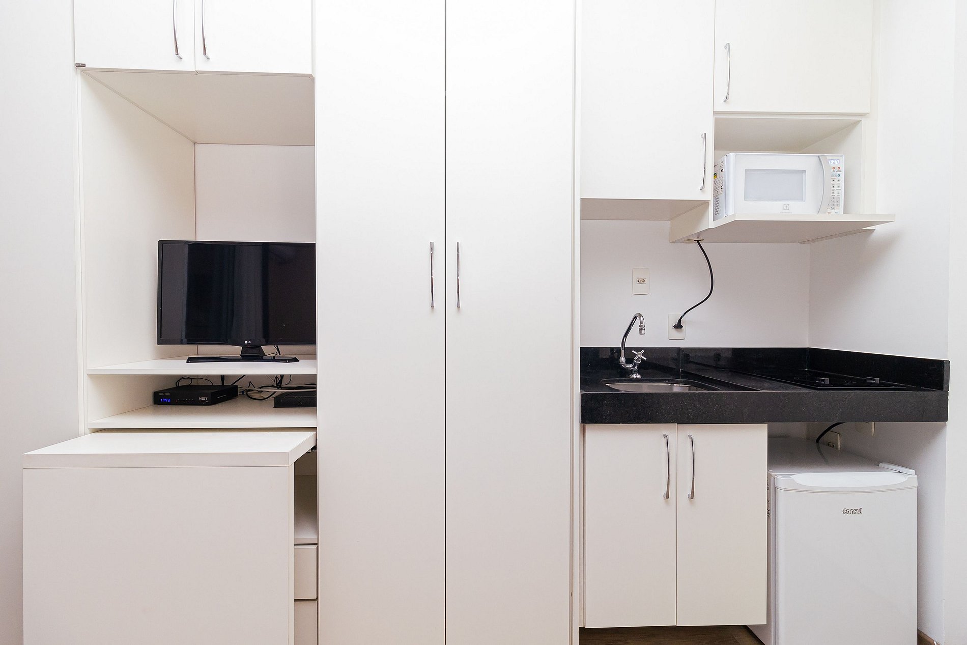 Acomodação completa para sua estadia, o espaço é moderno, bem aproveitado e decorado nas cores cinza e branco para você se hospedar com conforto e elegância na rua Turiassú ao lado do Allianz Parque, com frigobar, fogão por indução, microondas, utensílios de cozinha, ar-condicionado, cama queen-size, wi-fi e televisão.