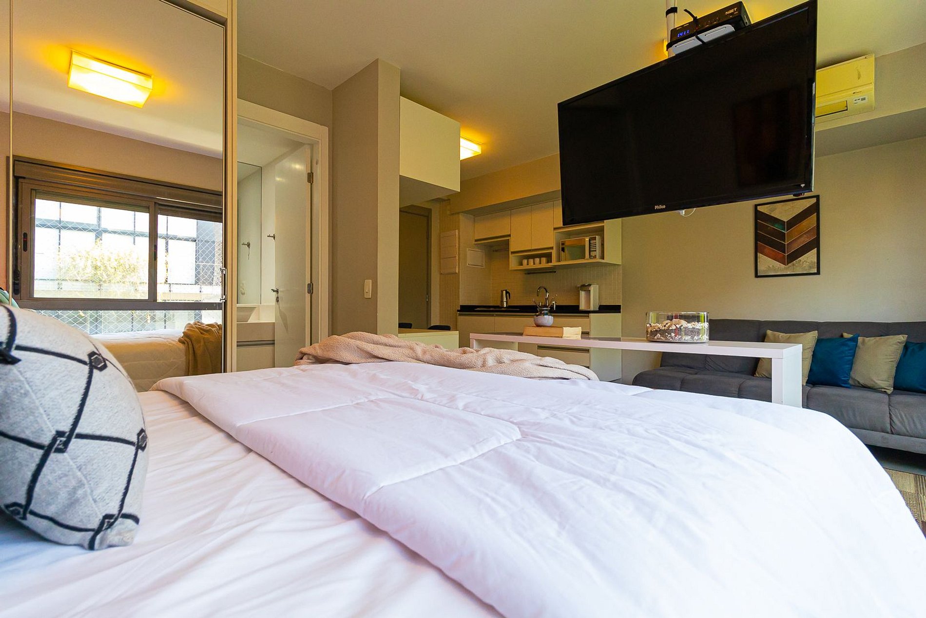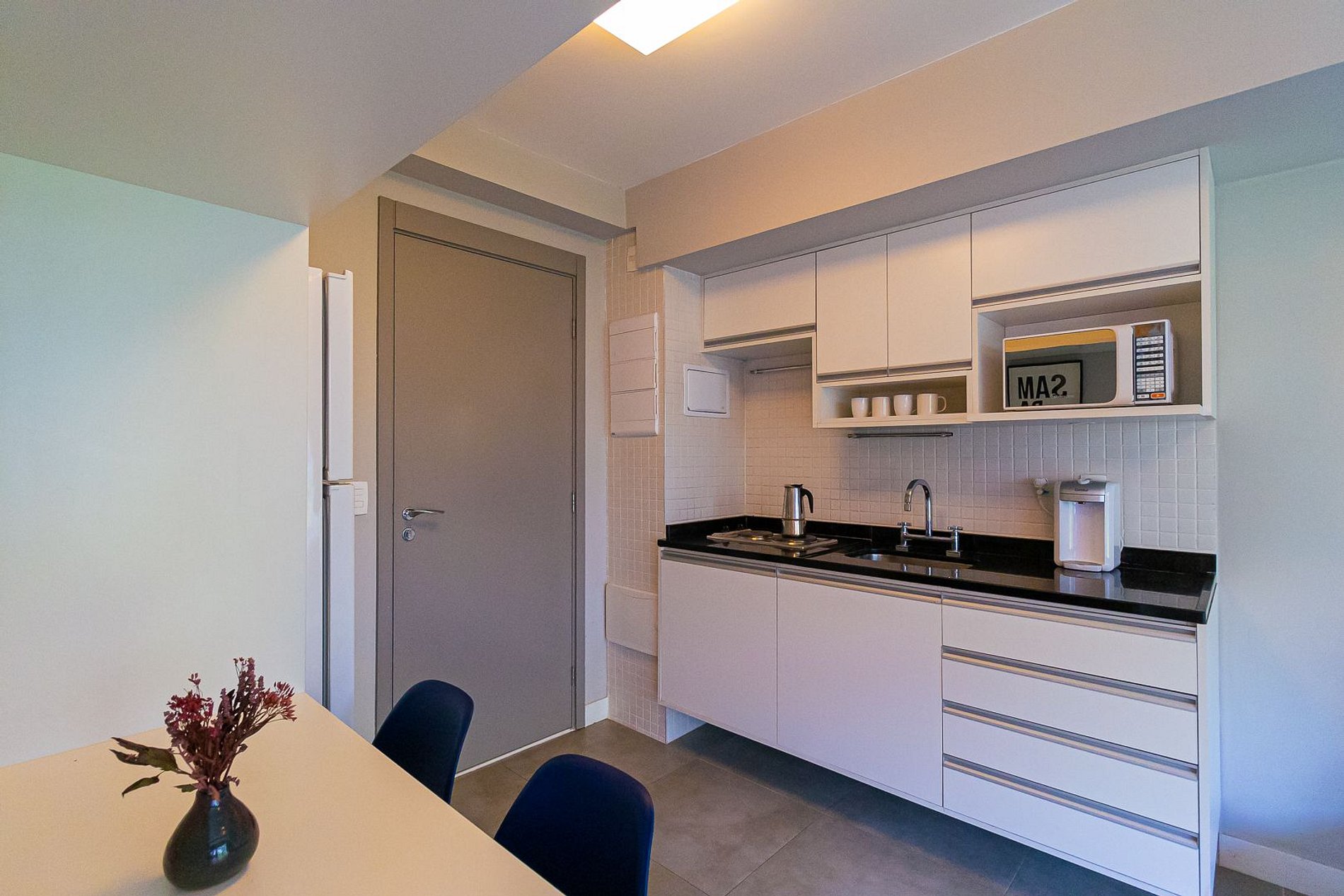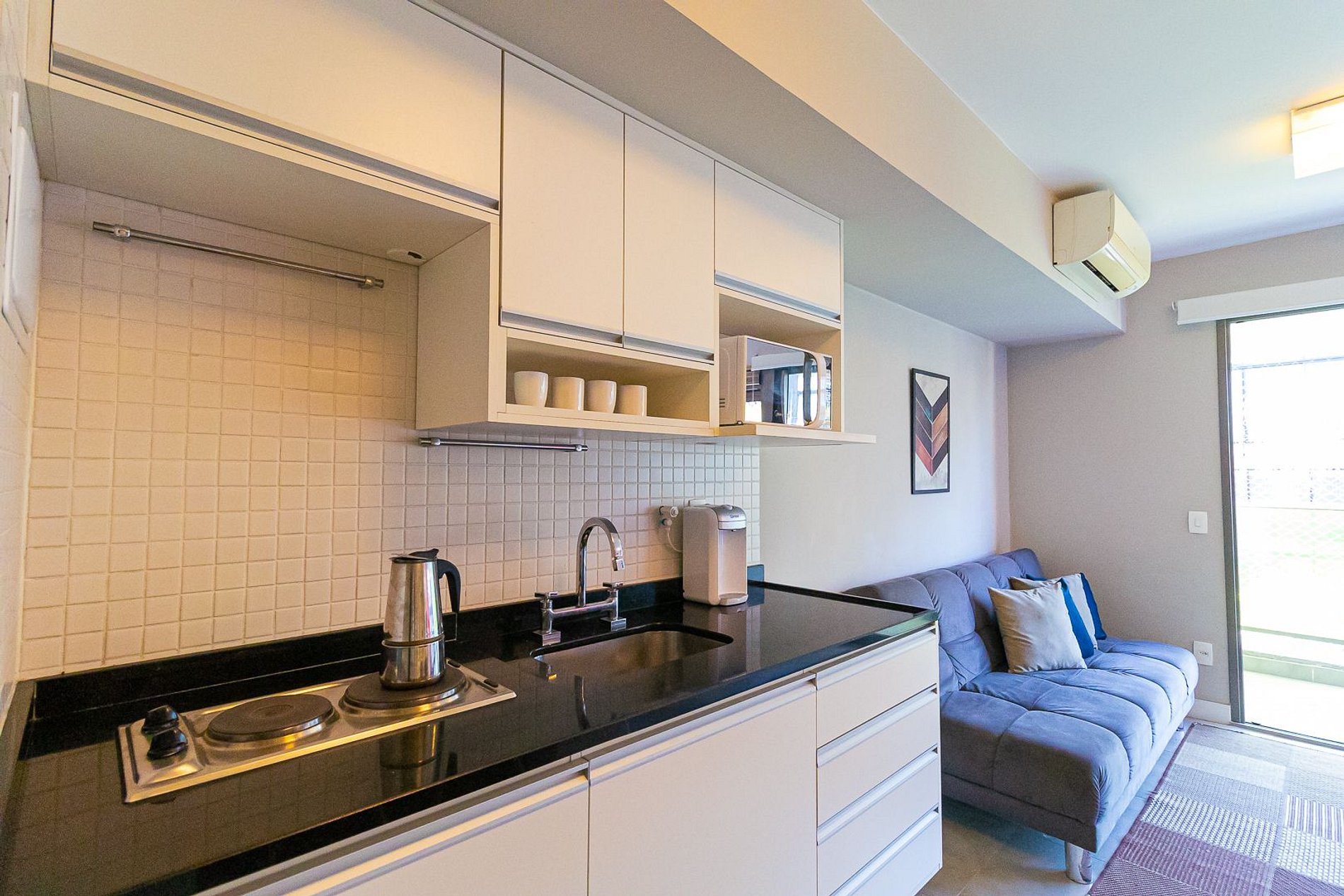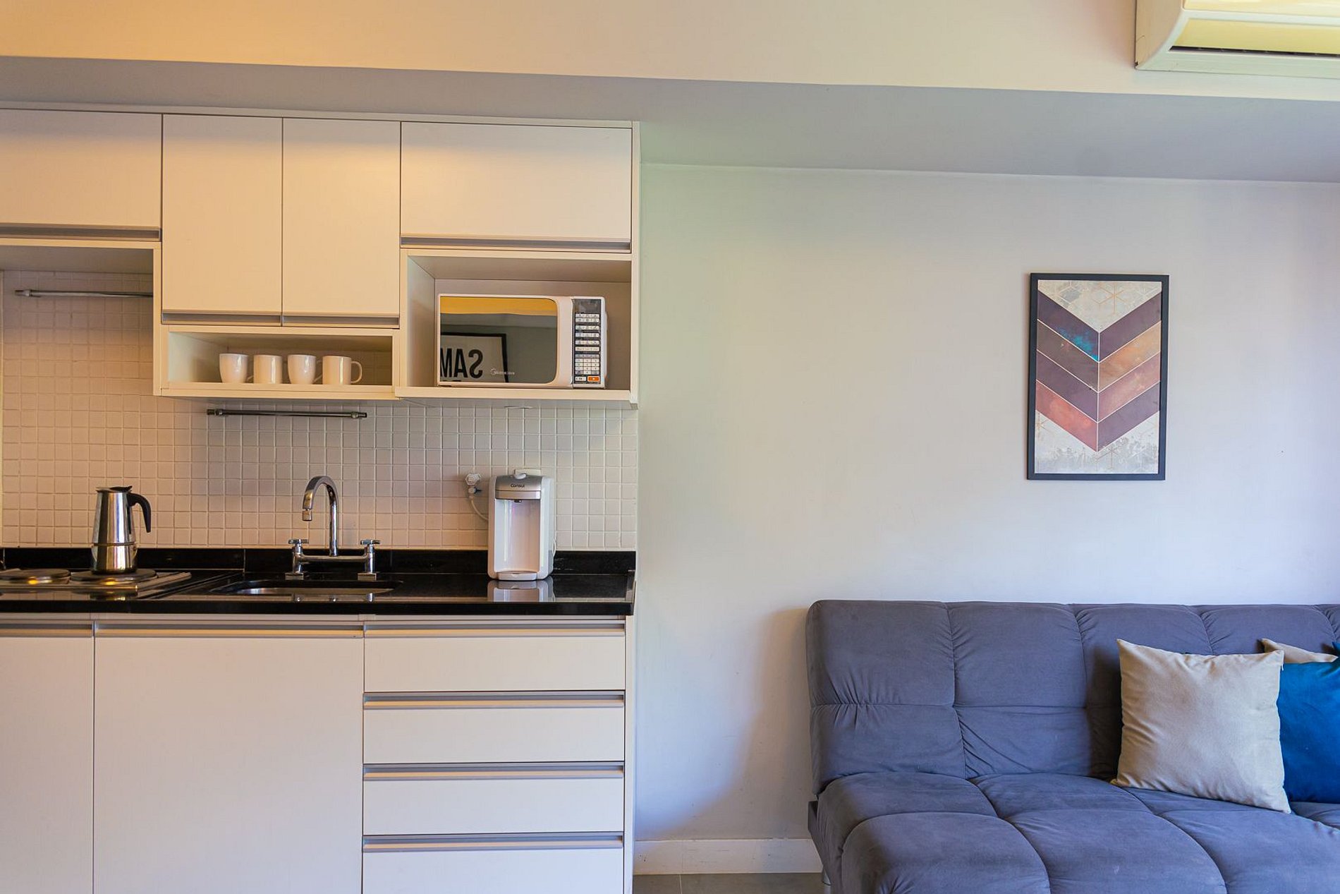 Com os móveis em madeira branca e um tom de limpeza e modernidade, possui uma TV com suporte no teto que gira 360 graus você pode assistir da cama queen-size, sofá-cama ou enquanto prepara uma refeição na cozinha completa que conta com fogão por indução, micro-ondas, filtro de água, geladeira, tábua, faqueiro, taças, canecas e utensílios.