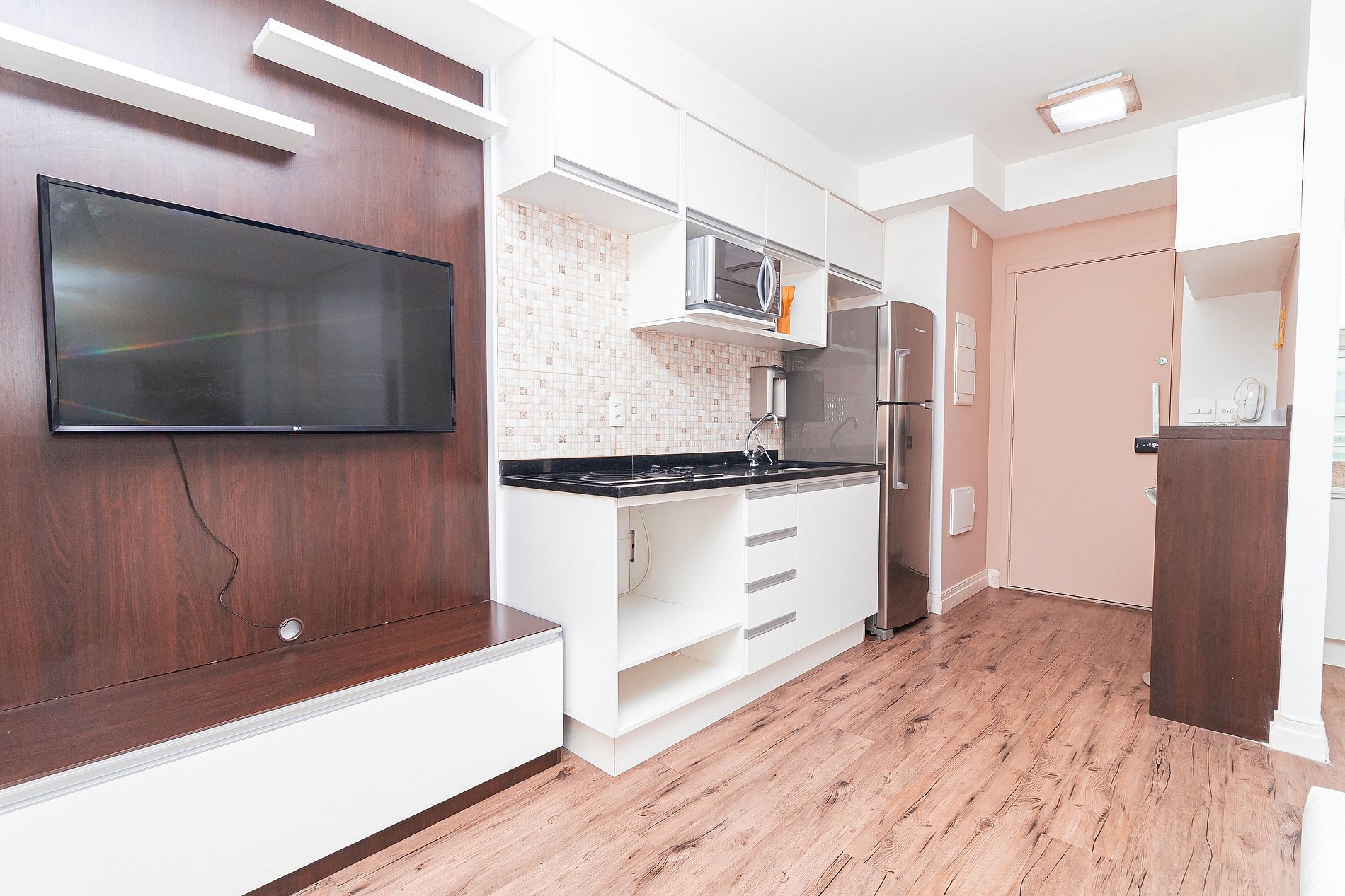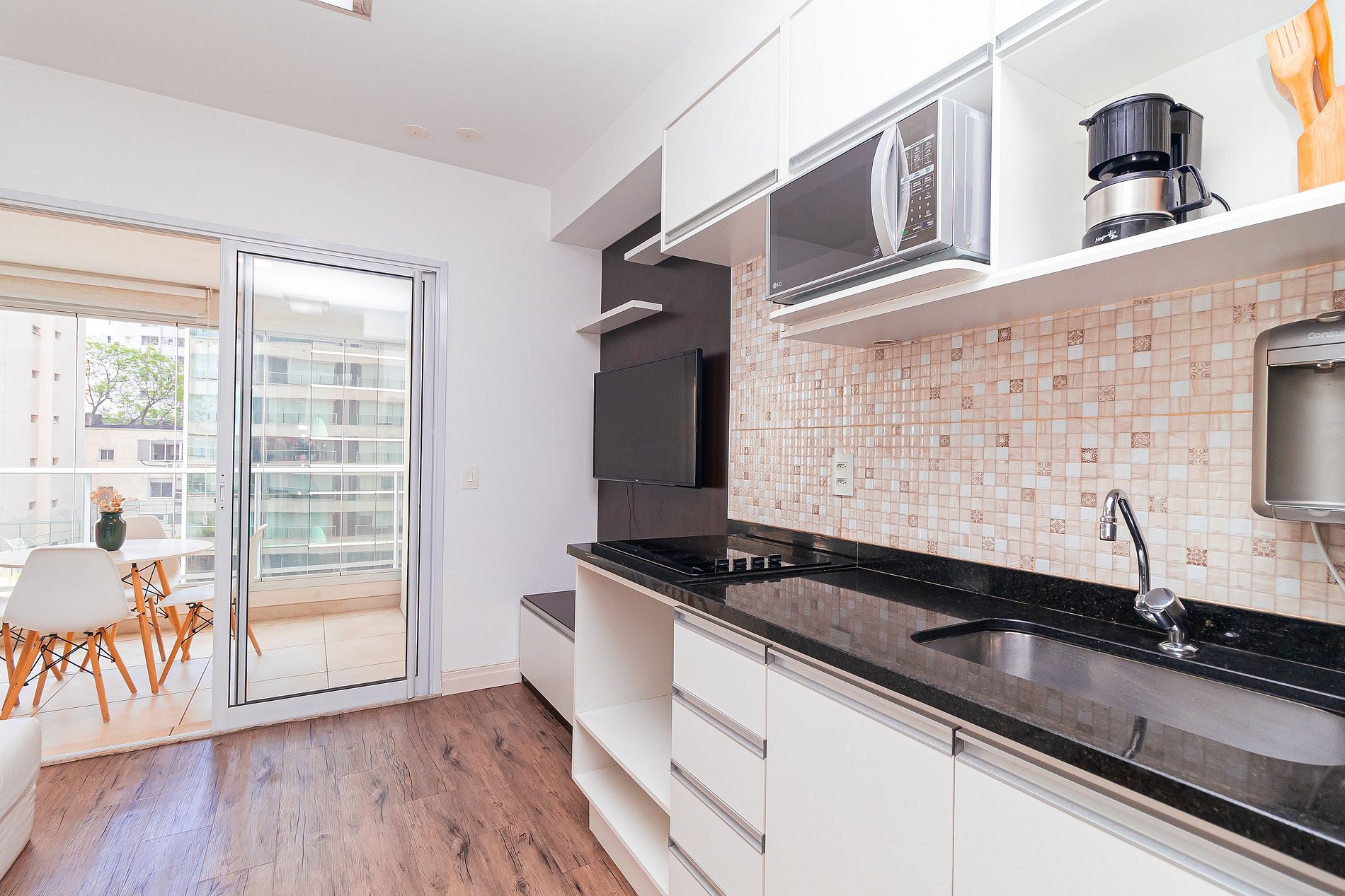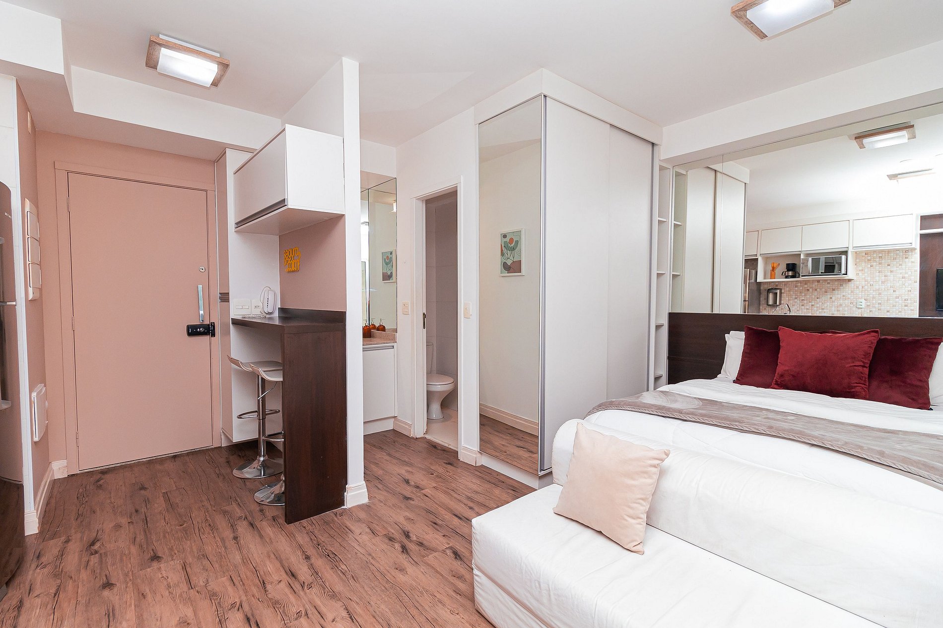 O estúdio integrado conta com quarto, banheiro, cozinha completa e uma varanda ampla e aconchegante, com vários toques especiais que fazem total diferença ao ambiente.