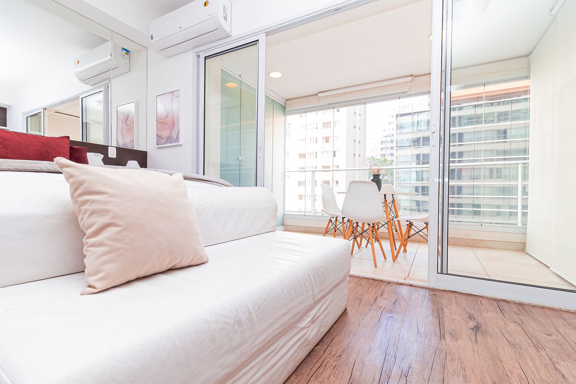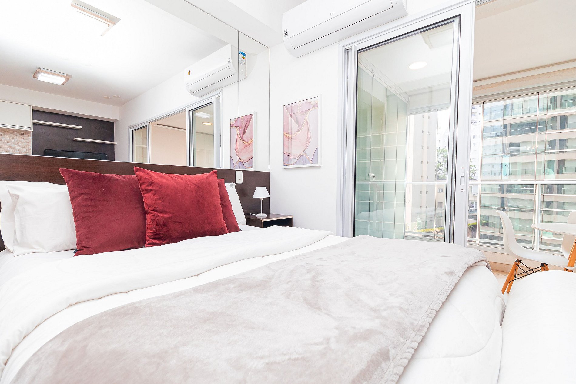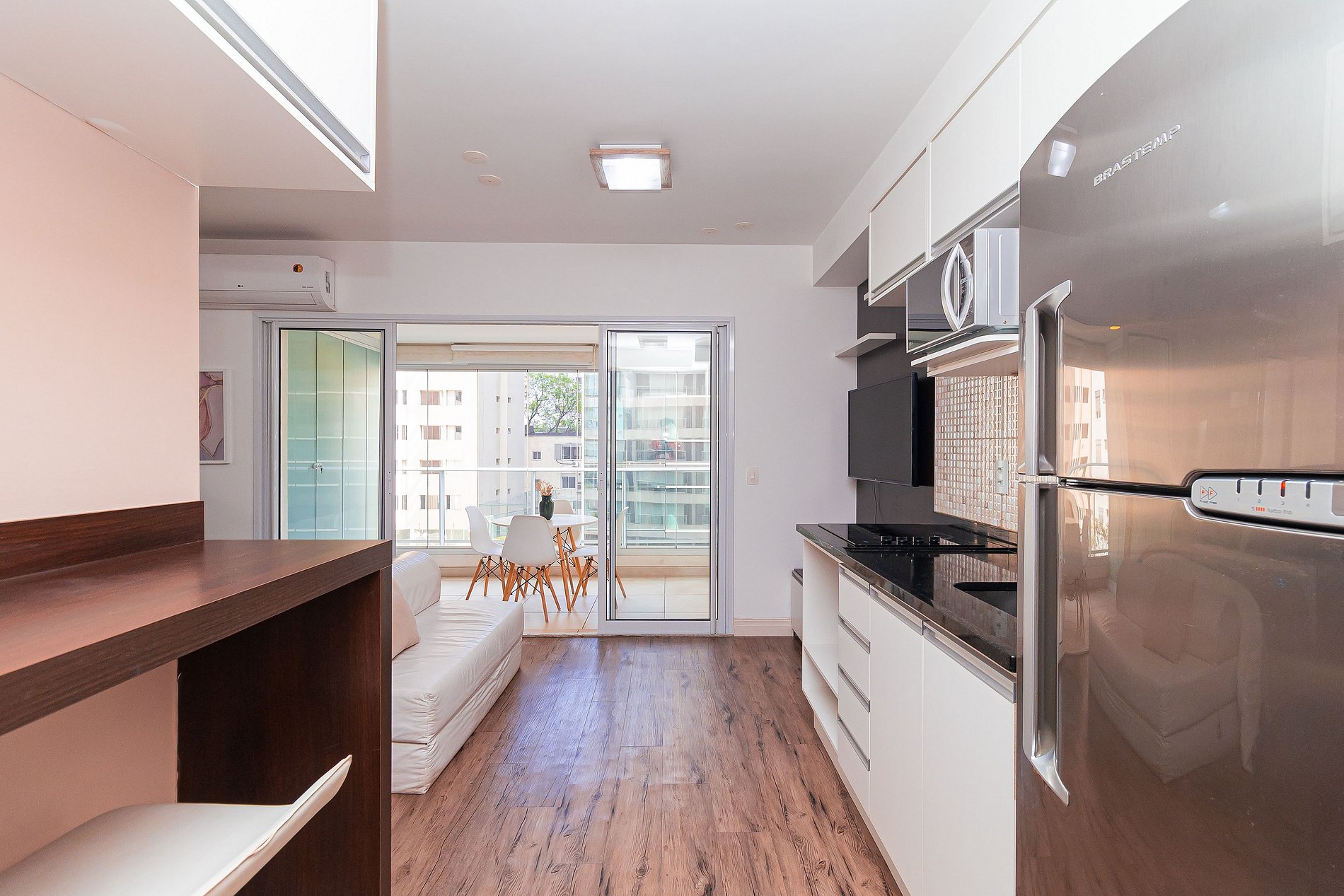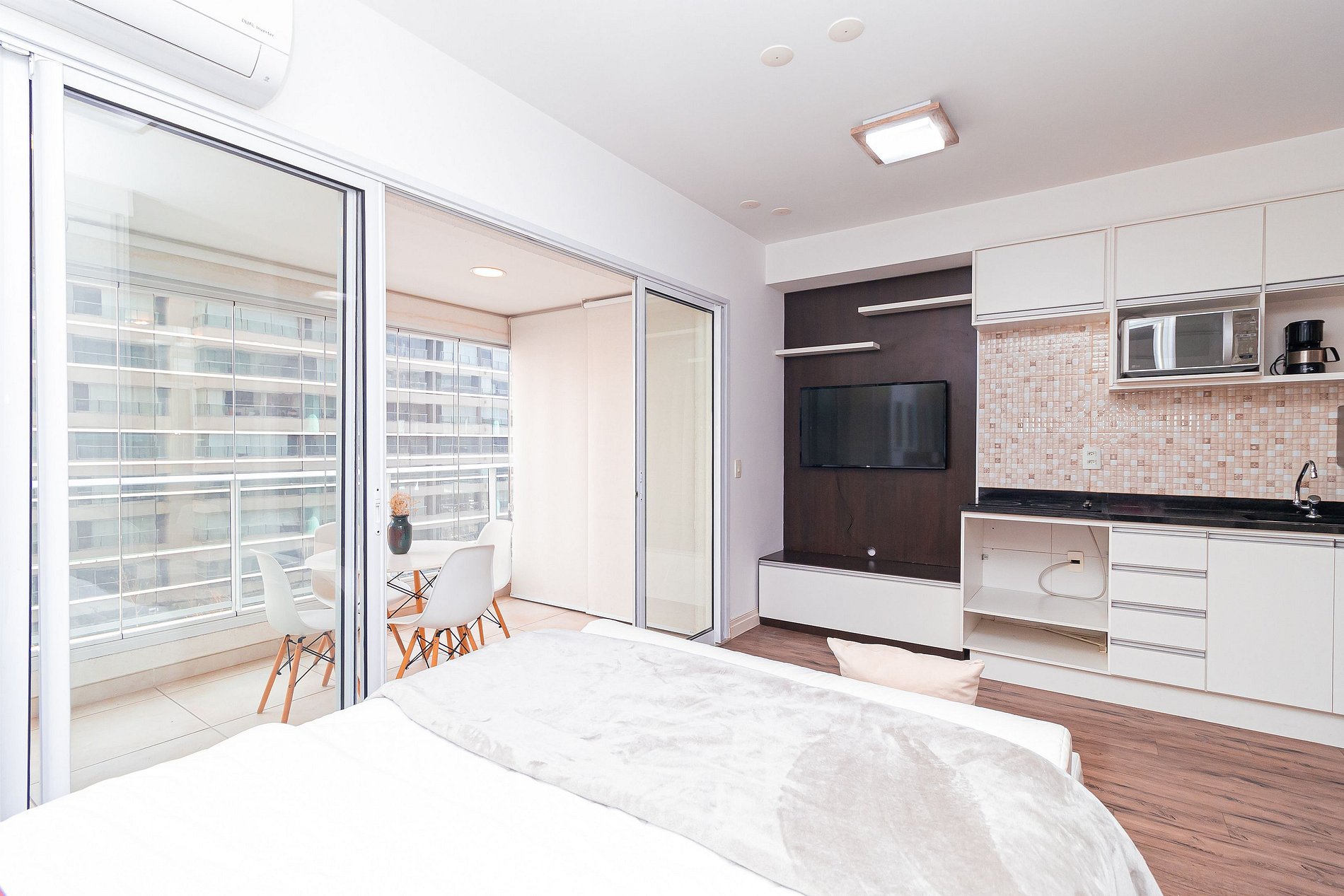 O mesmo conta com cozinha completa, varanda iluminada com área de jantar, e um espaço com TV, cama, sofá e AR CONDICIONADO.