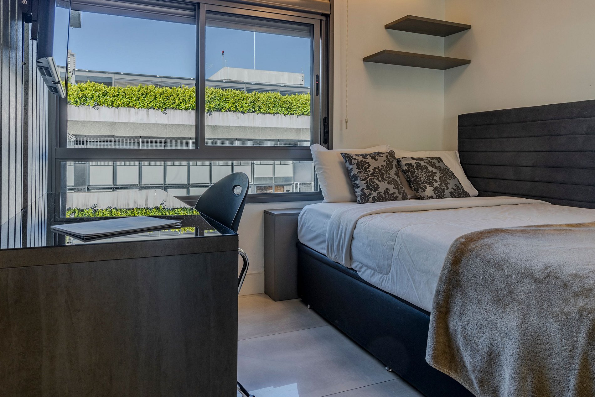 Layout inteligente, integrando quarto e sala em ambiente funcional e elegante.