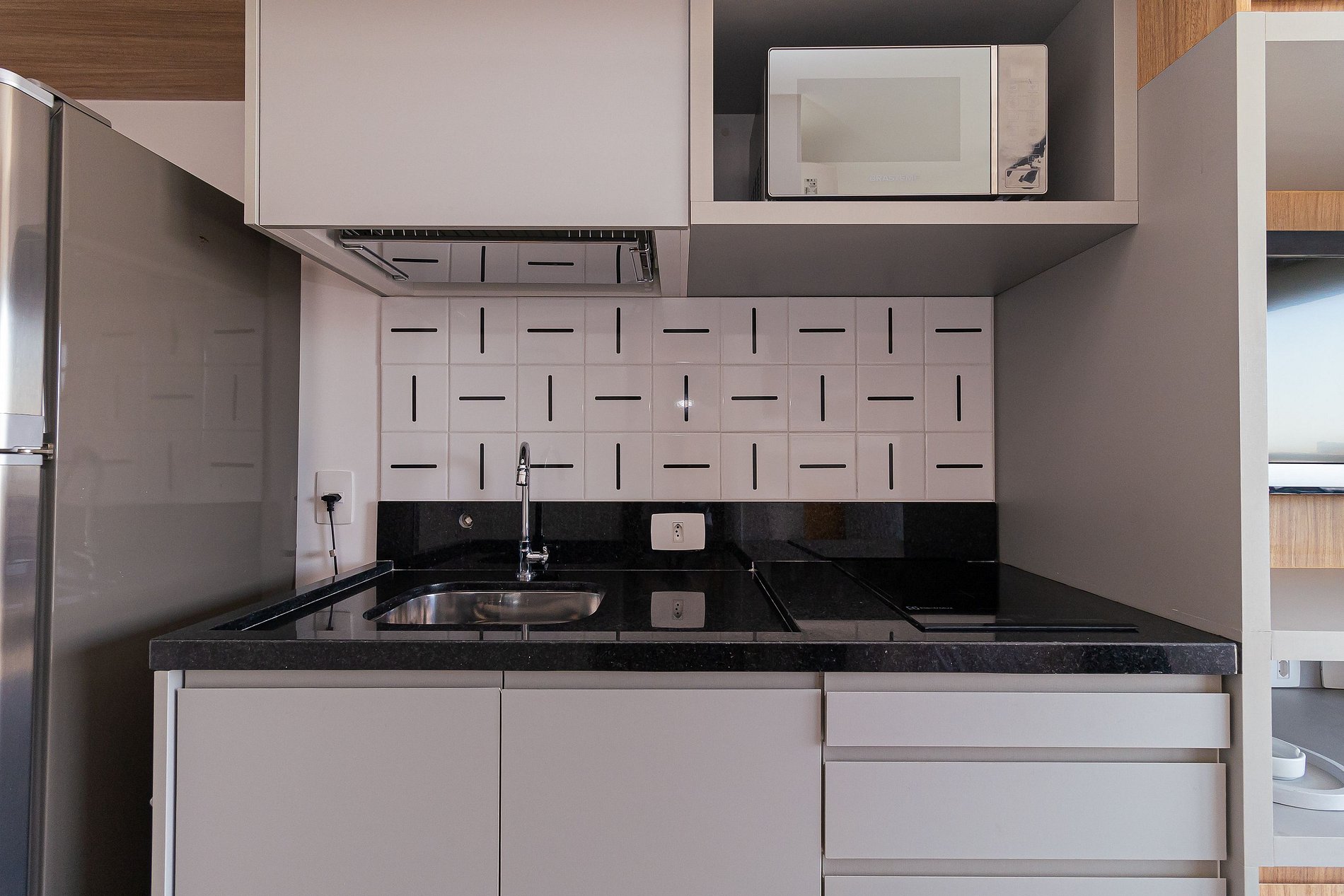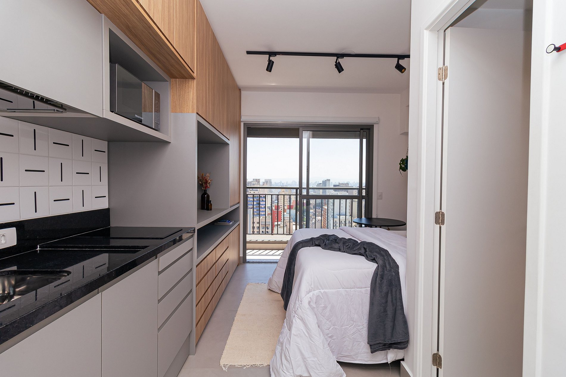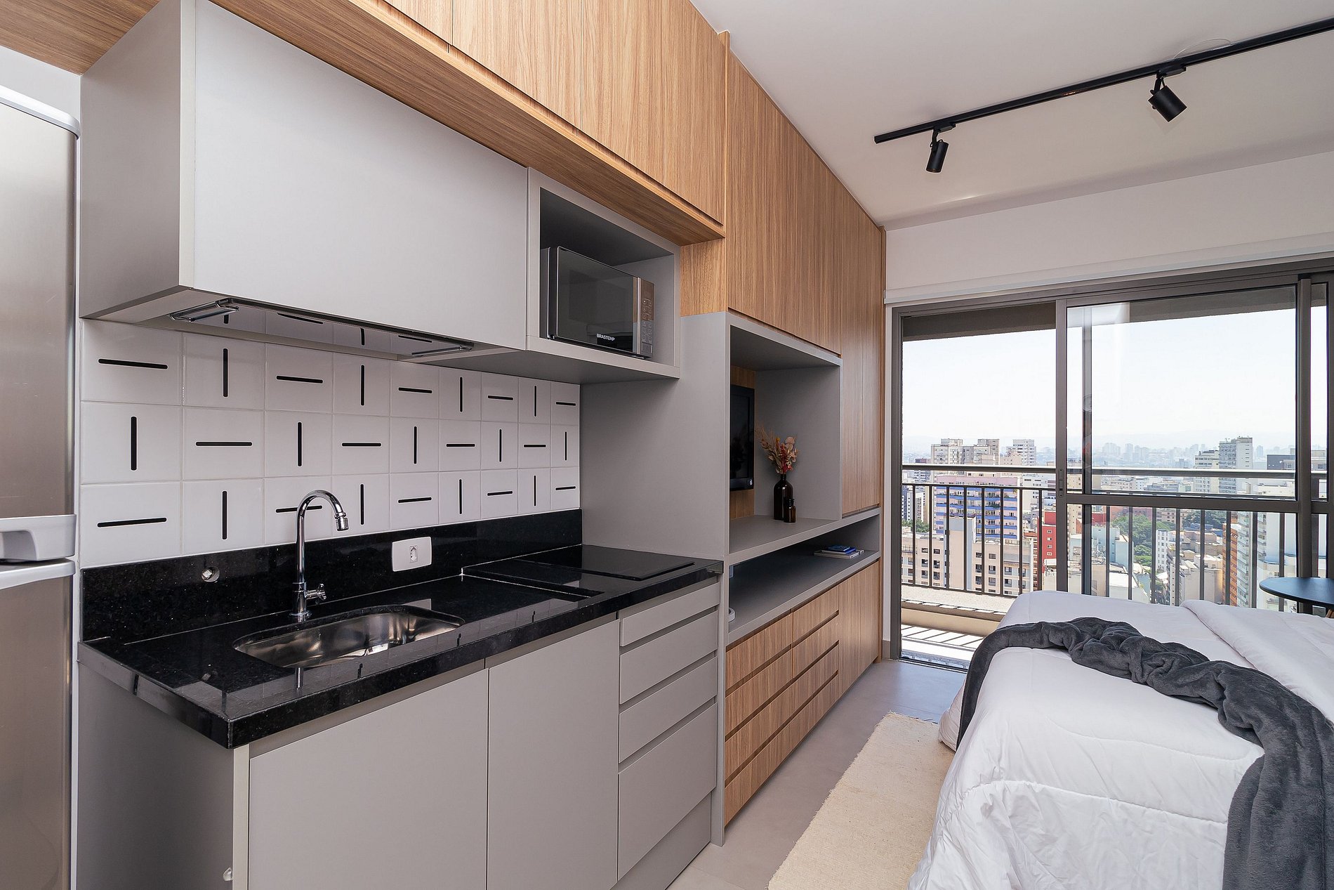 Além disso, o espaço foi projetado de forma compacta, mas que conecta e comporta todos os ambientes necessários e usuais que um estúdio completo necessida, como quarto, banheiro, cozinha e uma varanda com uma vista master pra relaxar, que adentra todo o ambiente, levando uma ótima luminosidade e ventilação natural pro mesmo.