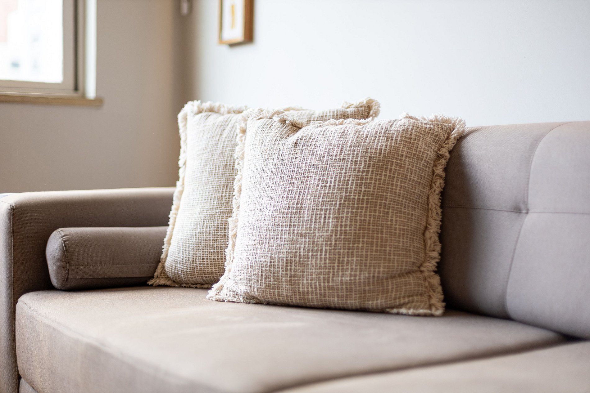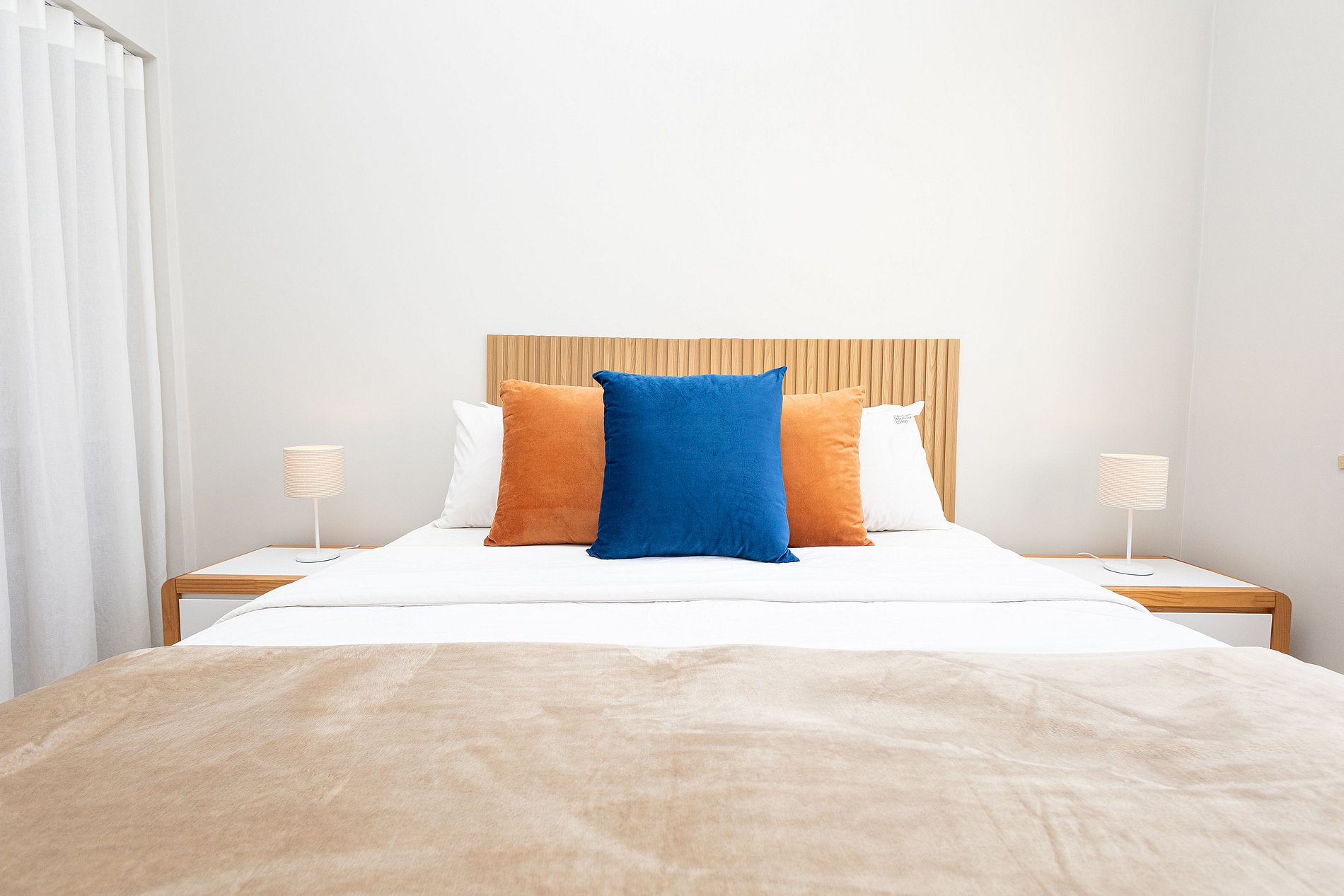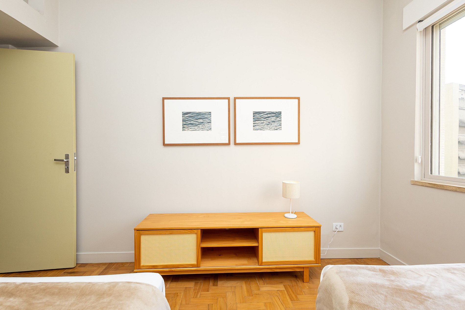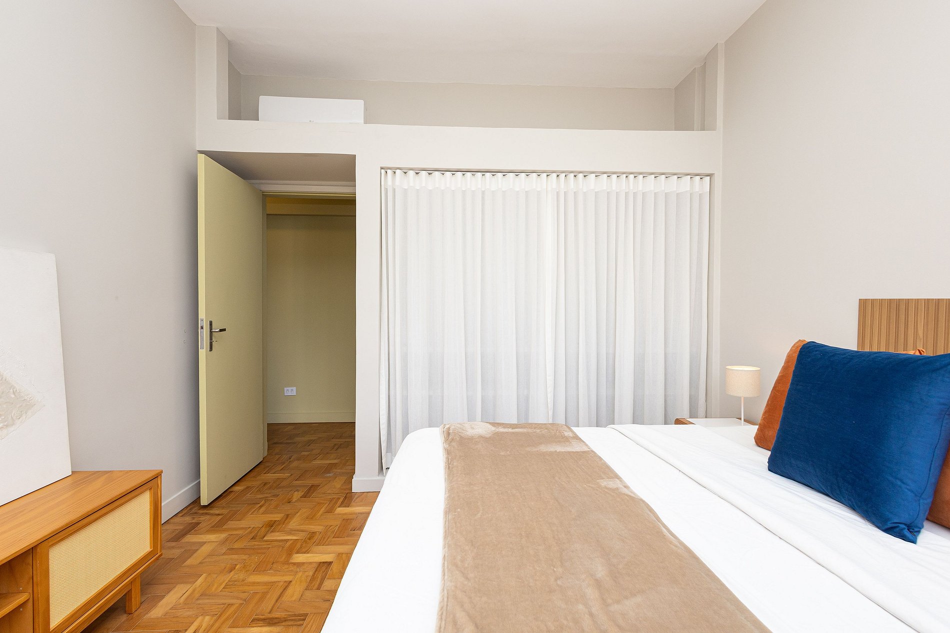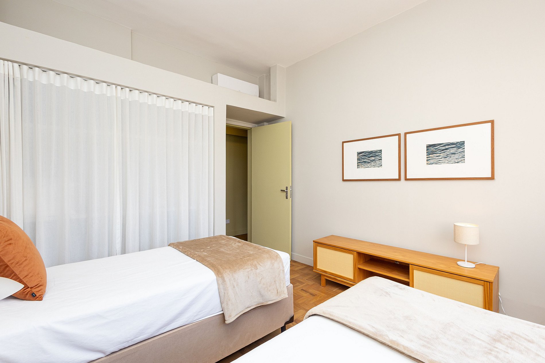 O apartamento dispõe de dois quartos espaçosos, ambos equipados com ar-condicionado, proporcionando um maior conforto. A sala de estar é ampla, com grandes janelas que permitem a entrada de luz natural, criando uma atmosfera arejada e iluminada.