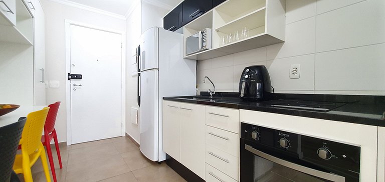 No apartamento há roupas de cama e toalhas de qualidade, assim como pequenas amenidades para nossos hóspedes. Cozinha oferece os utensílios necessários para realizar uma boa refeição em casa.