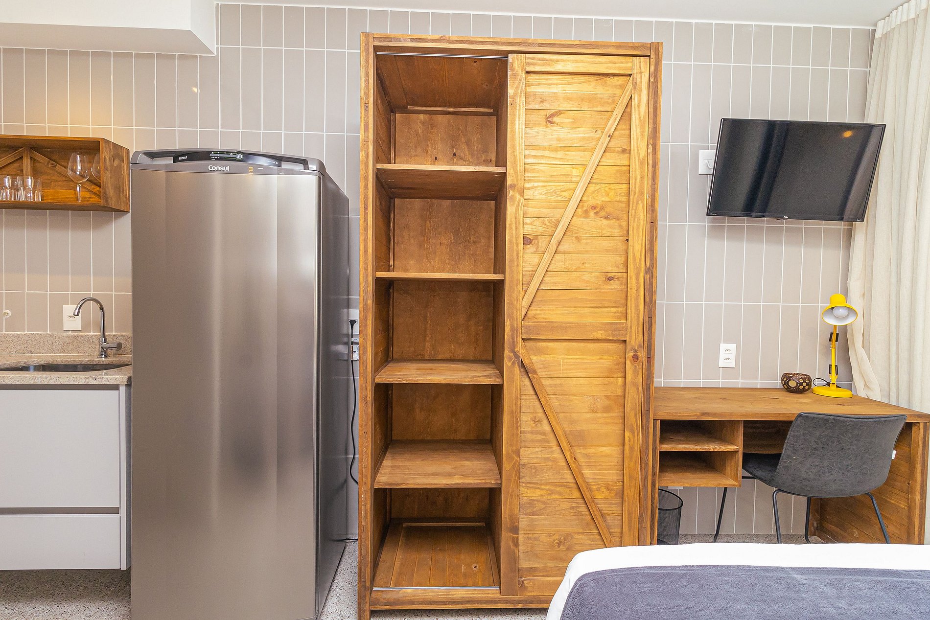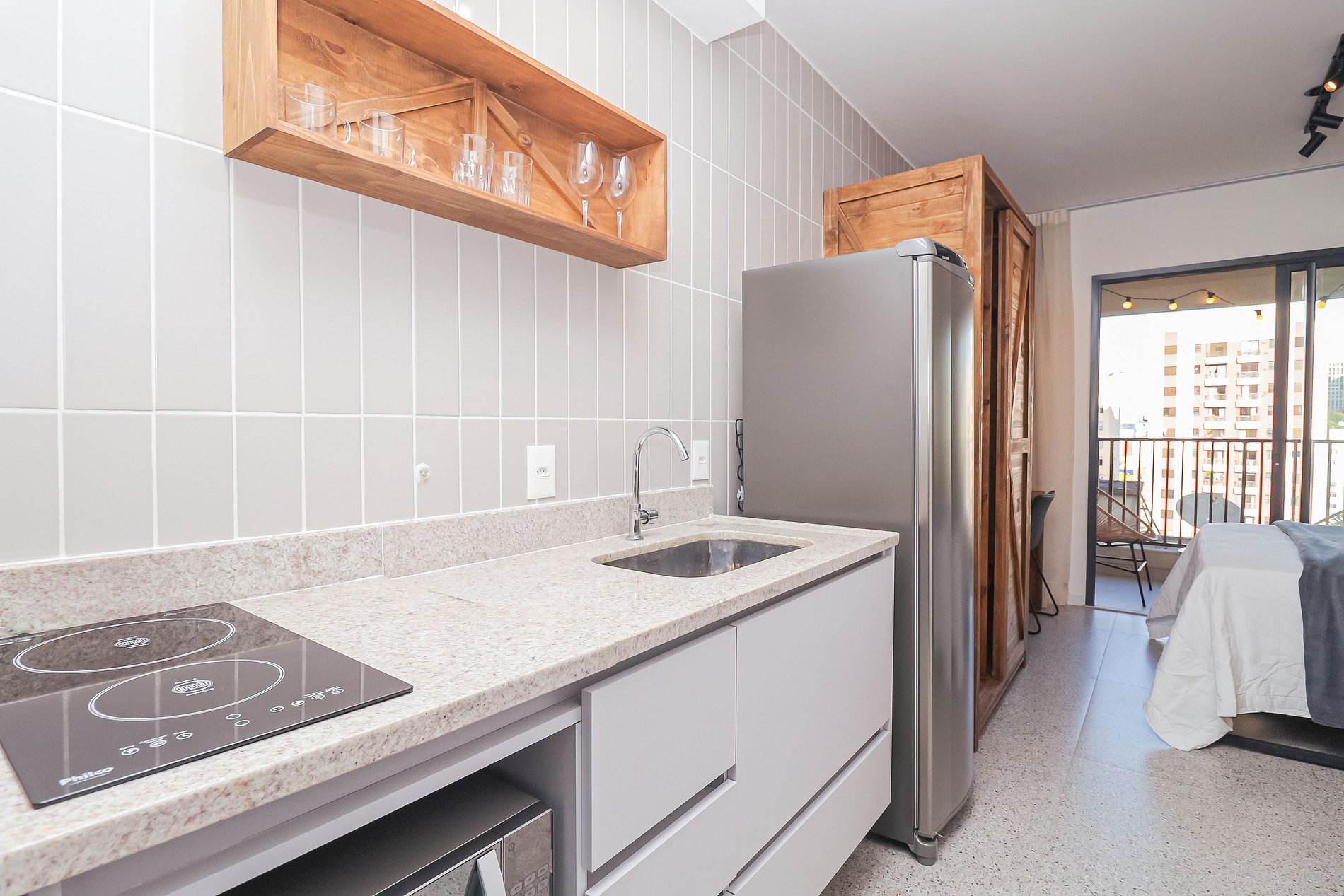 Studio lindo com vista da cidade além de piscina externa e academia completa no prédio.