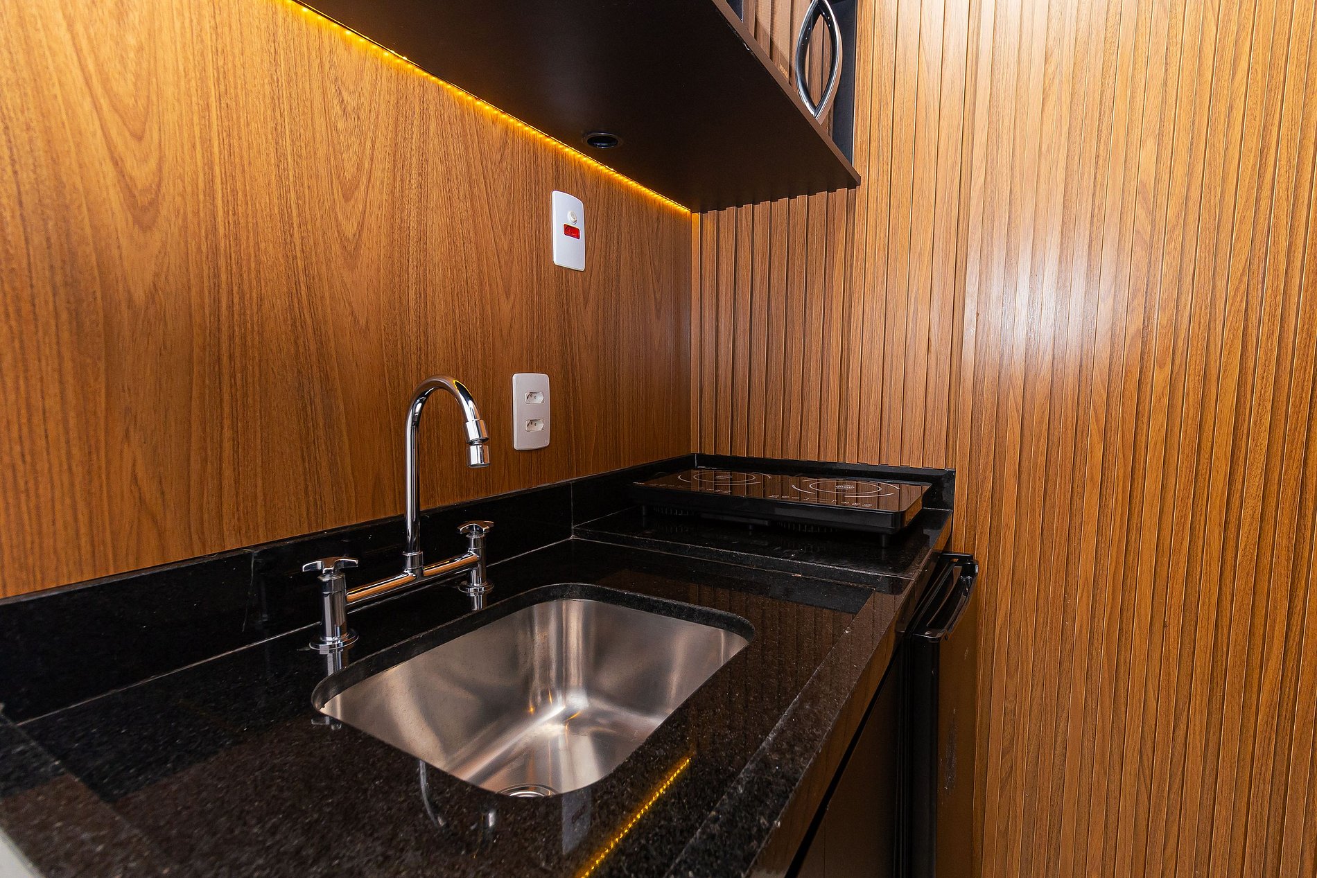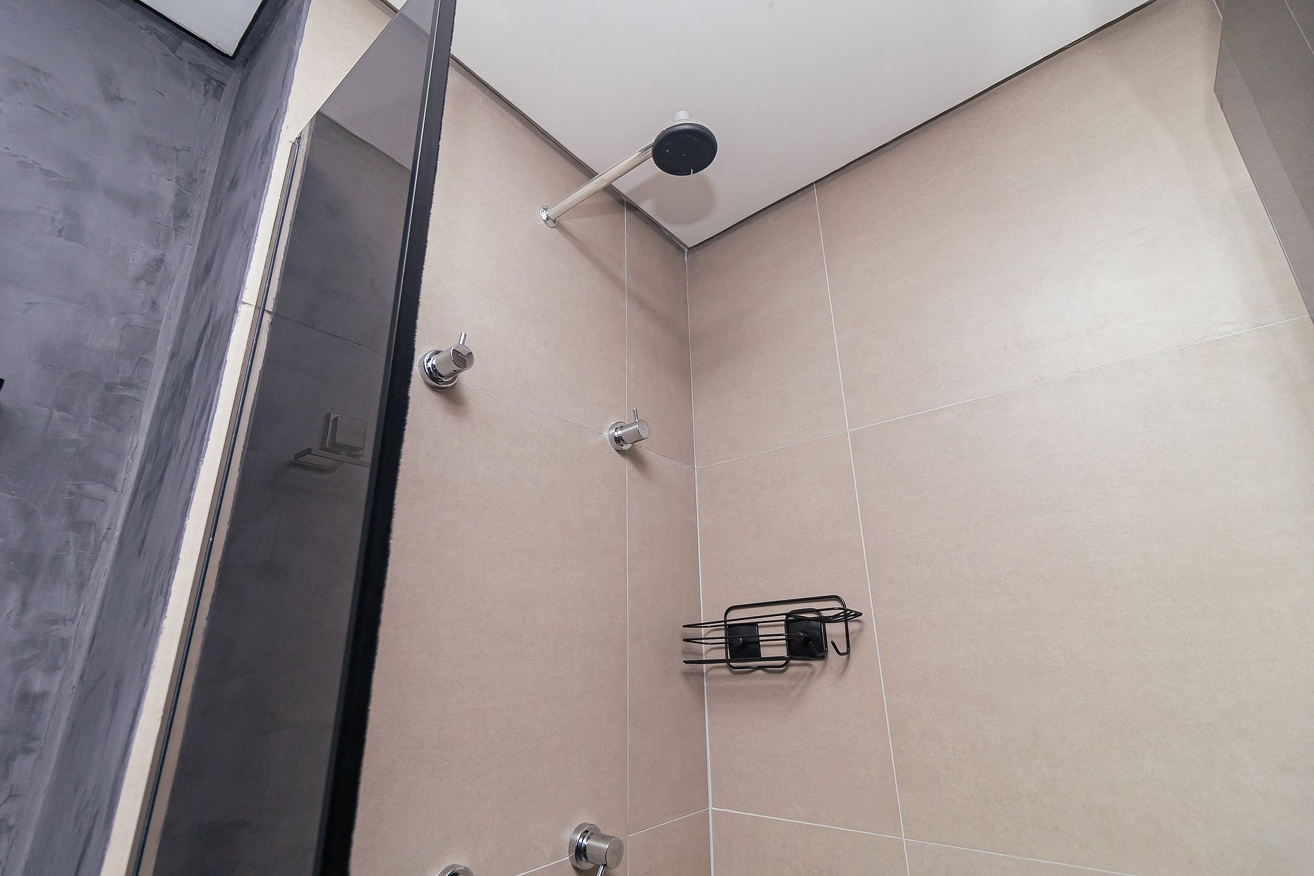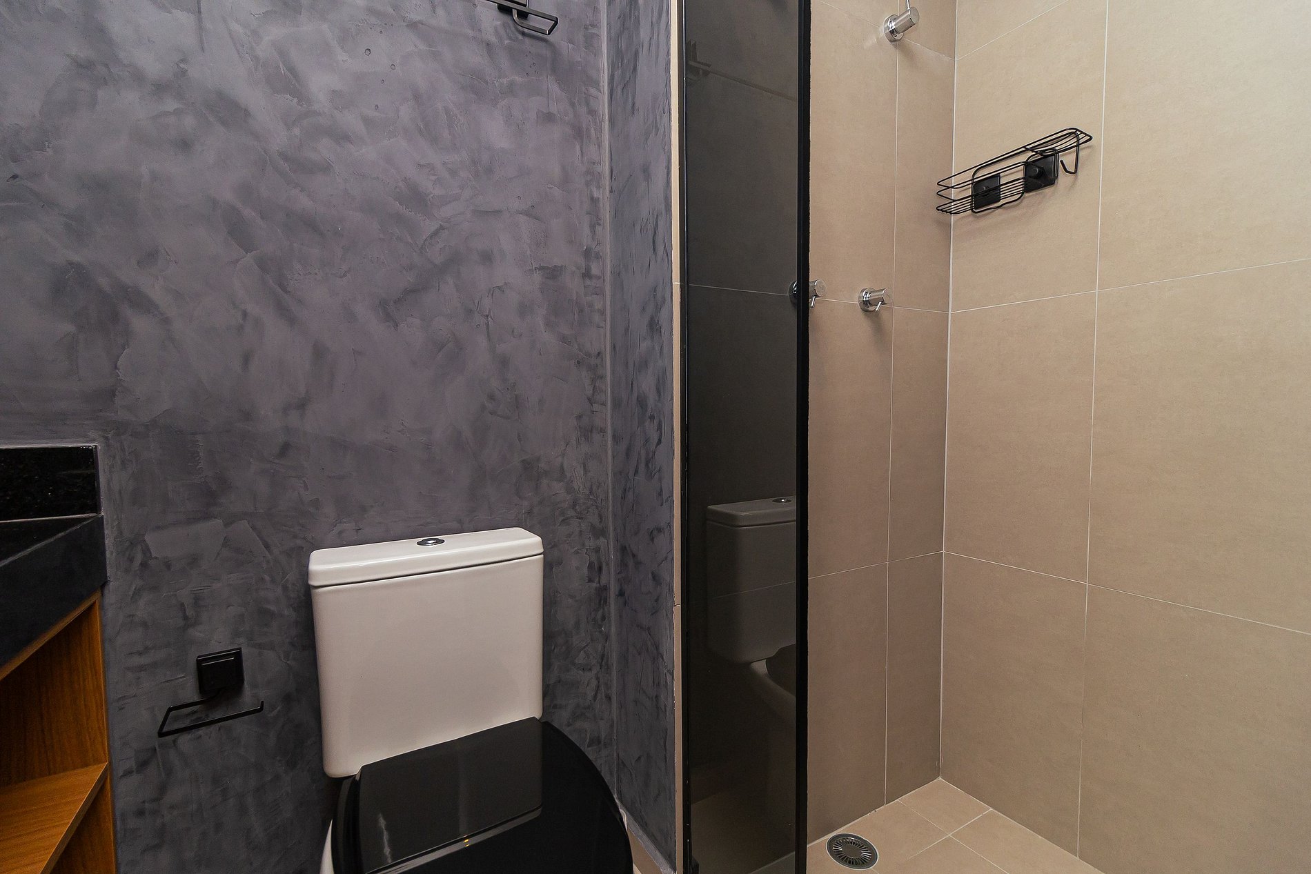 Possui também um espaço na cobertura com cadeiras para tomar sol e chuveiro, piscina, área com redes, co-working e espaço pet.