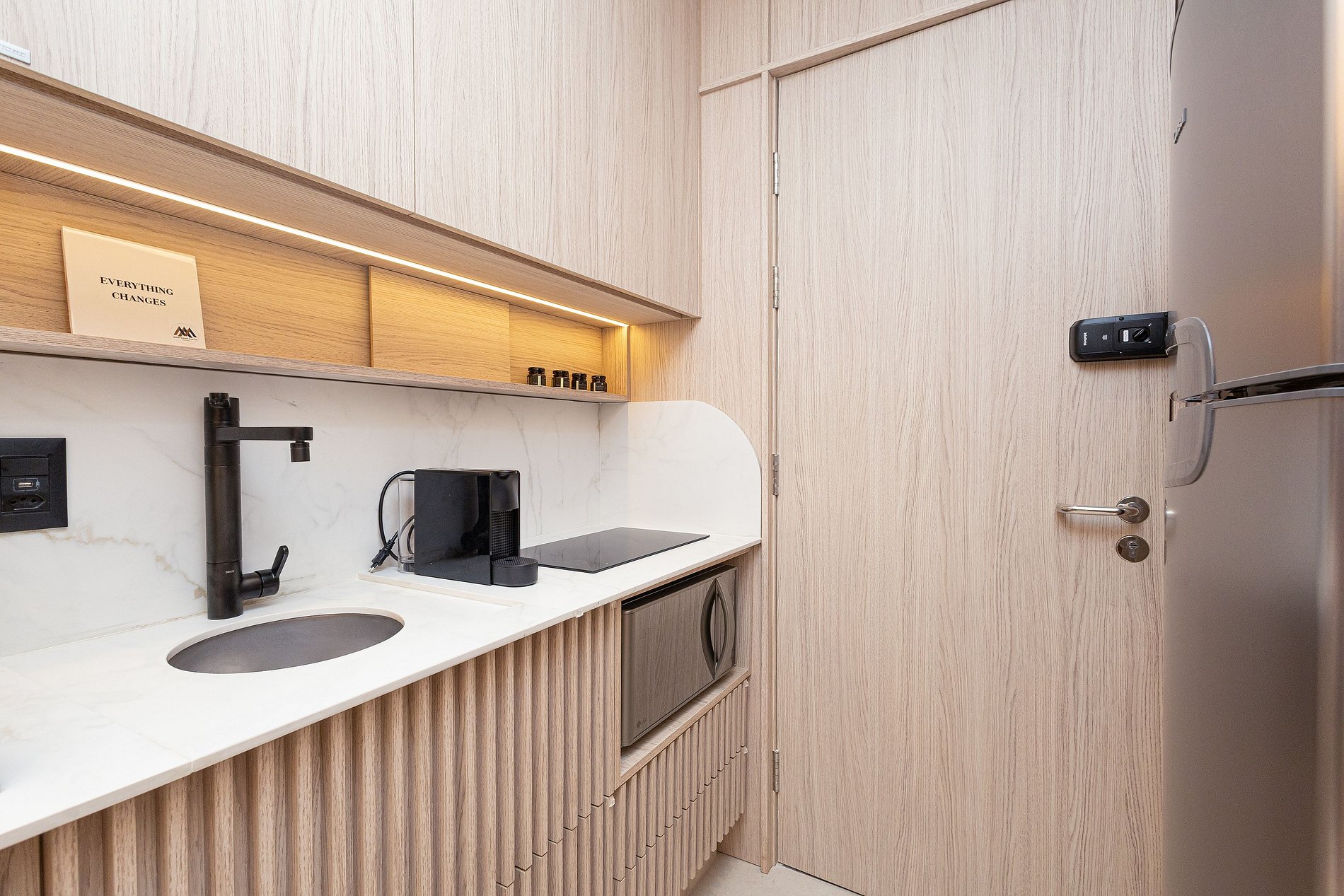 Ideal para quem valoriza conforto e funcionalidade, o espaço é totalmente mobiliado e equipado com ar-condicionado, Smart TV, Wi-Fi de alta velocidade, cozinha completa (cooktop, frigobar, micro-ondas e utensílios), além de uma cama confortável e área de apoio para refeições ou trabalho.