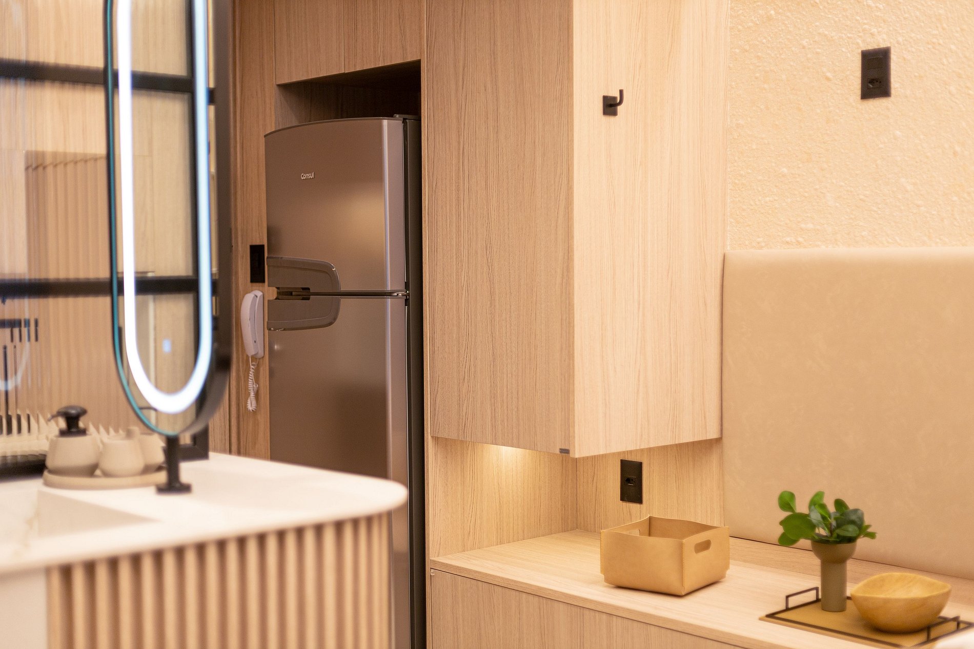 Moderno, funcional e com um toque acolhedor, este estúdio projetado na Rua Frei Caneca é ideal para quem busca praticidade sem abrir mão de estilo. O espaço combina elementos amadeirados com uma estética clean e contemporânea, criando um ambiente sofisticado e ao mesmo tempo convidativo.