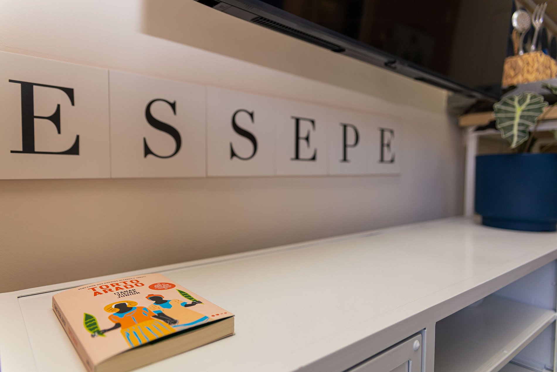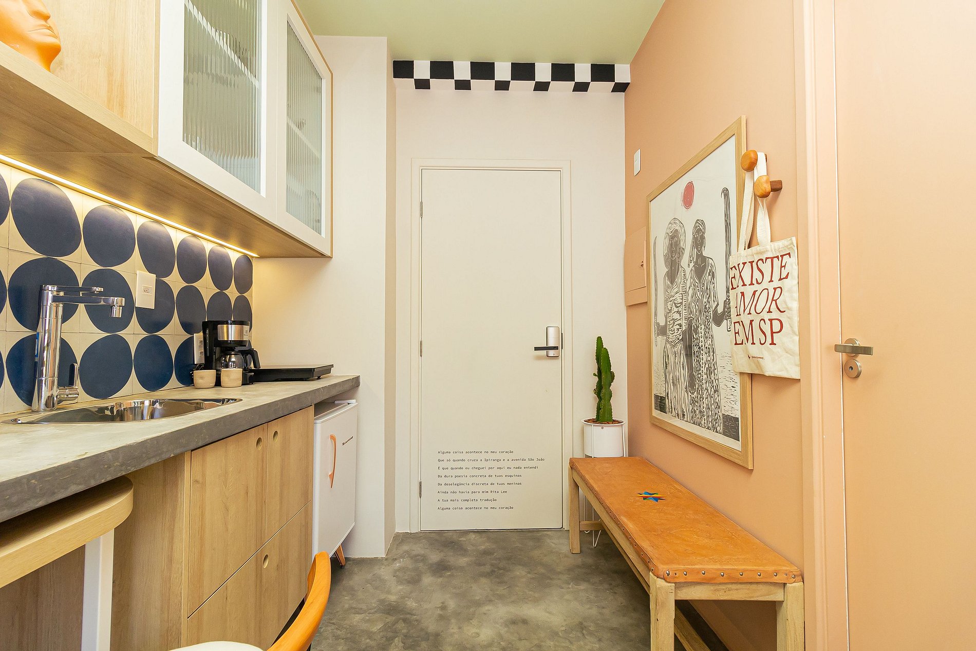 A Pauliceia se apresenta através das poesias escritas nas paredes que dialogam com os hóspedes, ladrinhos exclusivos criados para o AP ESSEPE trazem as calçadas paulistanas para a cabeceira da cama e uma vista privilegiada de edificios históricos, como o icônico Copan, emolduram a varanda do apartamento.