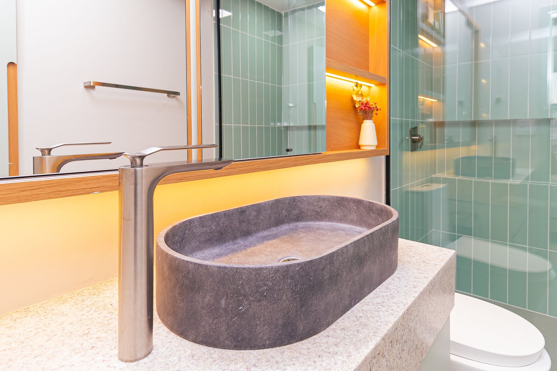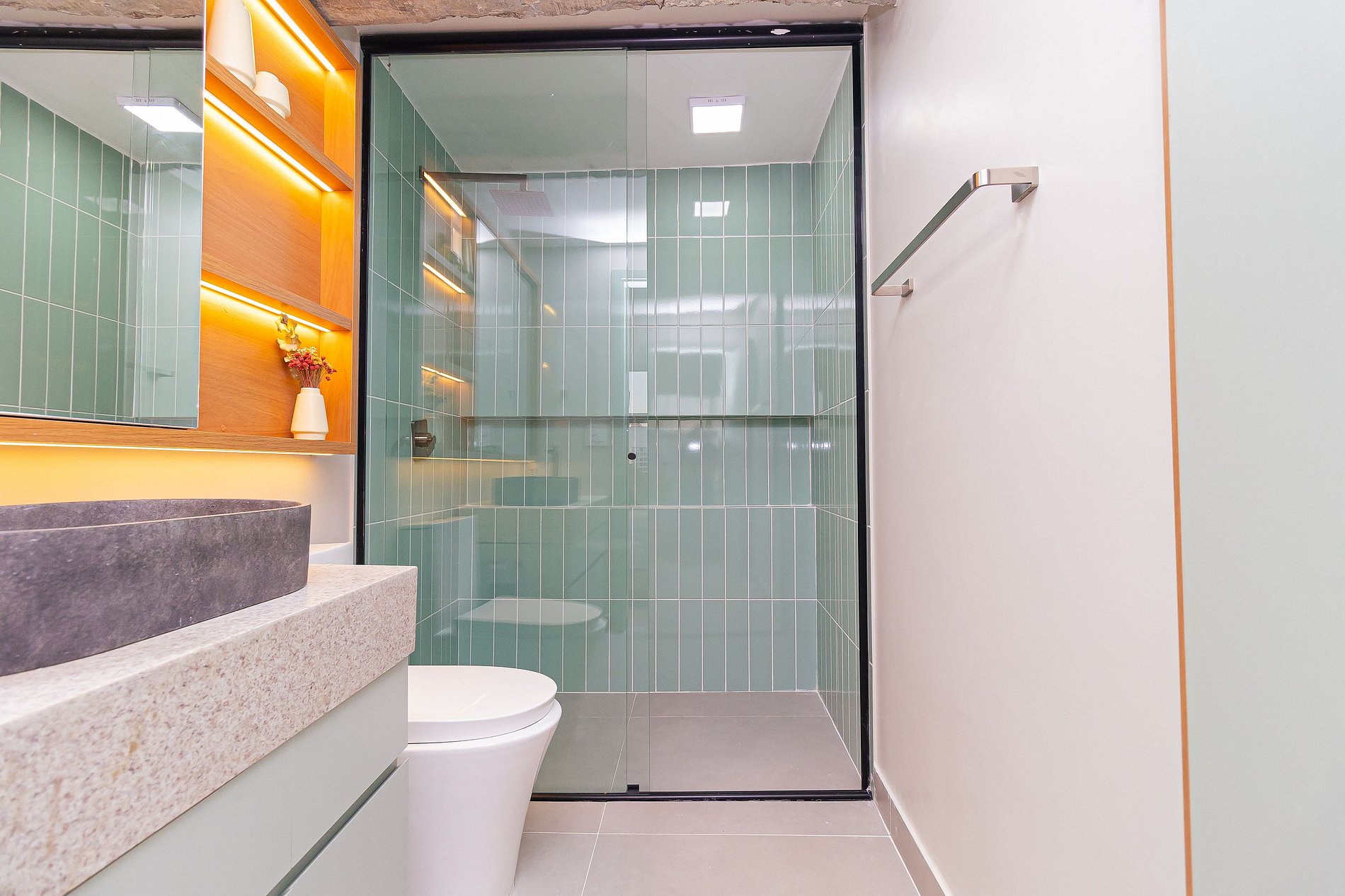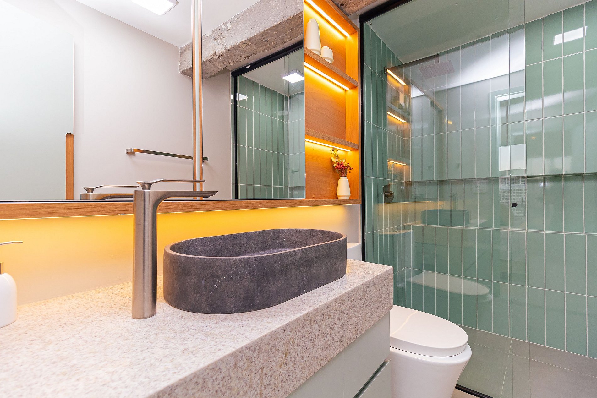 A decoração é um capítulo à parte: o projeto tem como principal elemento uma banheira de imersão com cromoterapia Doka maravilhosa e ambientada ao lado da janela, tendo a vista privilegiada como composição final pra esse espaço cheio de personalidade.