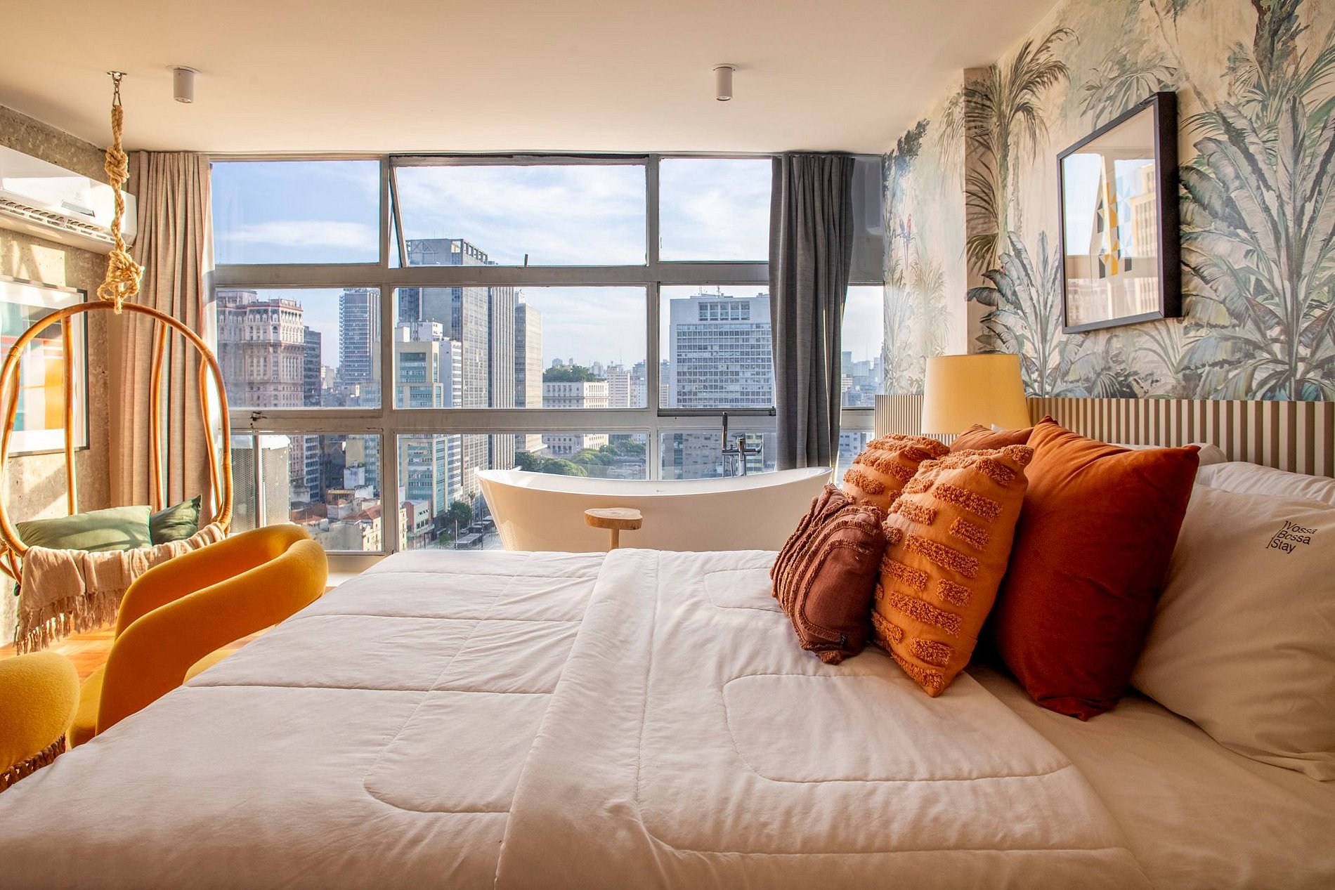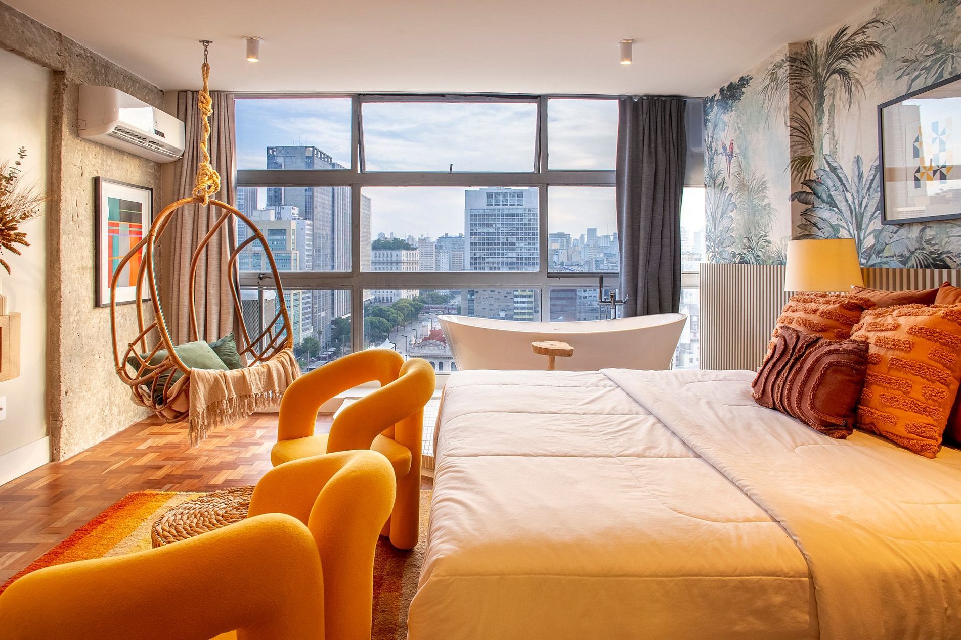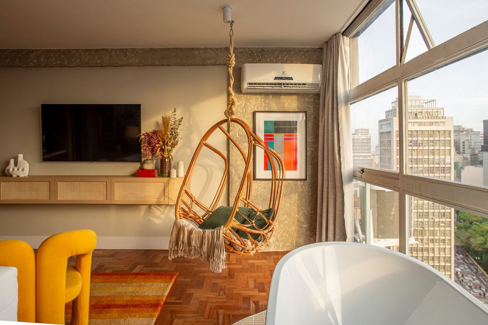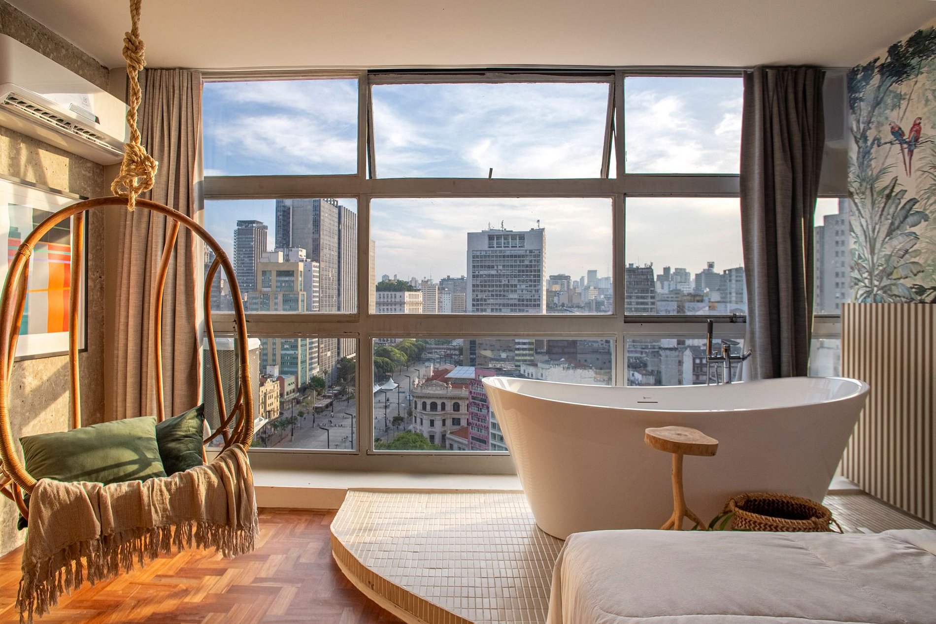 Com uma localização incrível e escolhas de projeto únicas como um lindïssimo balanço rattan e uma banheira estrategicamente virada para a vista da cidade, o estúdio, está em frente ao novo e recém revitalizado Vale do Anhangabaú, onde fica fácil de explorar o centro histórico e as redondezas, a partir de um dos pontos mais efervescentes do coração da cidade de São Paulo.