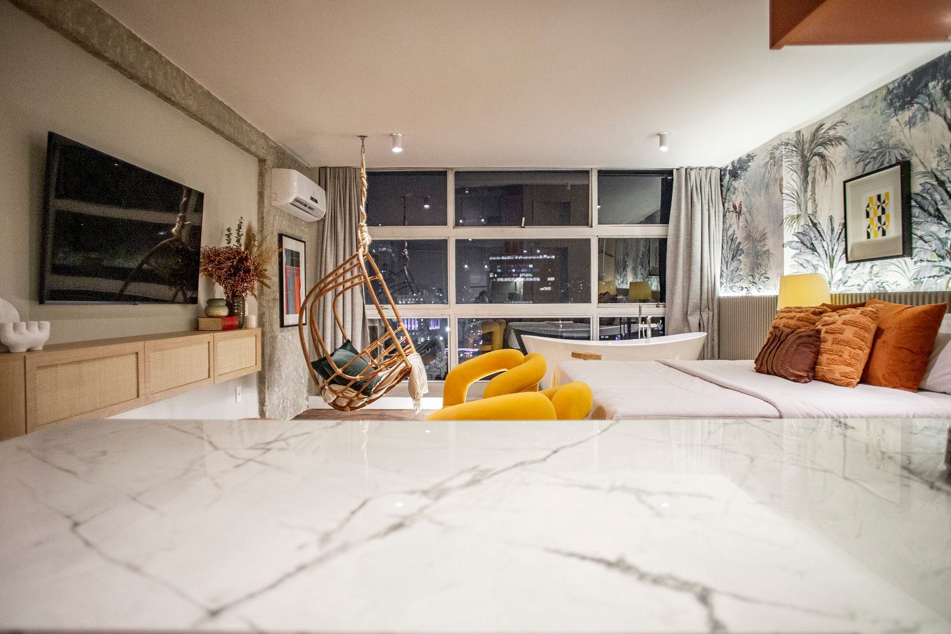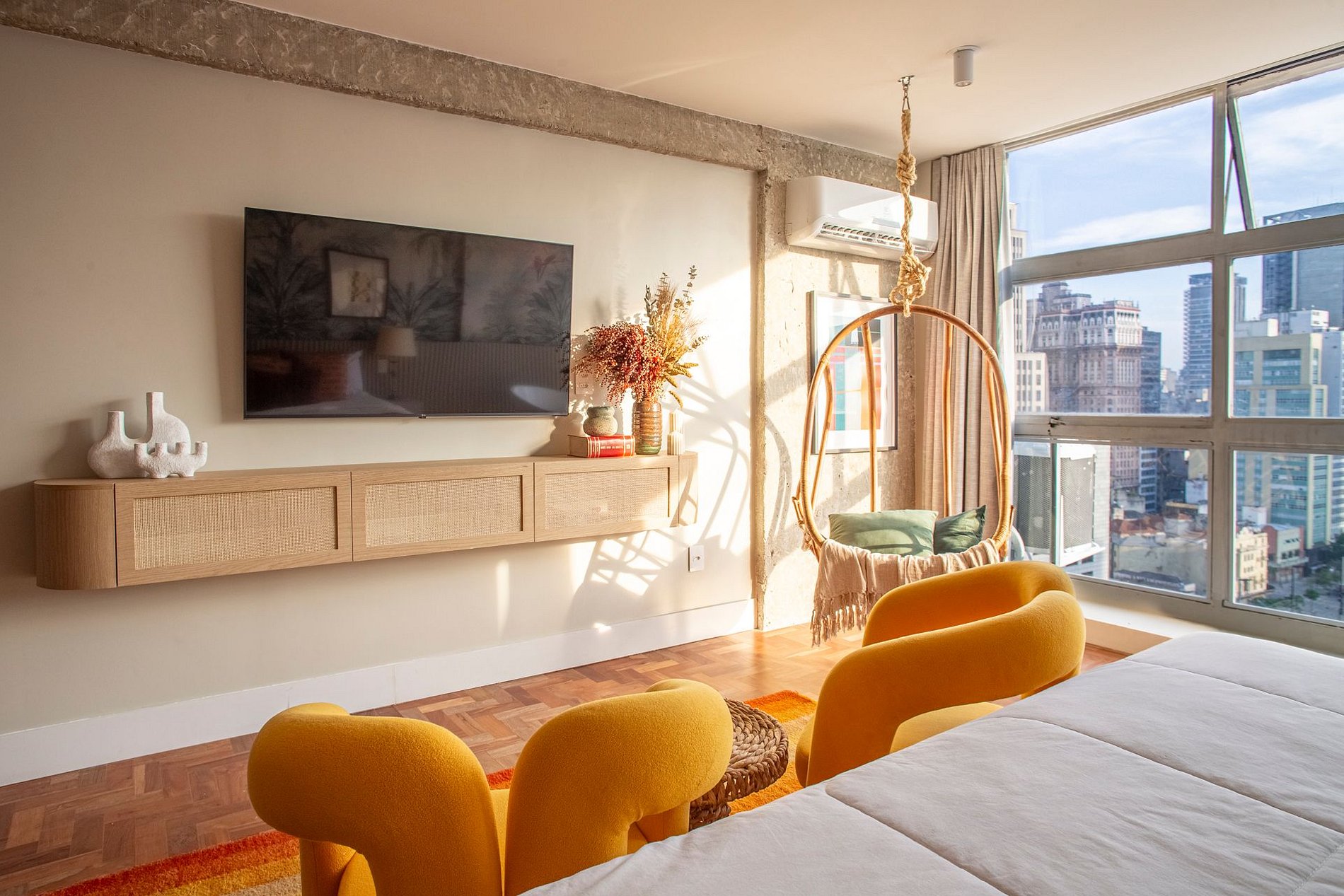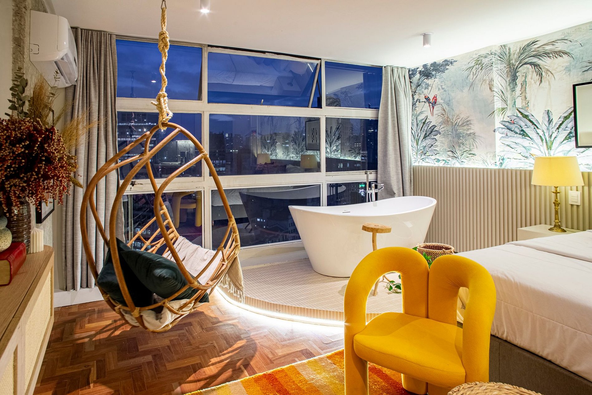 Com uma localização incrível e escolhas de projeto únicas como um lindïssimo balanço rattan e uma banheira estrategicamente virada para a vista da cidade, o estúdio, está em frente ao novo e recém revitalizado Vale do Anhangabaú, onde fica fácil de explorar o centro histórico e as redondezas, a partir de um dos pontos mais efervescentes do coração da cidade de São Paulo.