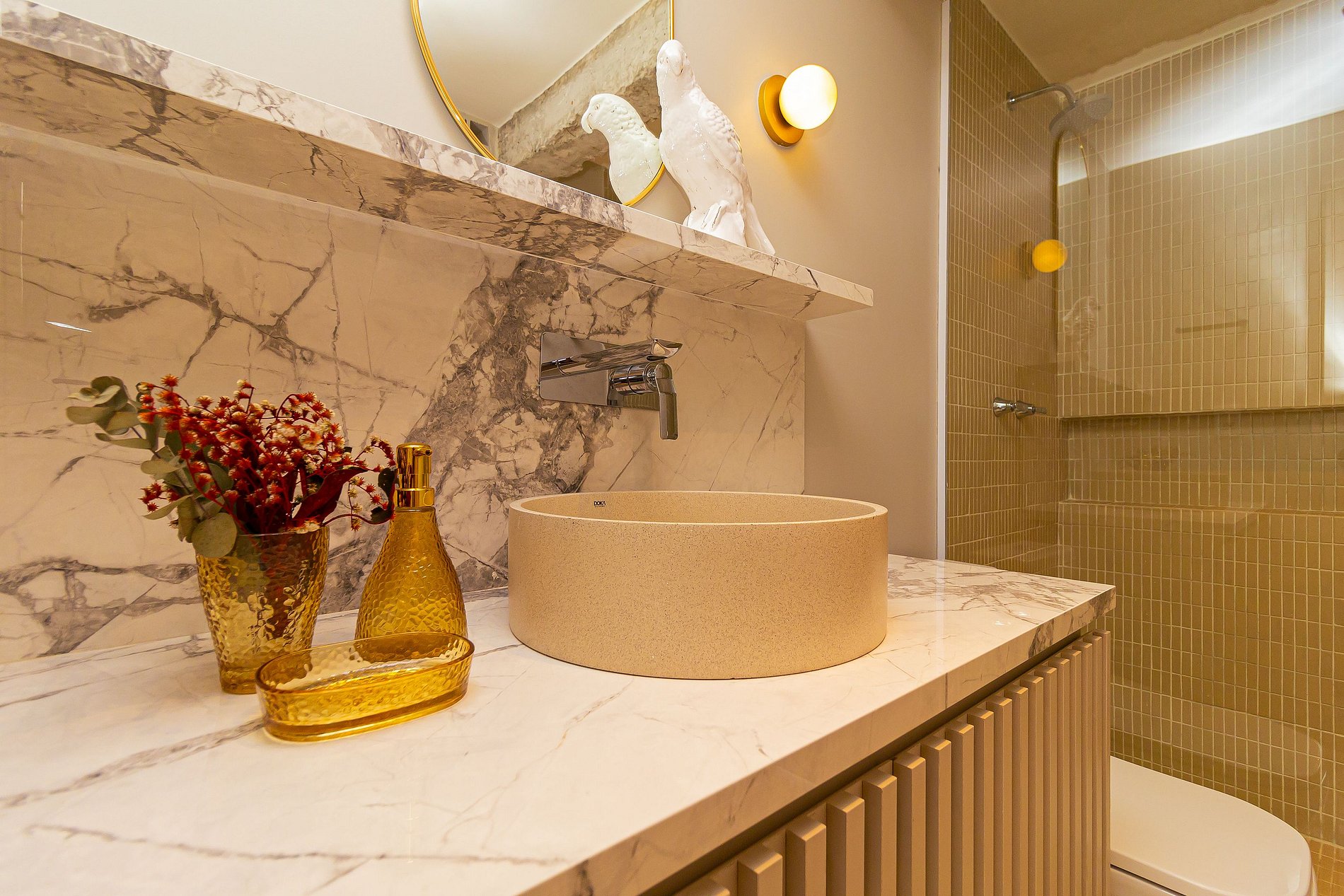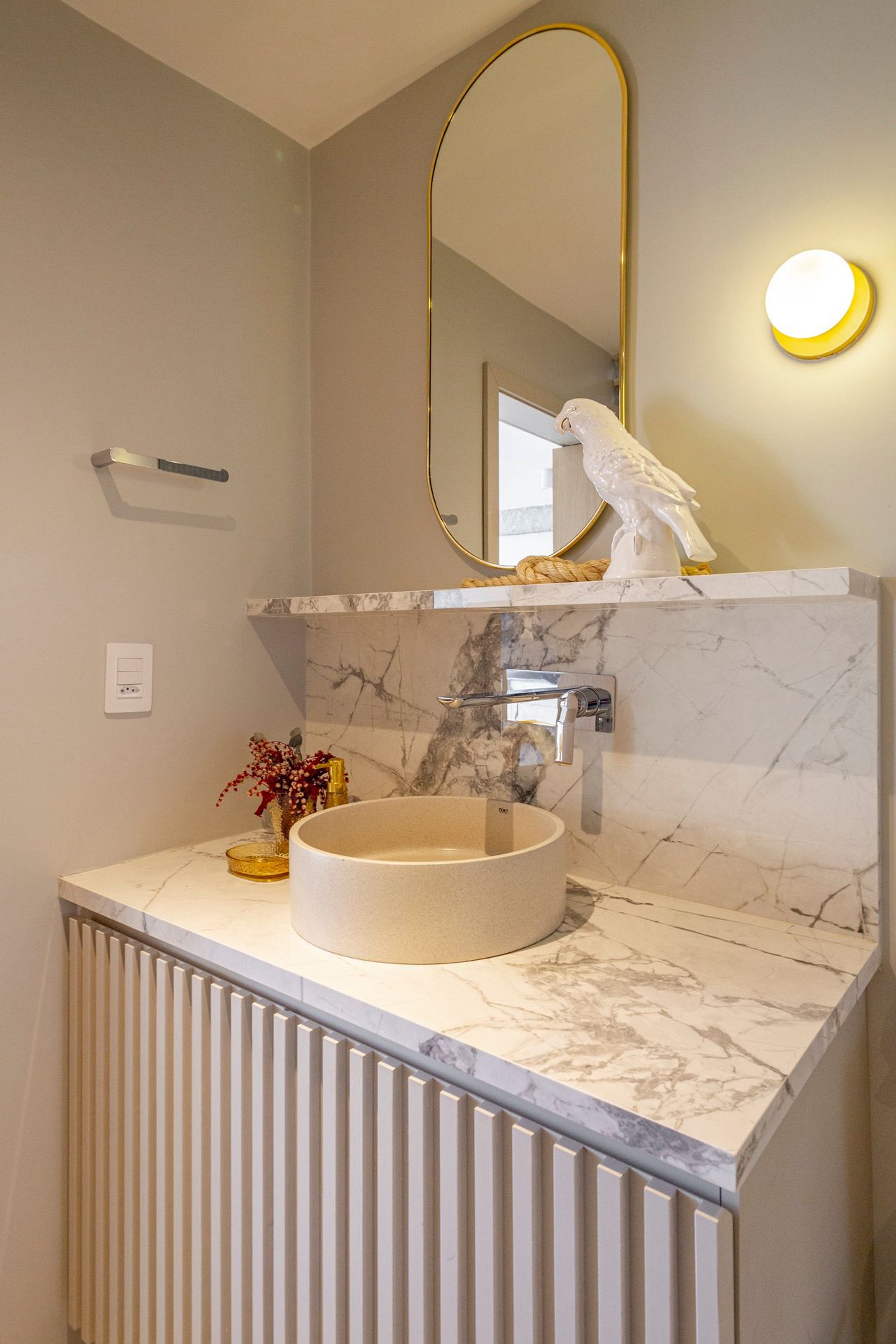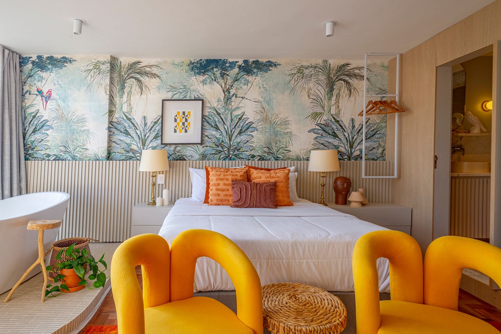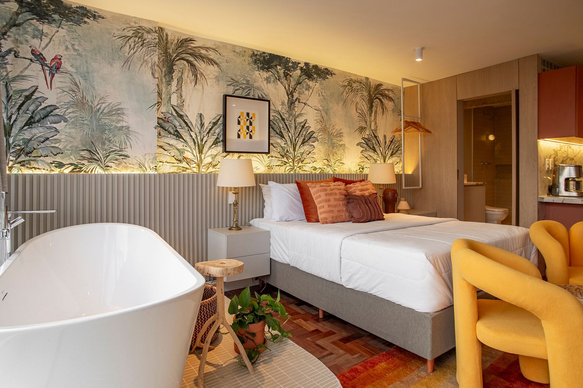 A decoração é um capítulo à parte: o projeto tem como principal elemento uma banheira com design orgânico Doka, ambientada ao lado da janela, tendo a vista privilegiada como composição final pra esse espaço cheio de cores e personalidade.
