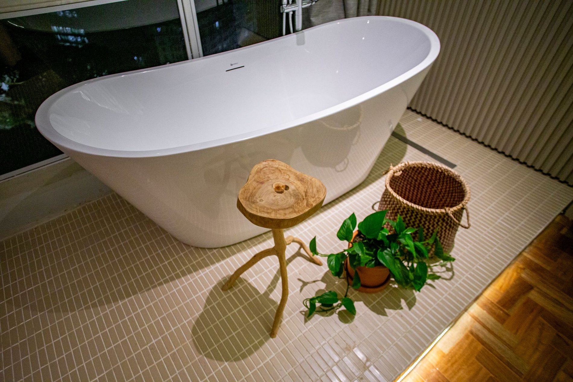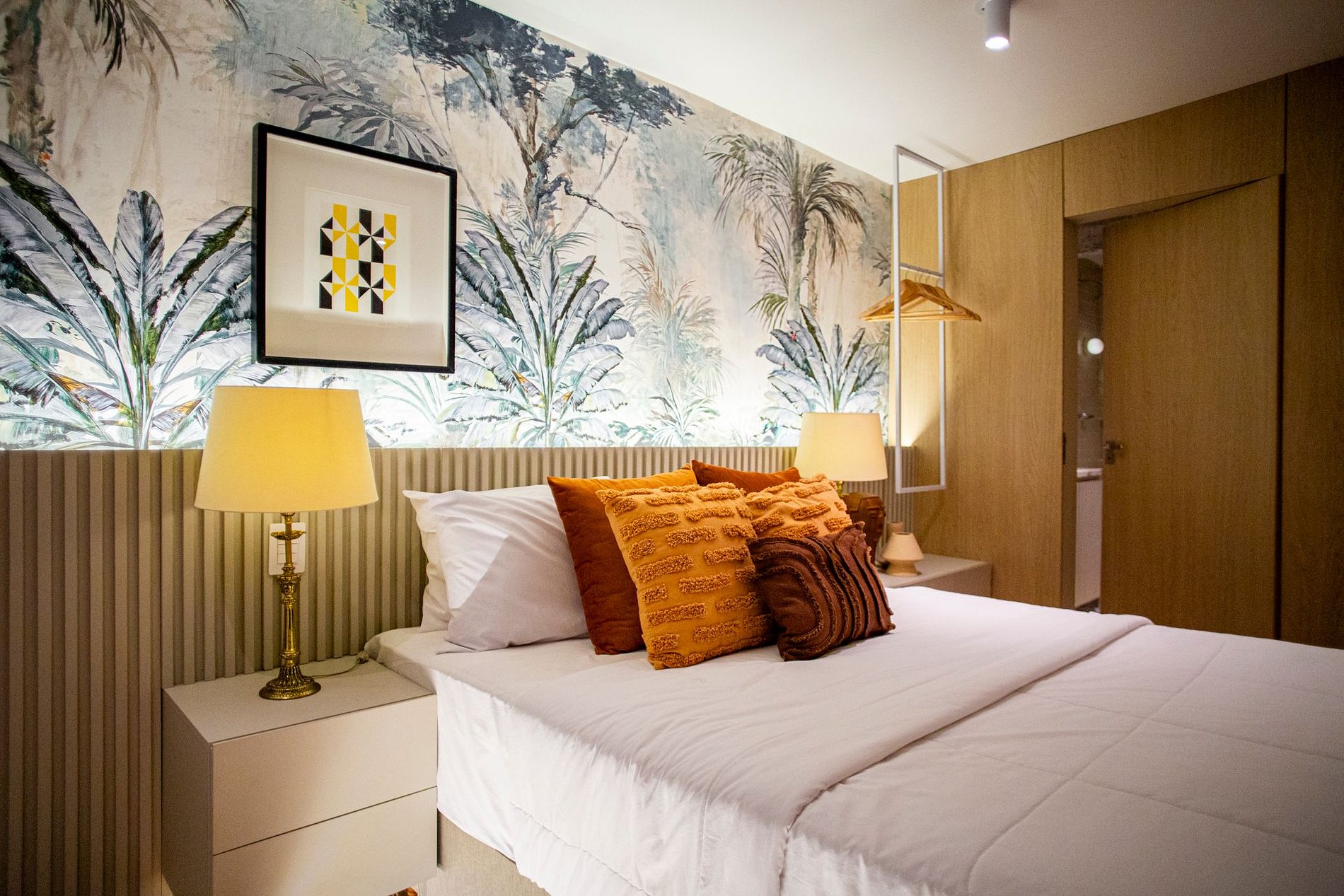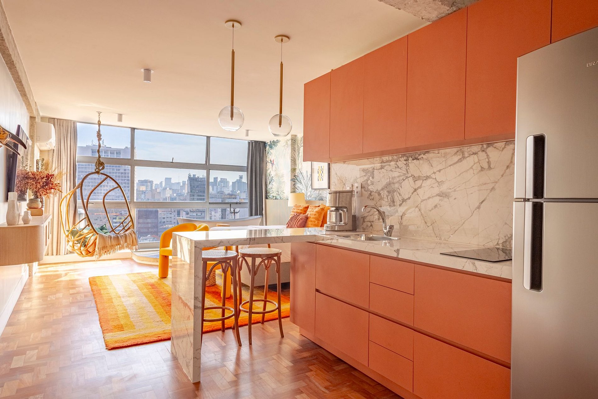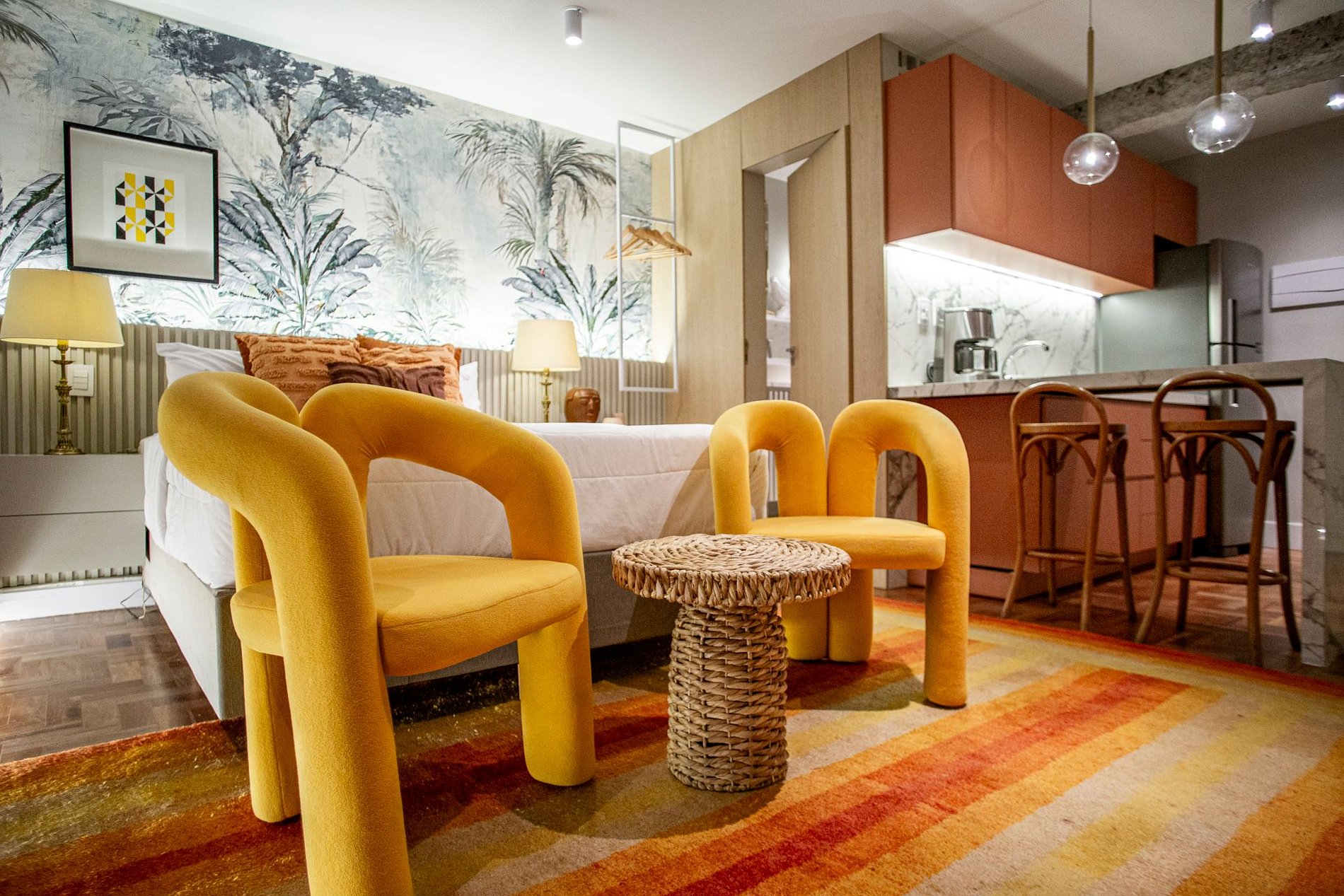 A decoração é um capítulo à parte: o projeto tem como principal elemento uma banheira com design orgânico Doka, ambientada ao lado da janela, tendo a vista privilegiada como composição final pra esse espaço cheio de cores e personalidade.