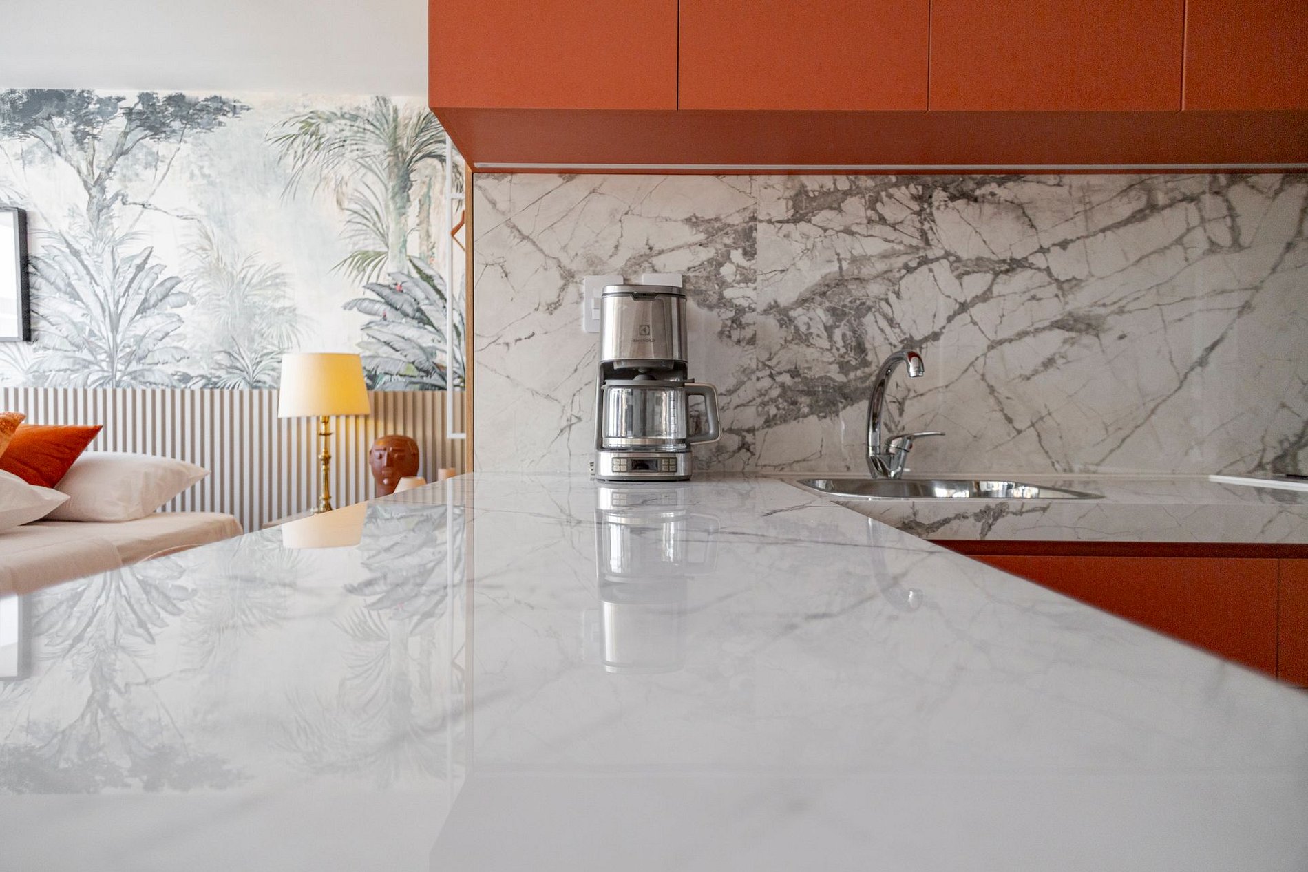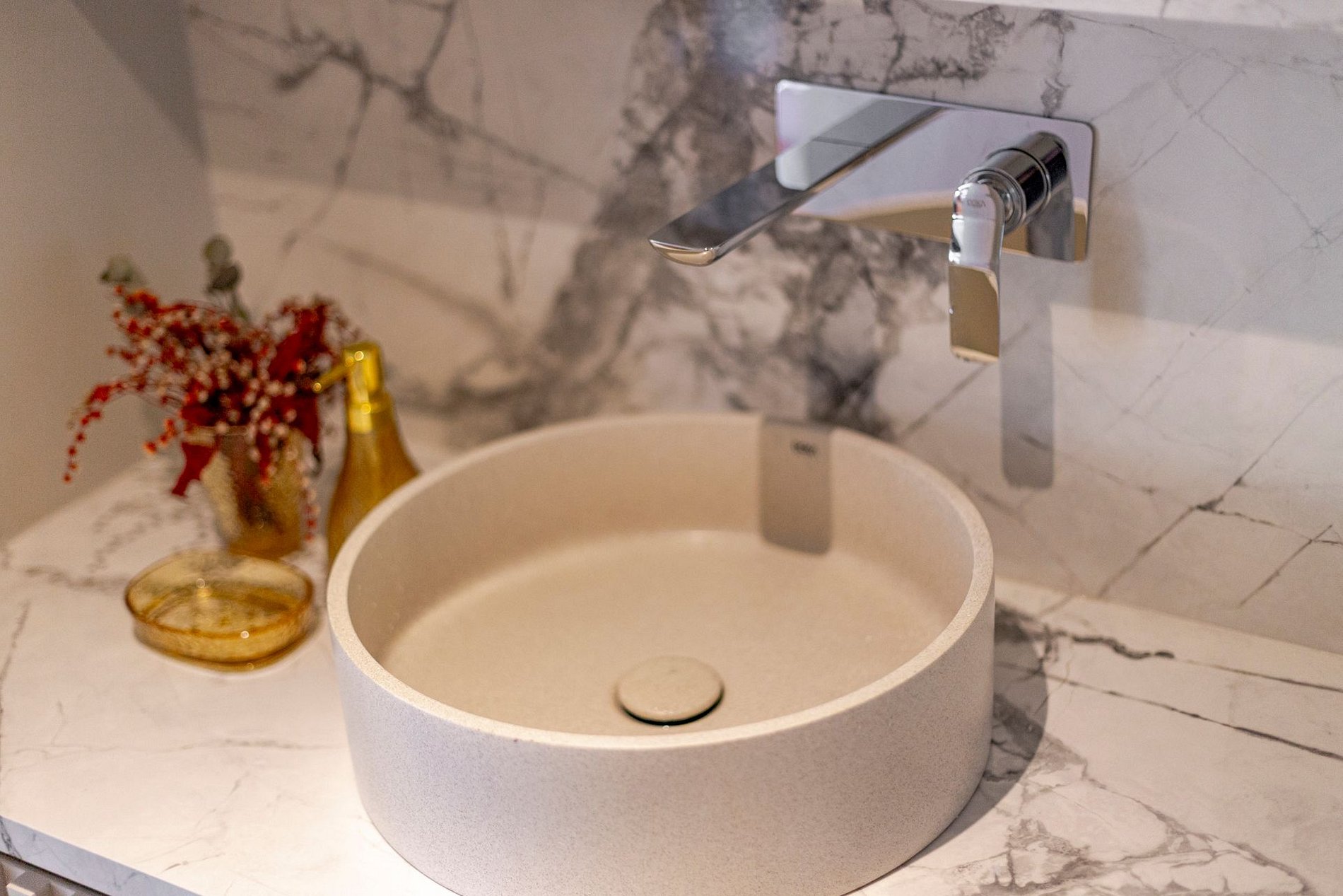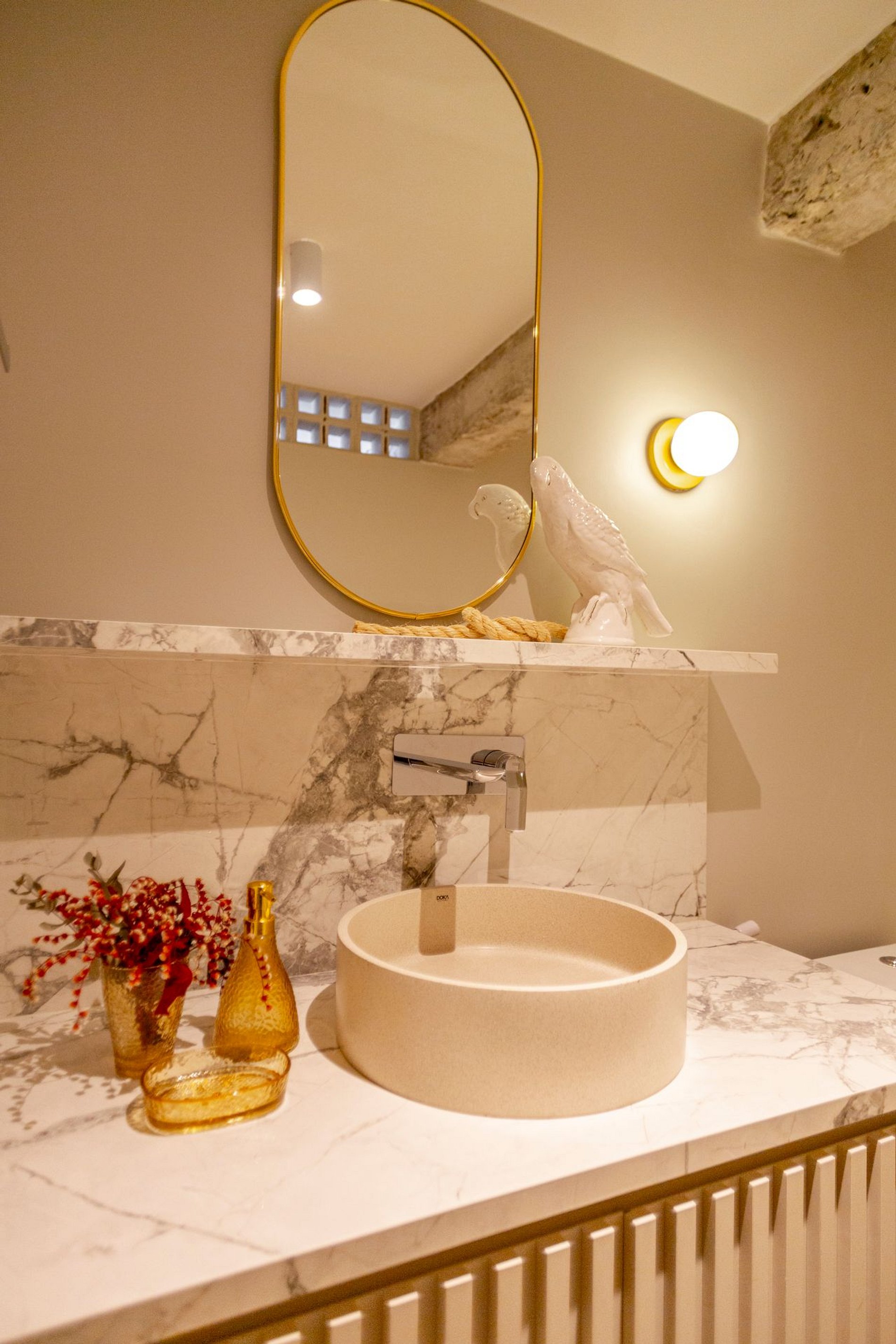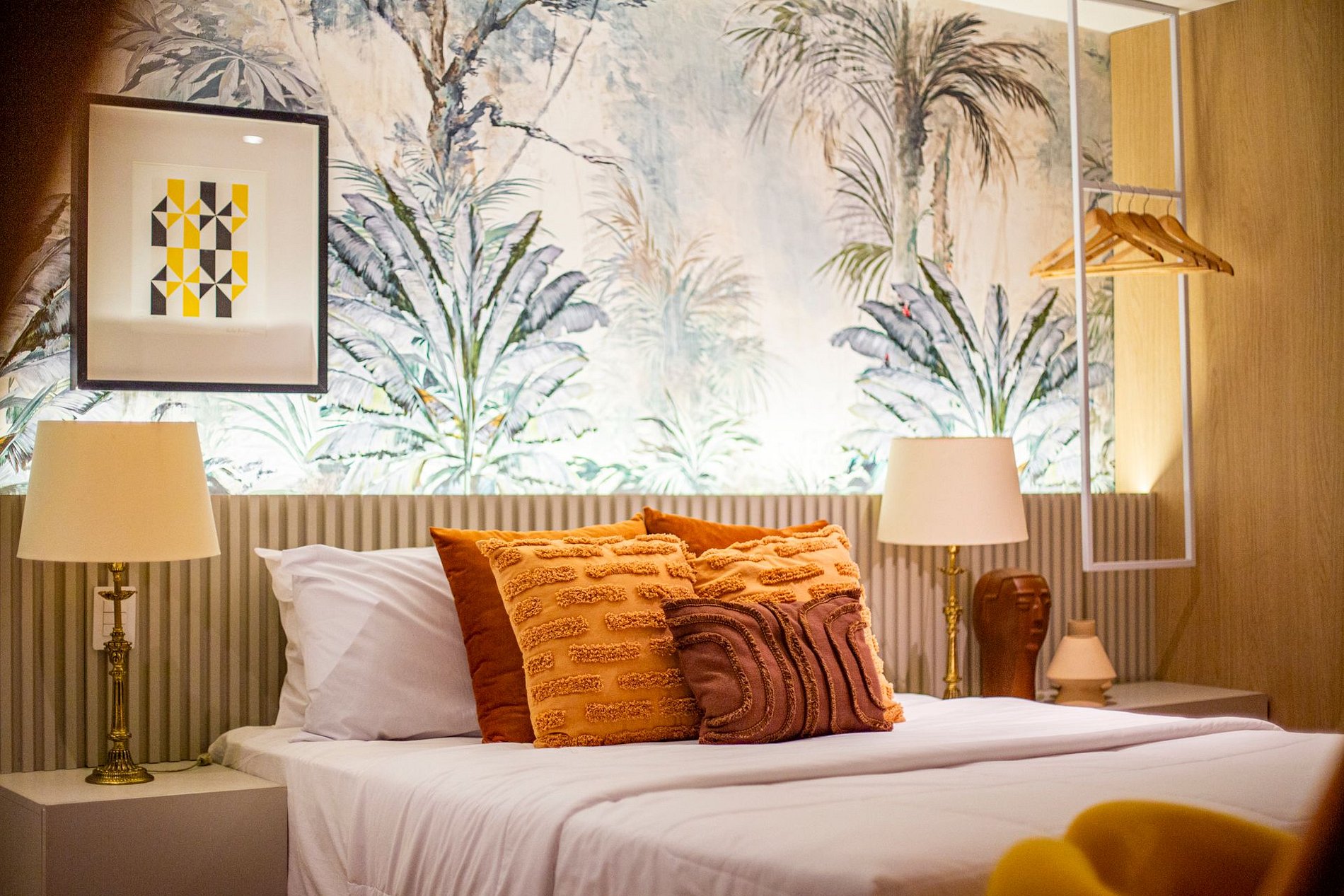 A decoração é um capítulo à parte: o projeto tem como principal elemento uma banheira com design orgânico Doka, ambientada ao lado da janela, tendo a vista privilegiada como composição final pra esse espaço cheio de cores e personalidade.