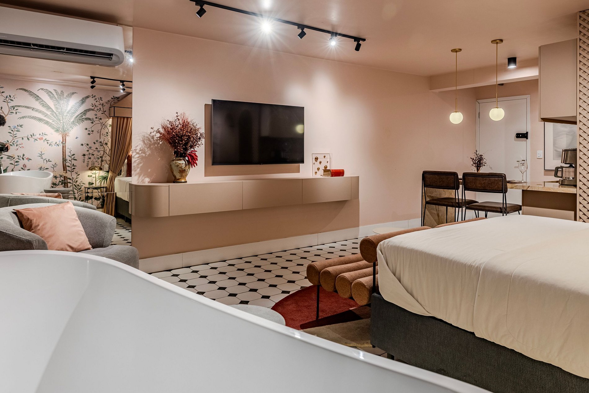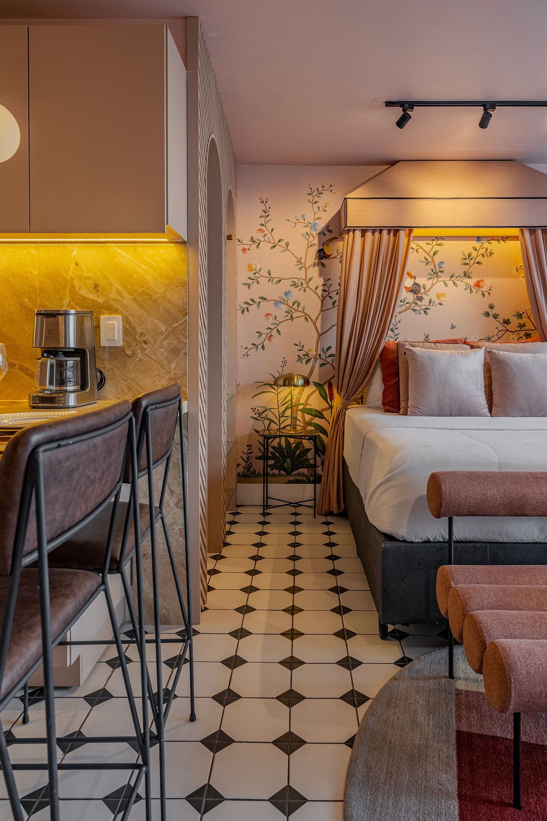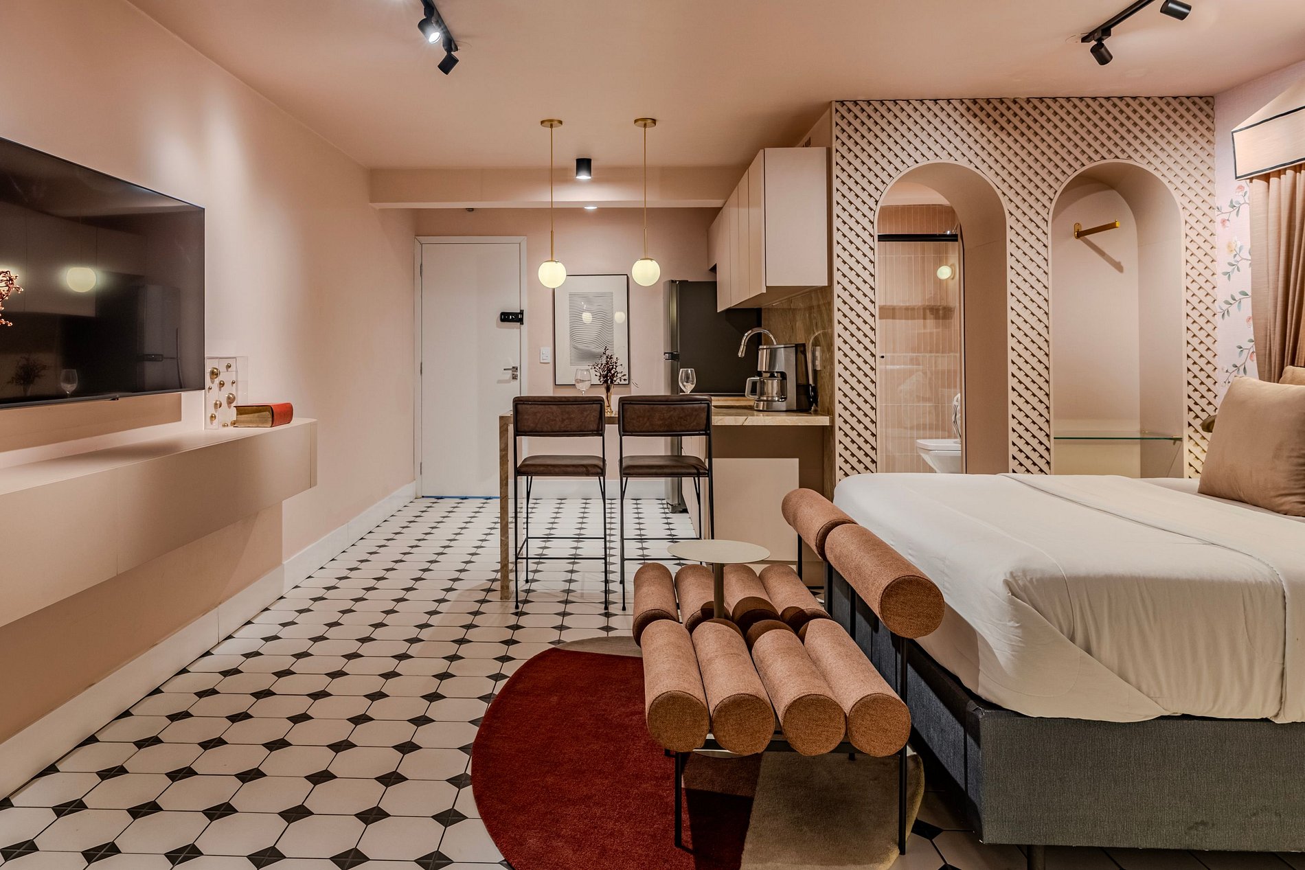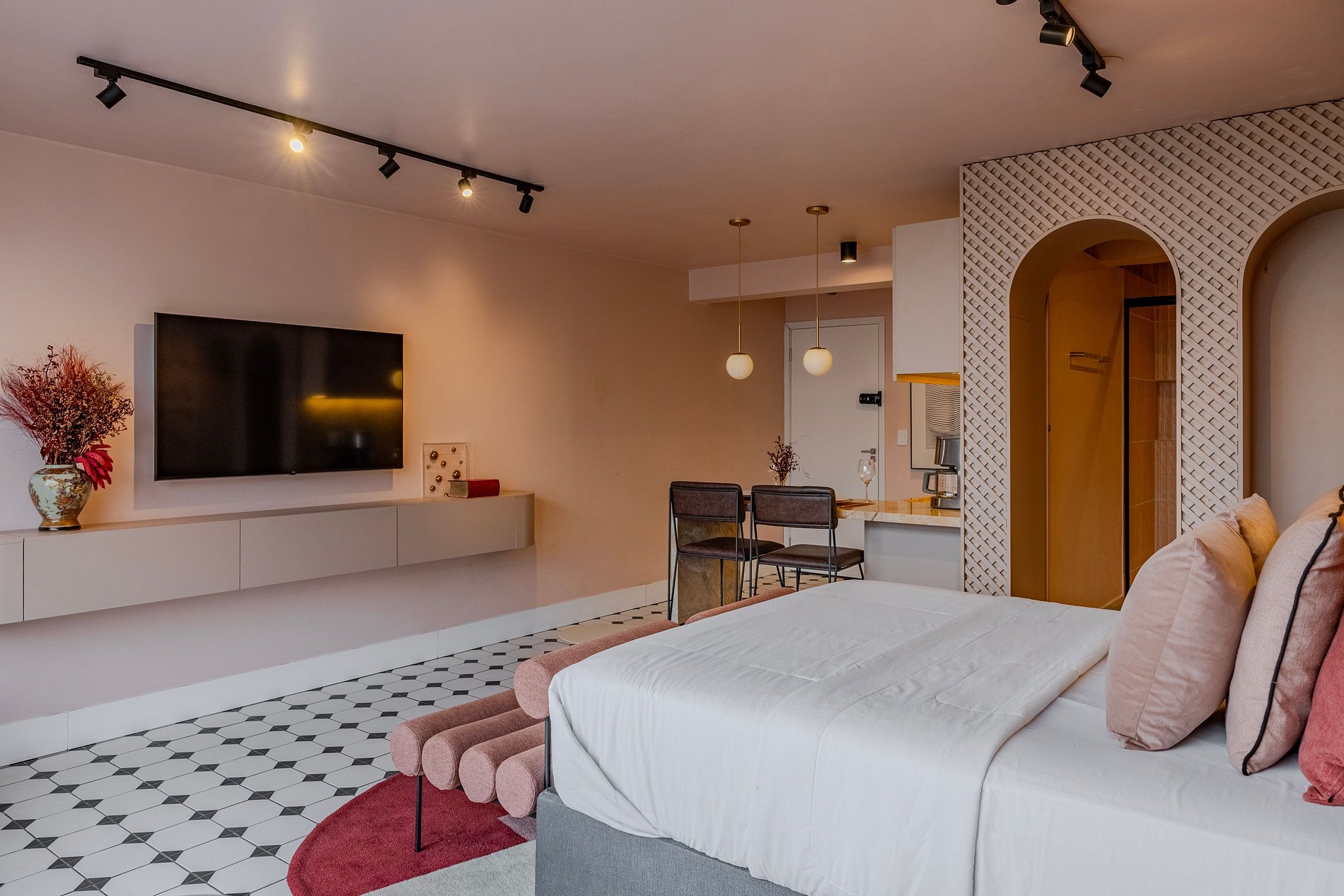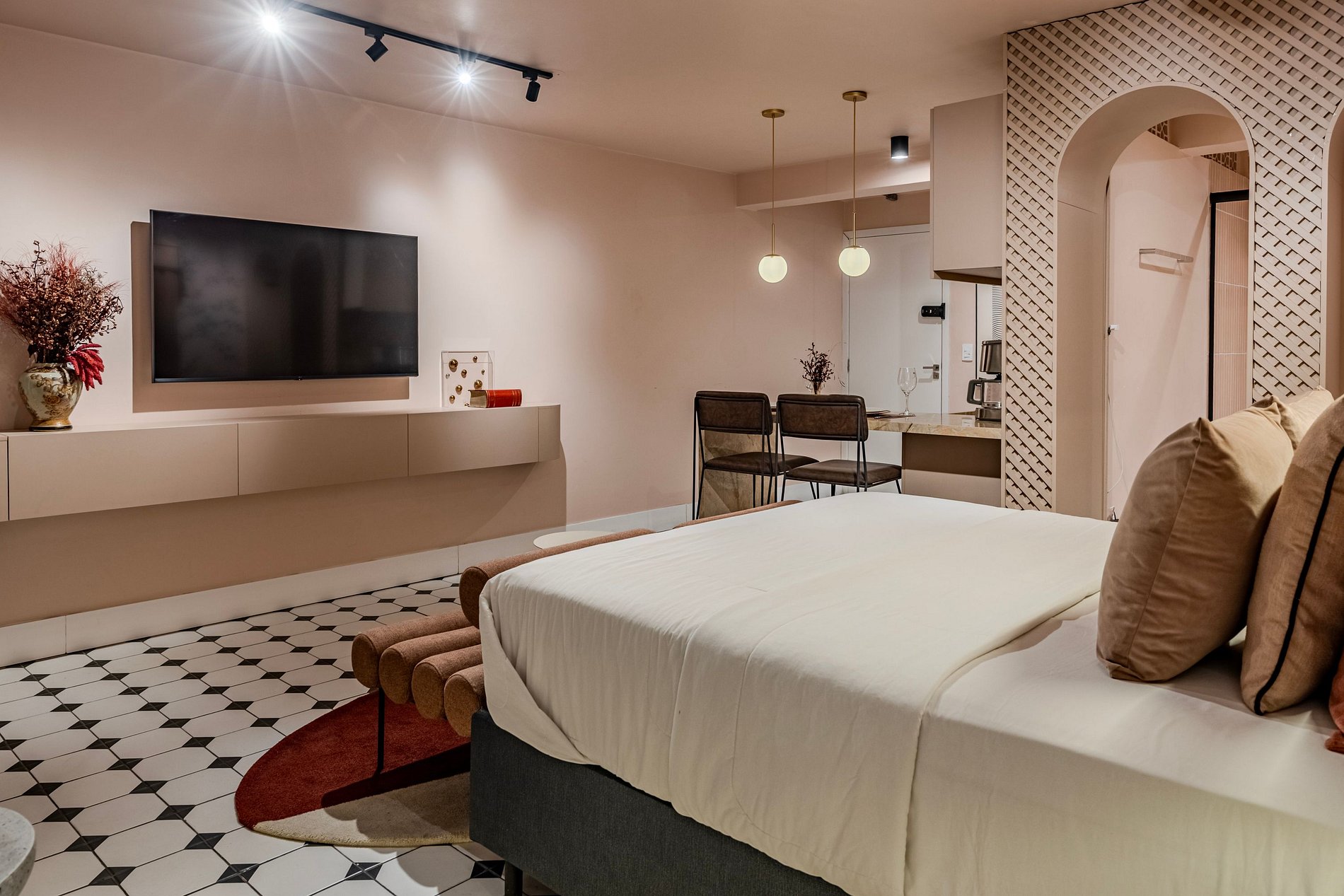 Cada cantinho do apartamento é adornado com toques de glamour, desde luminárias elegantes até acessórios decorativos inspirados no mundo da moda. Desfrute do quarto com cama queen super confortável e roupas de cama finas, garantindo uma noite de sono revigorante.