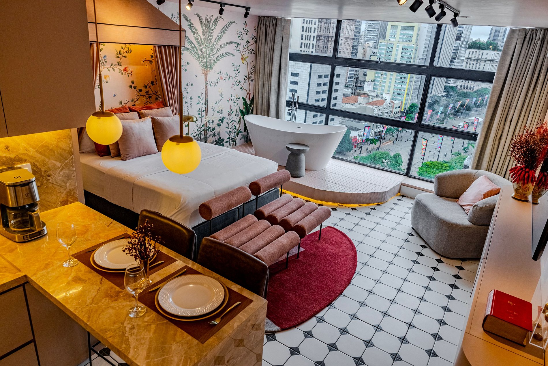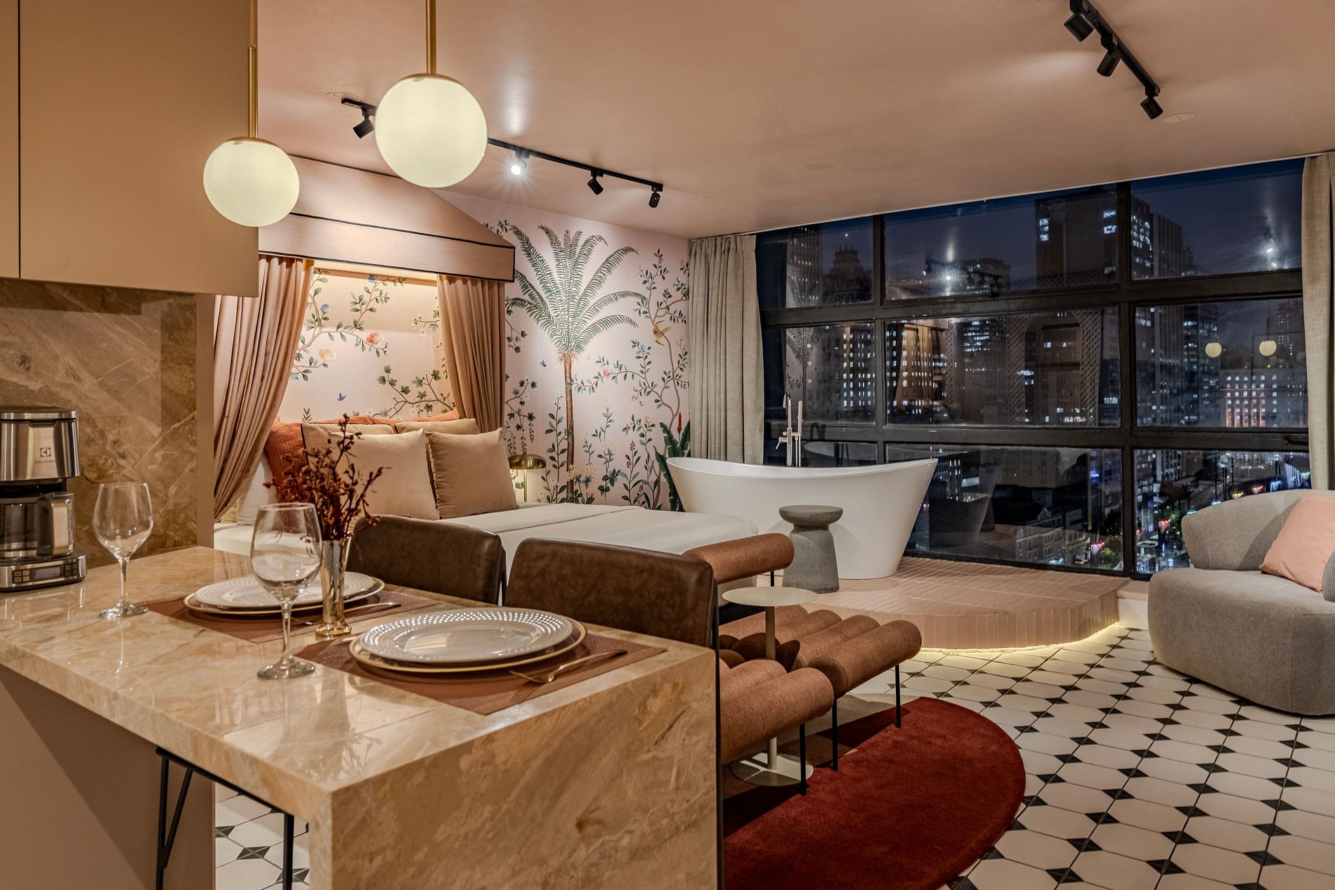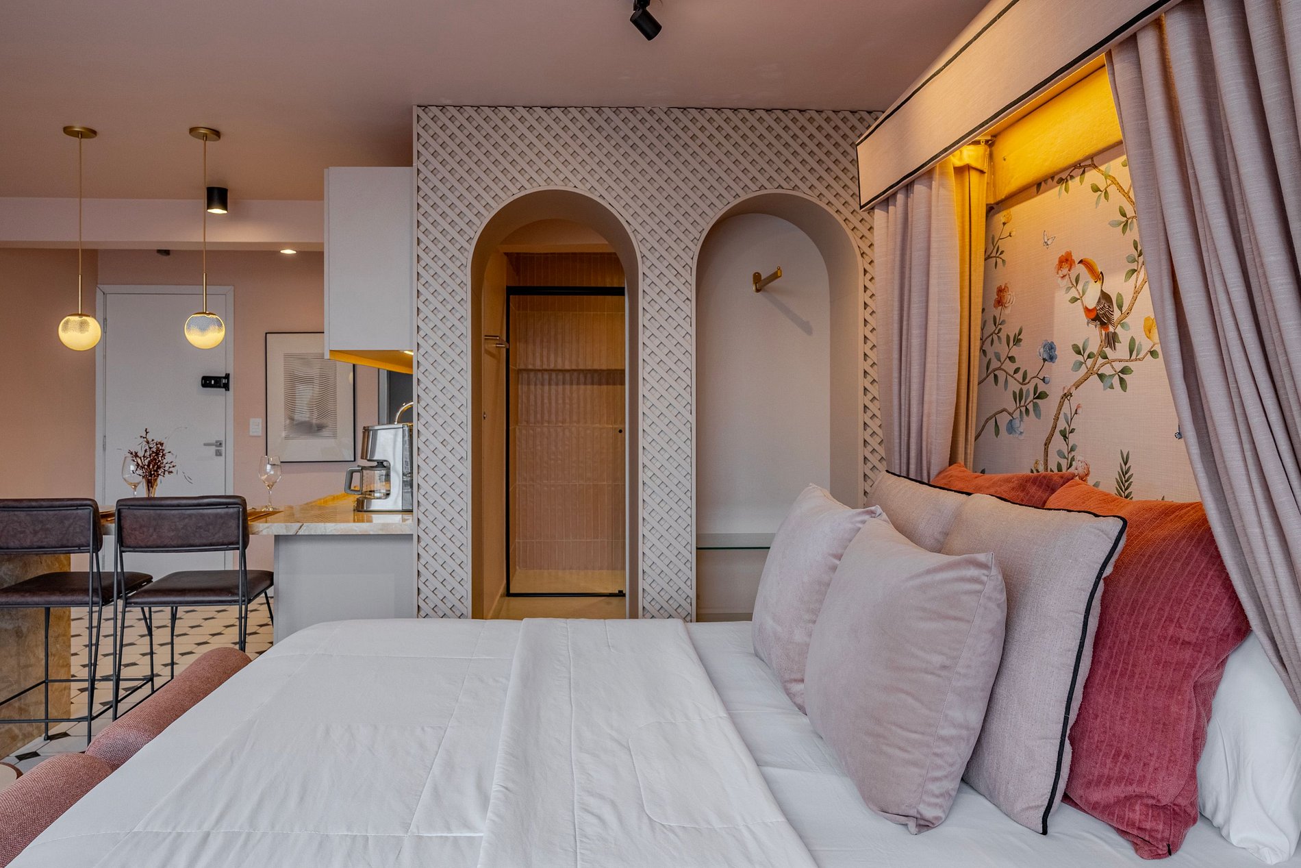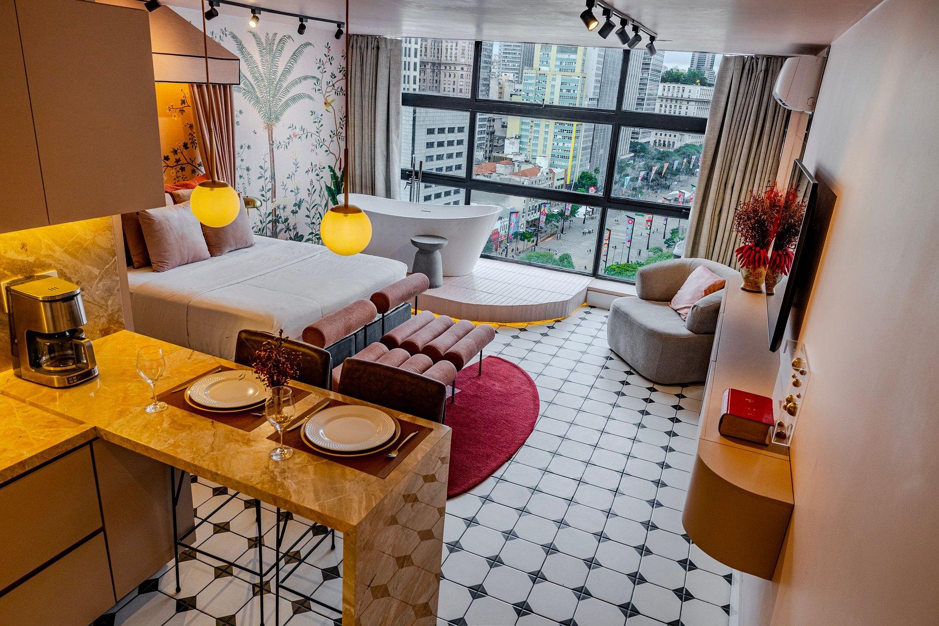 Cada cantinho do apartamento é adornado com toques de glamour, desde luminárias elegantes até acessórios decorativos inspirados no mundo da moda. Desfrute do quarto com cama queen super confortável e roupas de cama finas, garantindo uma noite de sono revigorante.