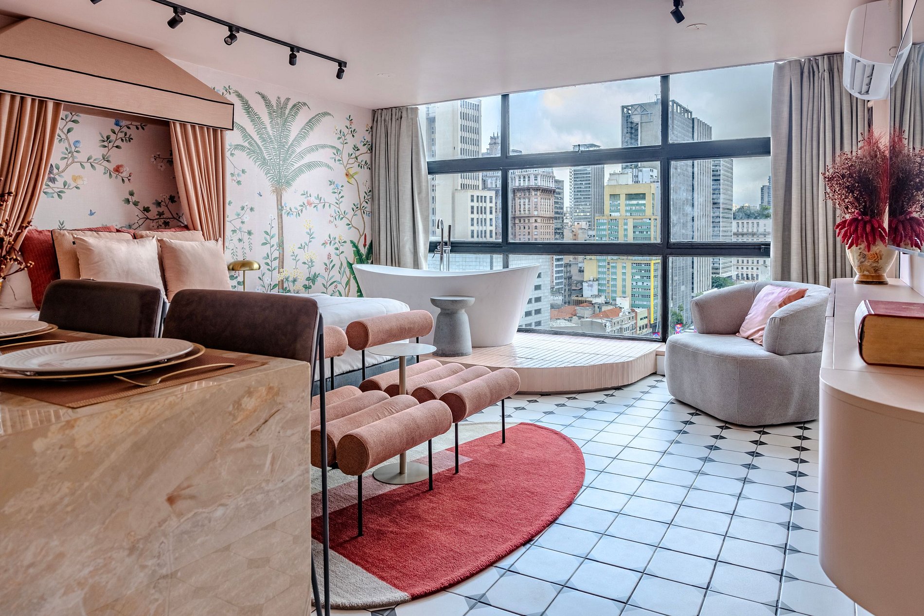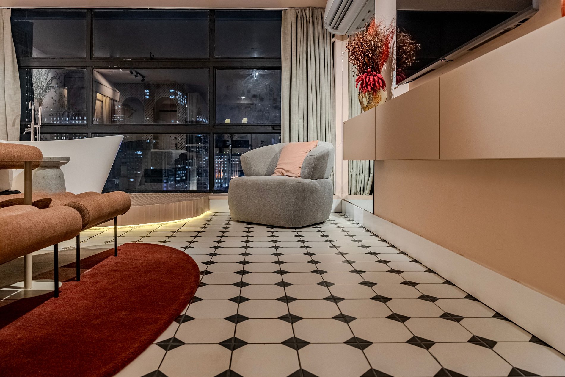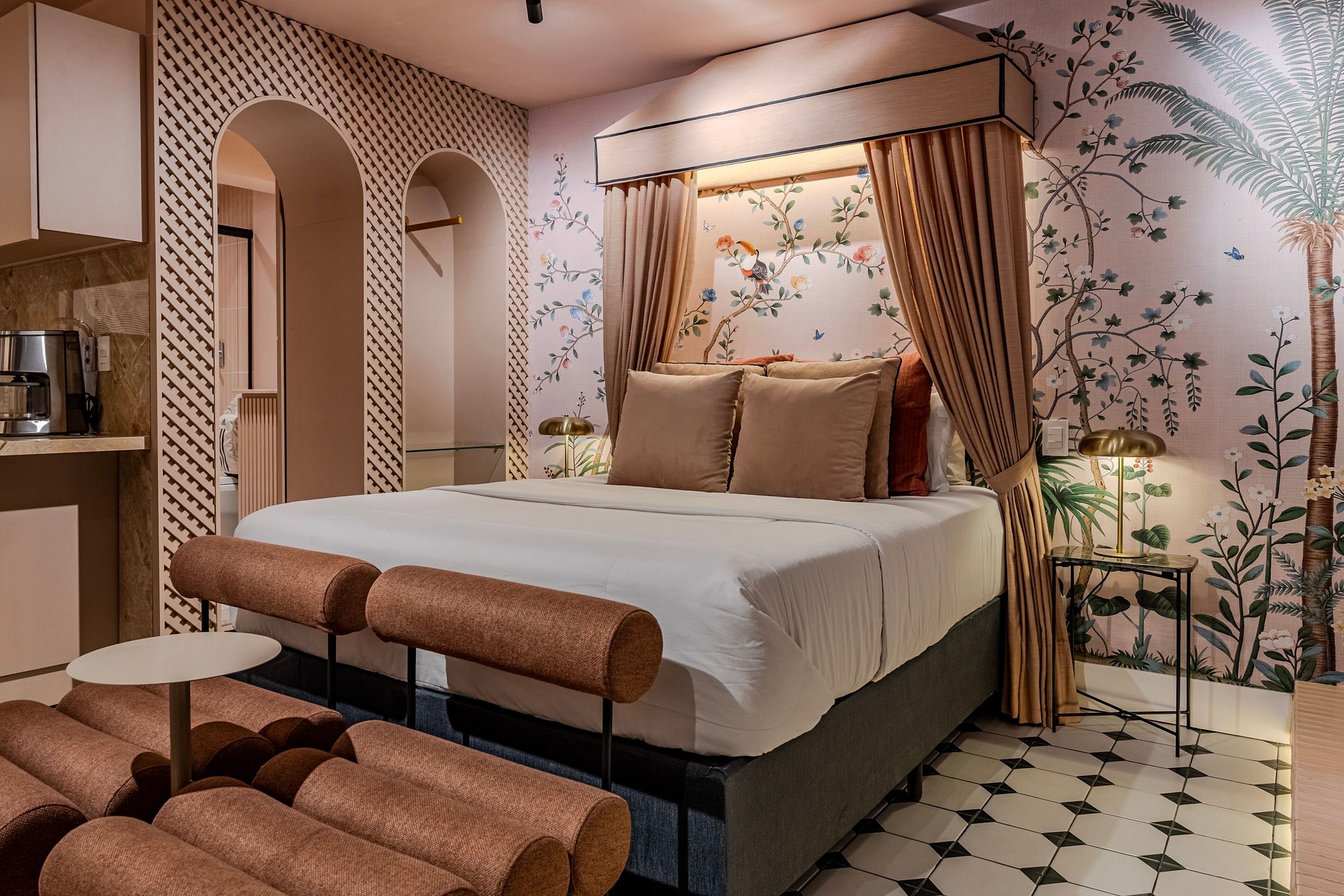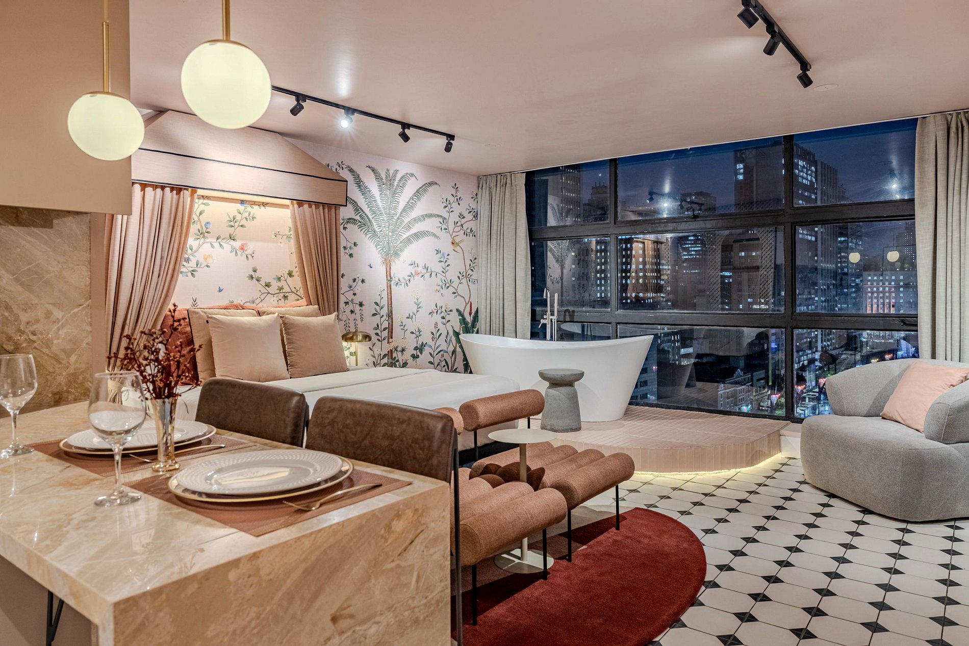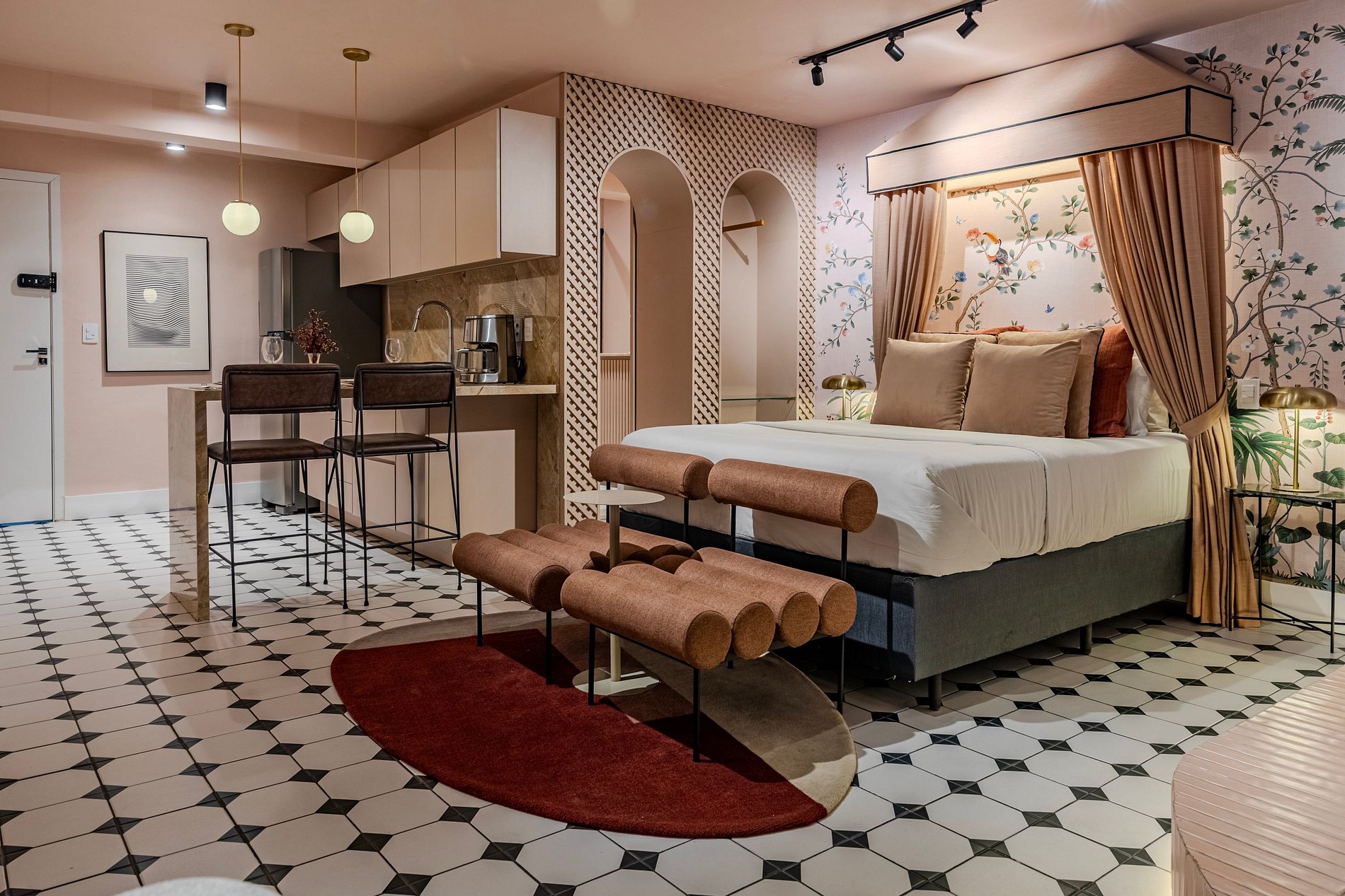Cada cantinho do apartamento é adornado com toques de glamour, desde luminárias elegantes até acessórios decorativos inspirados no mundo da moda. Desfrute do quarto com cama queen super confortável e roupas de cama finas, garantindo uma noite de sono revigorante.