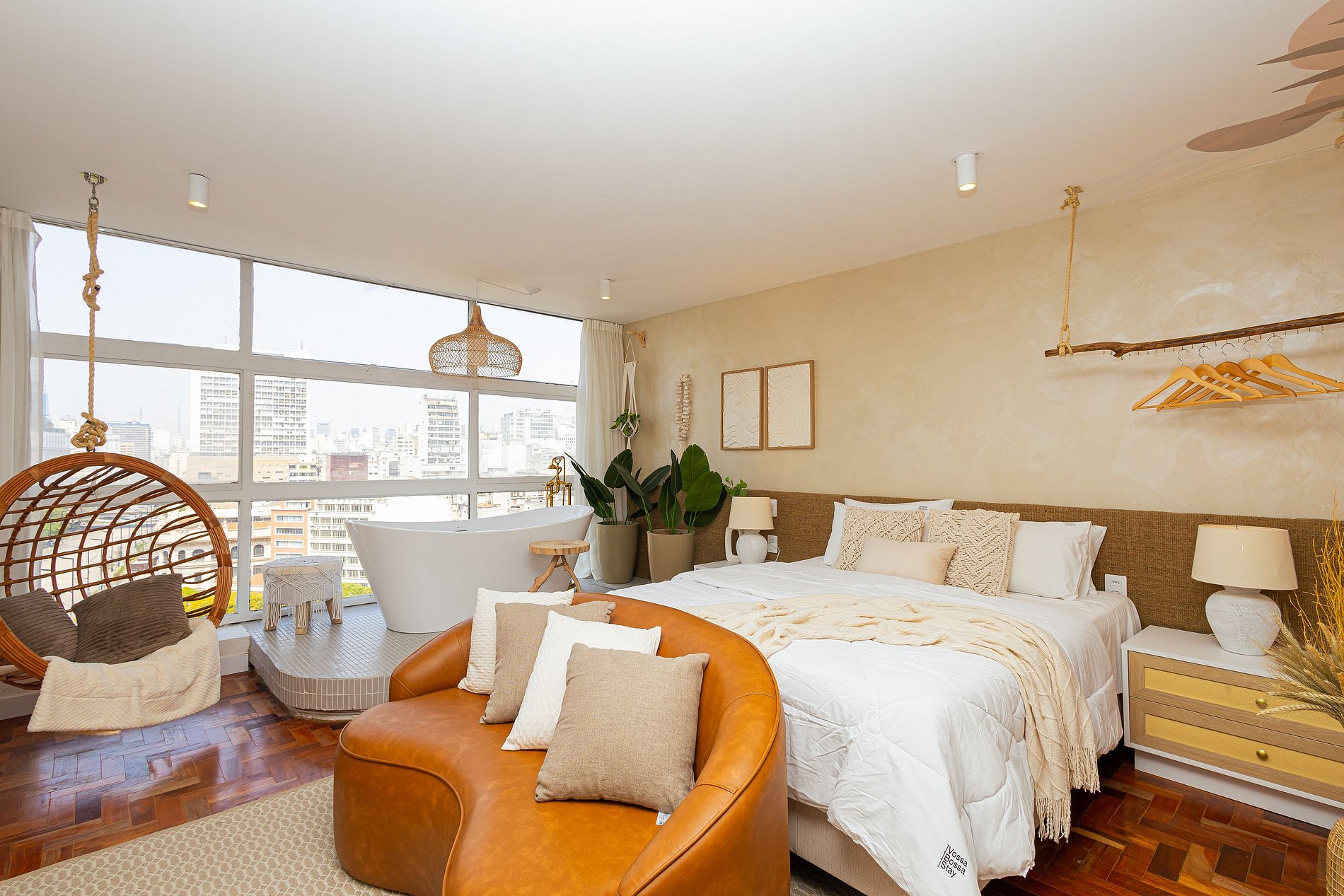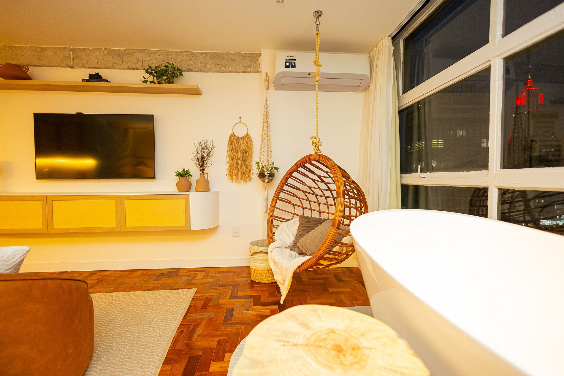 Experimente o romance e a magia do Ancestral SampaSky, um estúdio encantador no 19° andar do histórico Edifício Mirante do Vale. Imagine-se relaxando em uma banheira com design orgânico, estrategicamente posicionada ao lado de uma janela enorme, onde a vista espetacular do Viaduto Santa Ifigênia se torna parte do seu cenário particular.Com um projeto que une ancestralidade e modernidade, cada detalhe foi cuidadosamente escolhido para criar um ambiente acolhedor e inspirador.