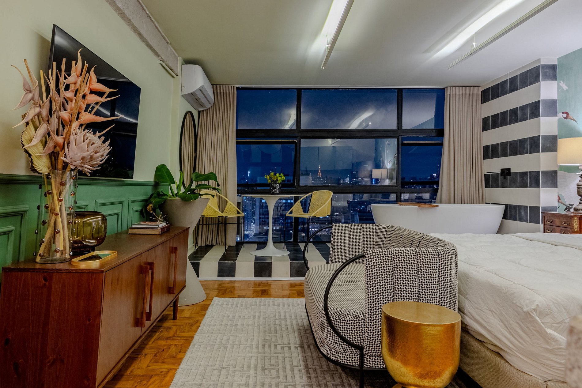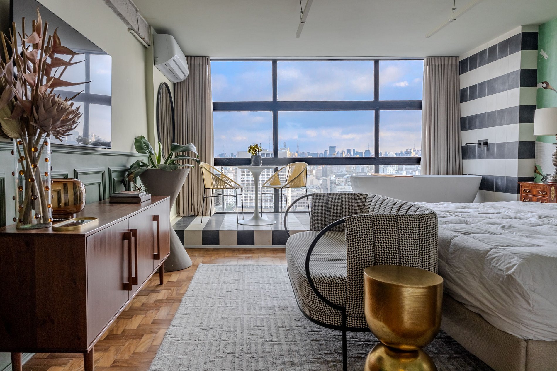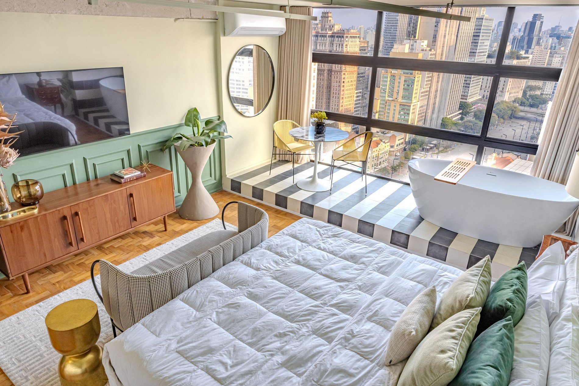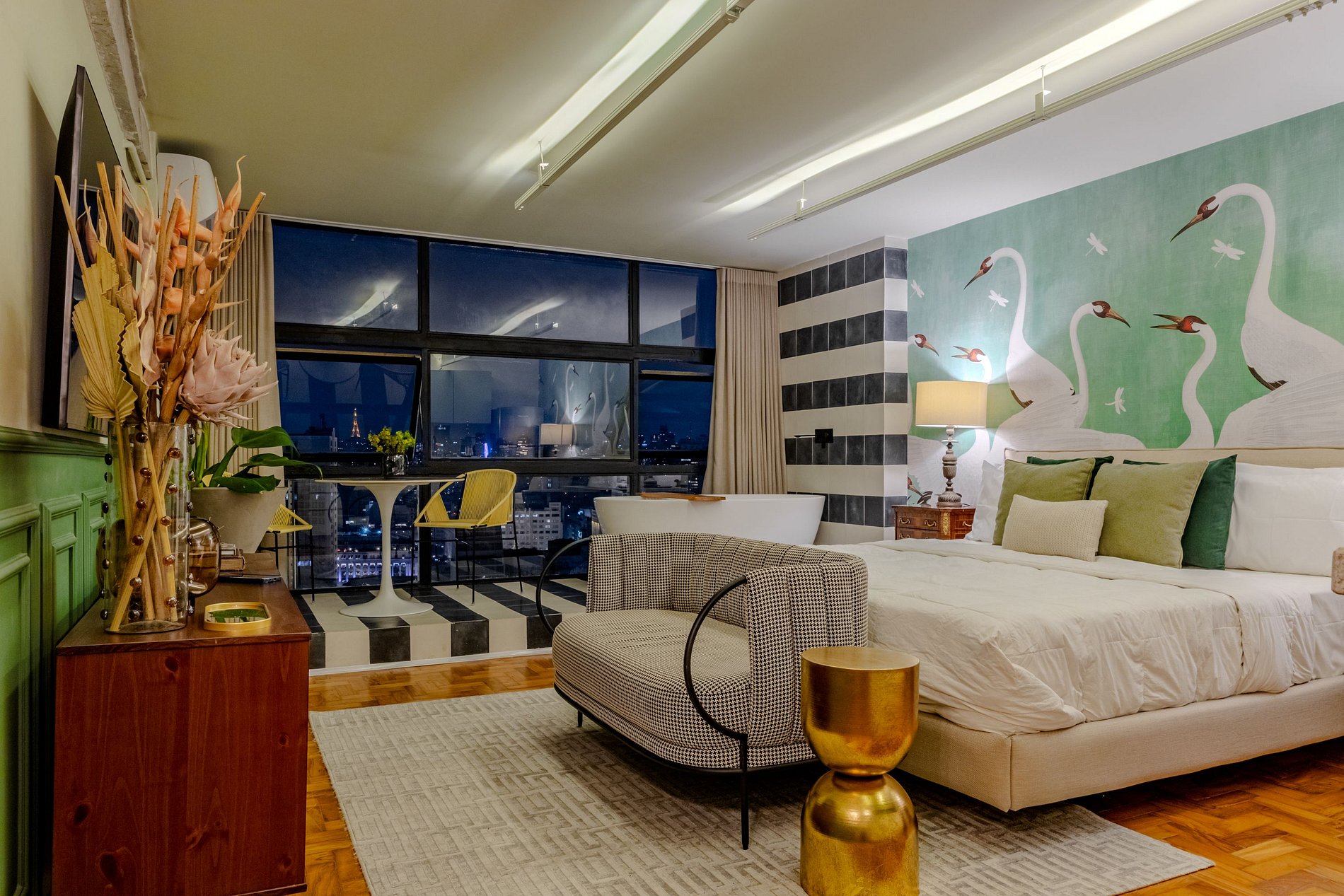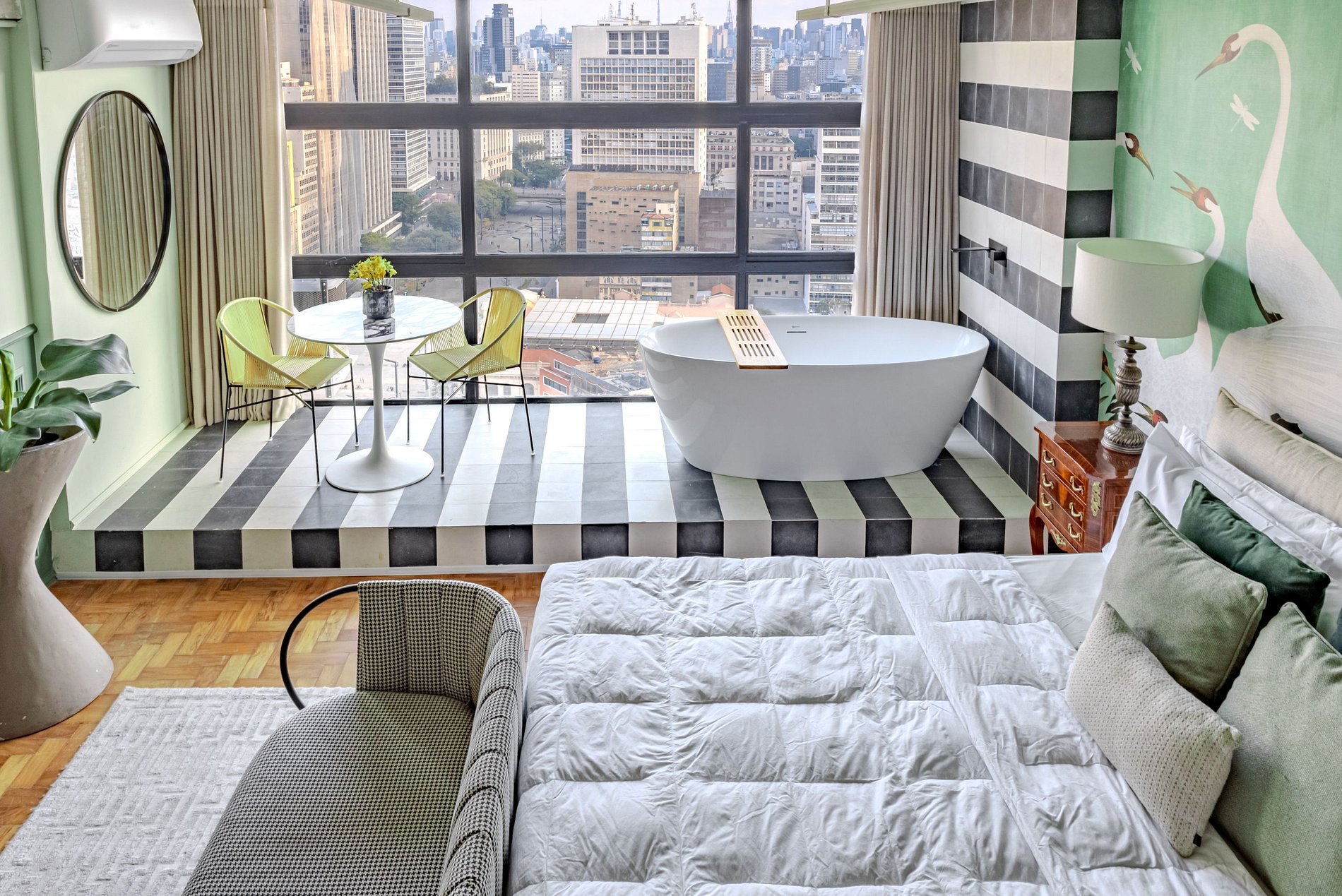 Mirante Sampa Sky Spa, design que mescla arquitetura contemporânea e decoração clássica. O espaço conta com piso de taco, boiseries elegantes e um lindo papel de parede artístico impactante. A paleta de tons verdes e neutros cria uma atmosfera refinada. Cozinha compacta e funcional, mobília curada e uma luxuosa banheira garantem conforto e exclusividade, com uma vista panorâmica de tirar o fôlego.
