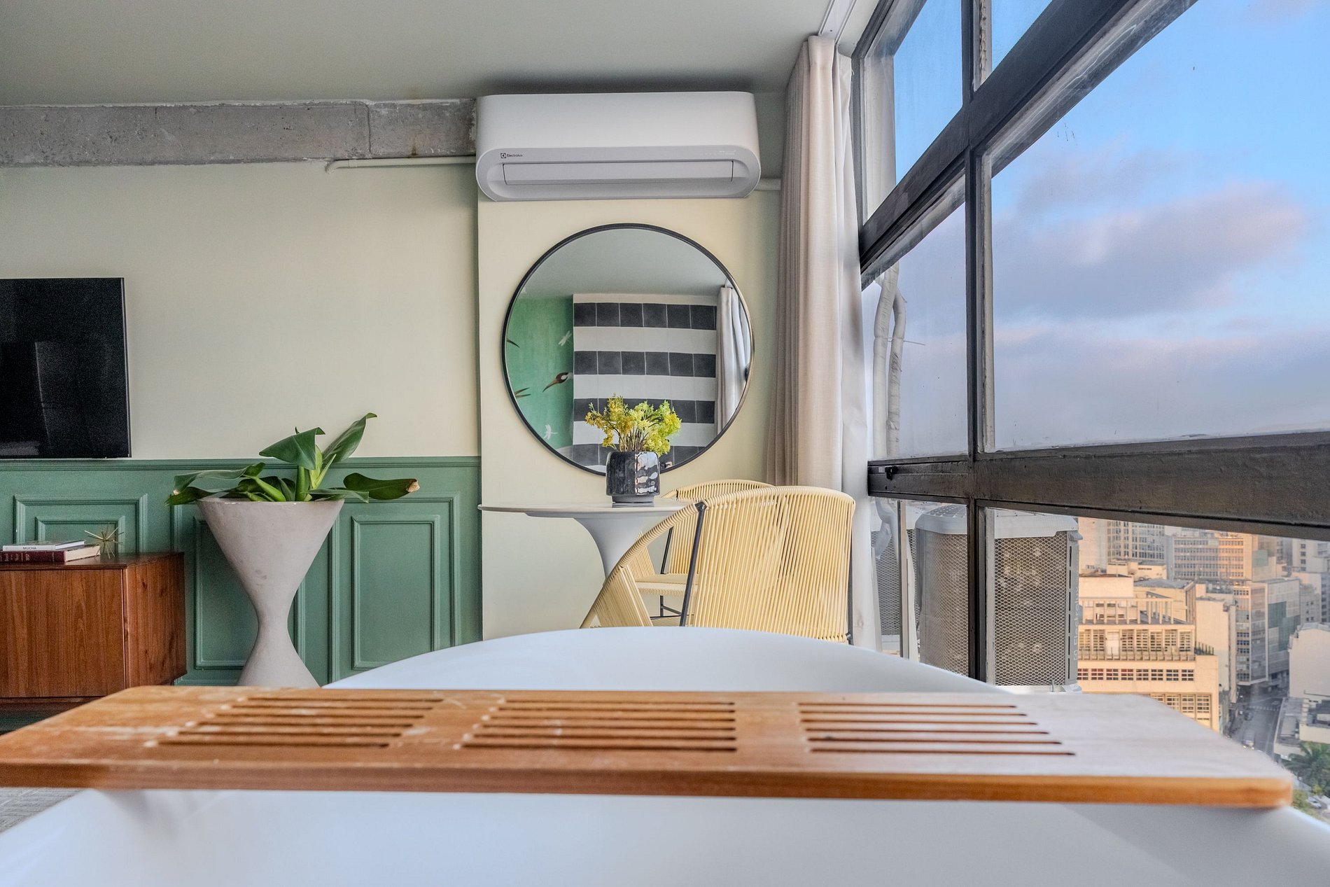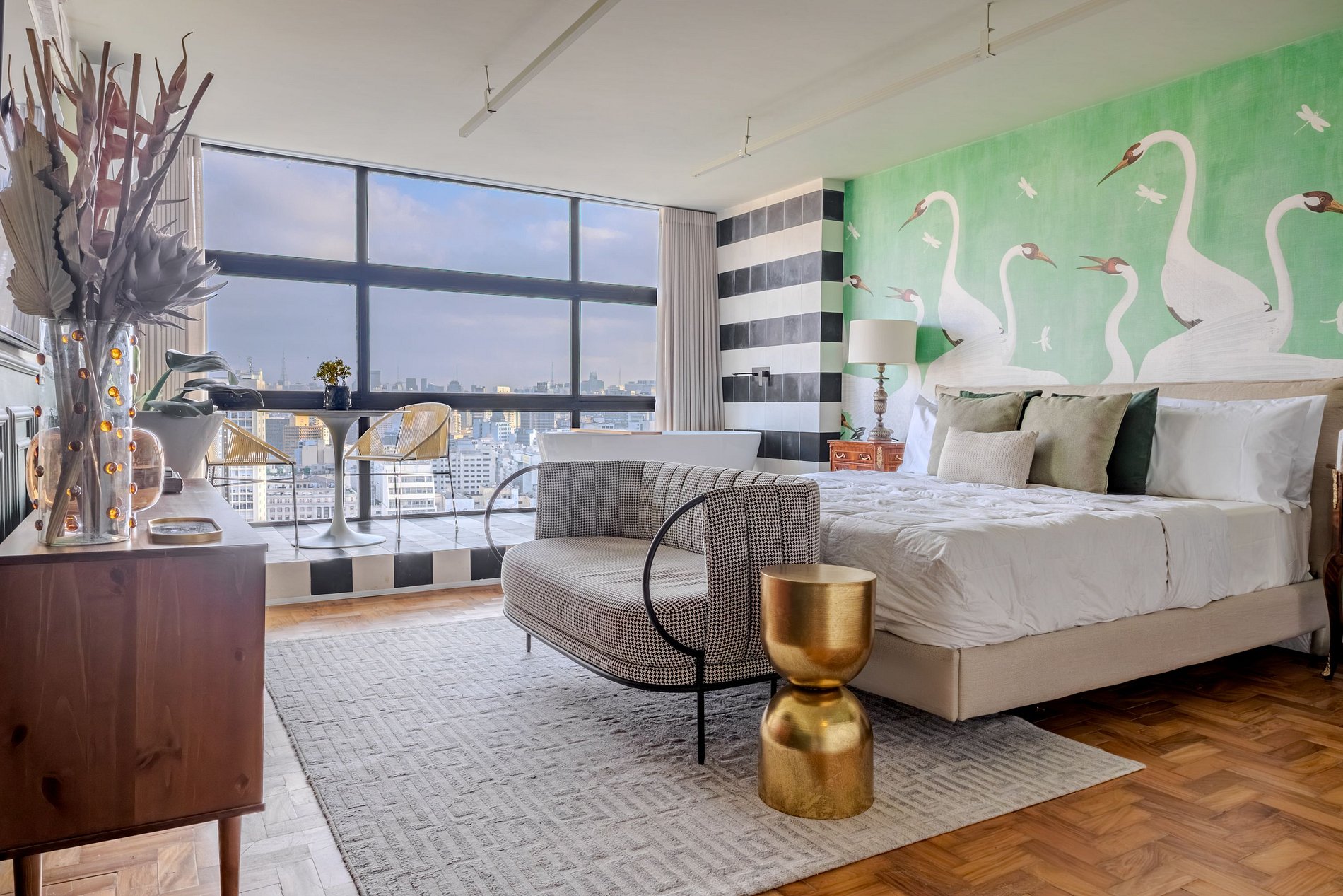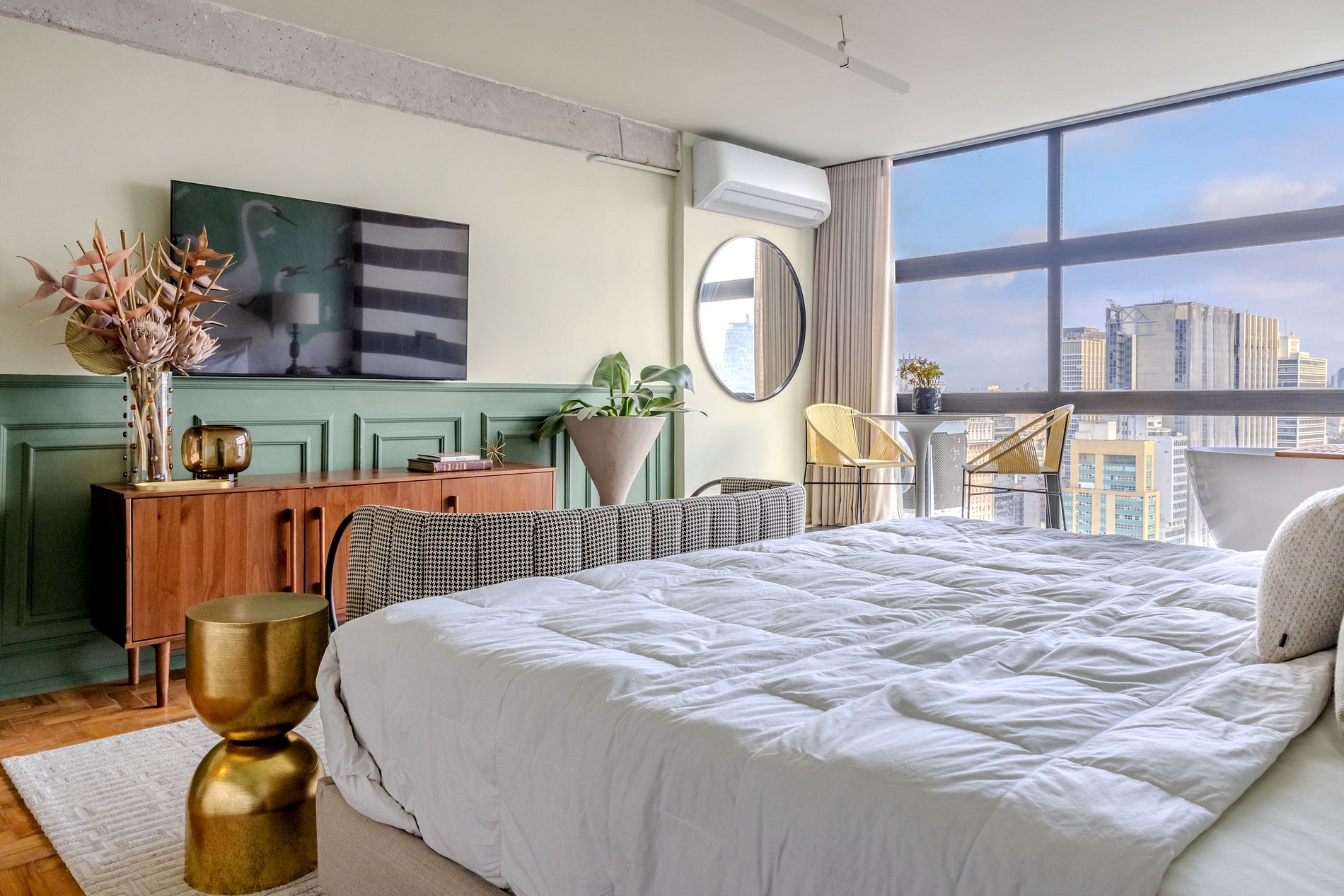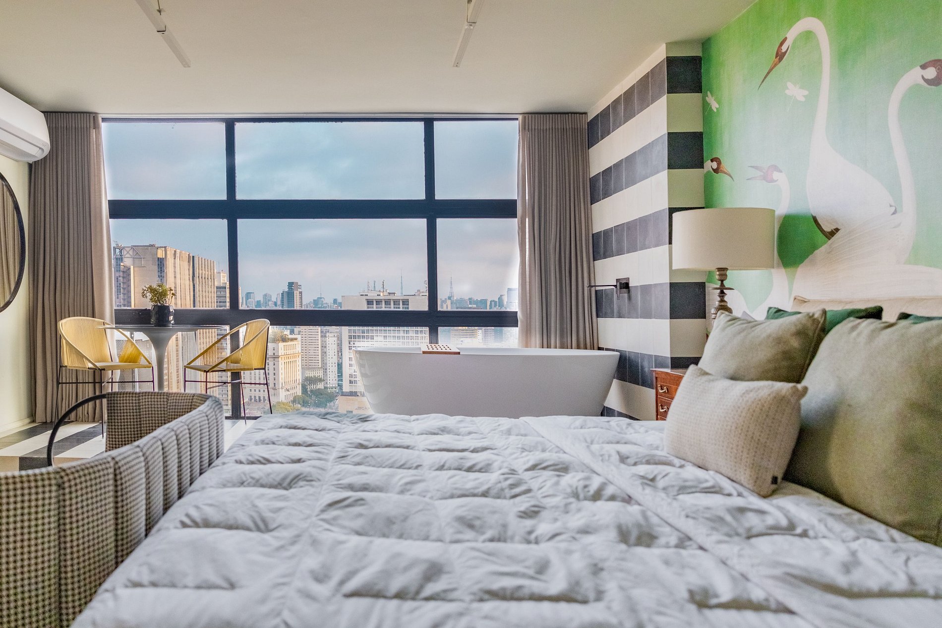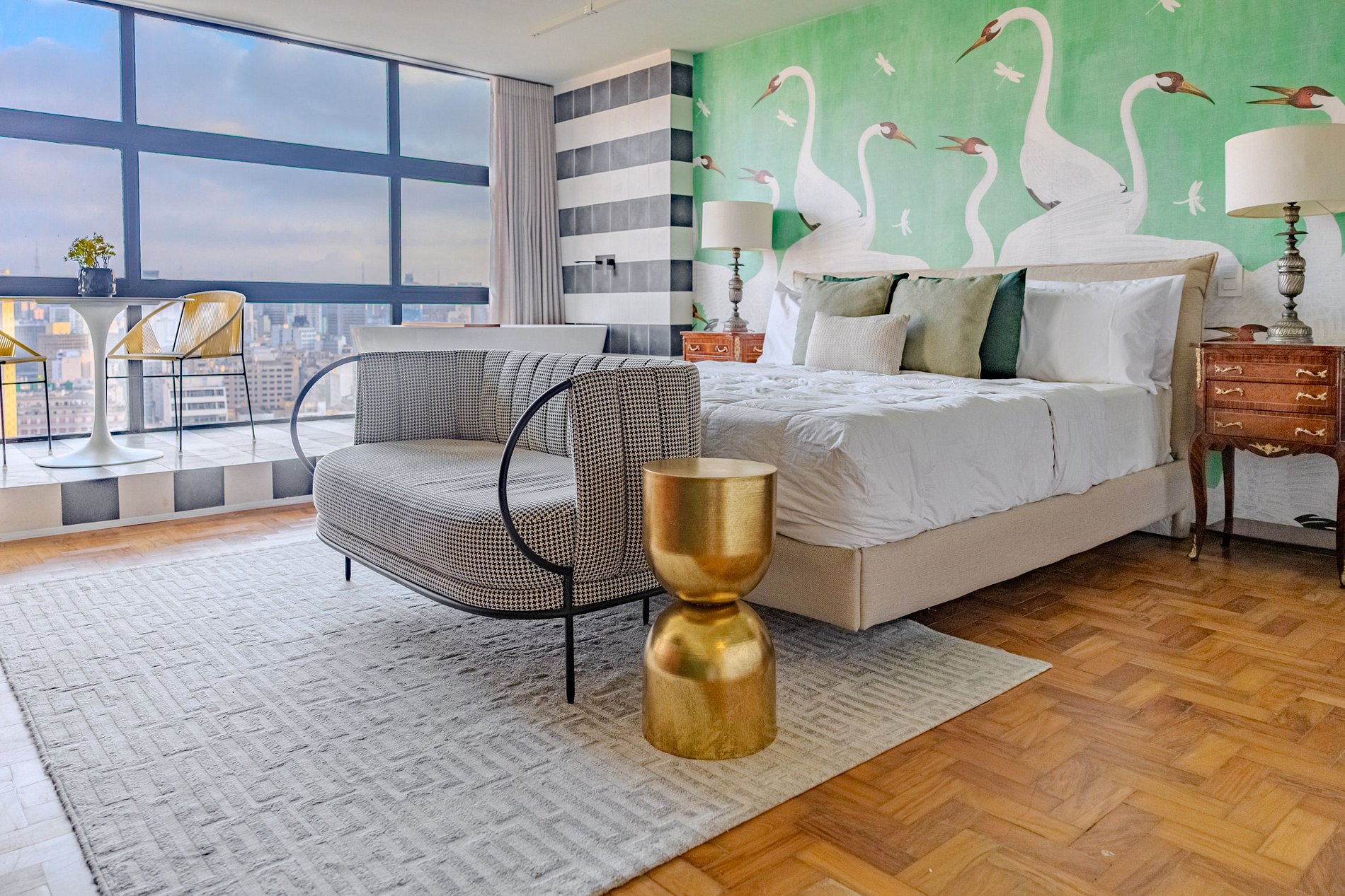 Mirante Sampa Sky Spa, design que mescla arquitetura contemporânea e decoração clássica. O espaço conta com piso de taco, boiseries elegantes e um lindo papel de parede artístico impactante. A paleta de tons verdes e neutros cria uma atmosfera refinada. Cozinha compacta e funcional, mobília curada e uma luxuosa banheira garantem conforto e exclusividade, com uma vista panorâmica de tirar o fôlego.