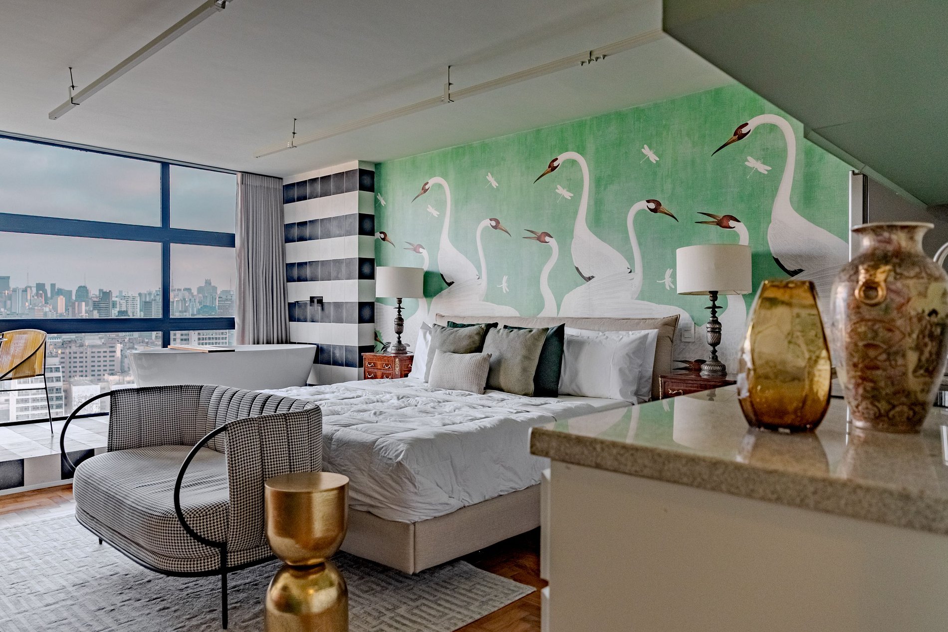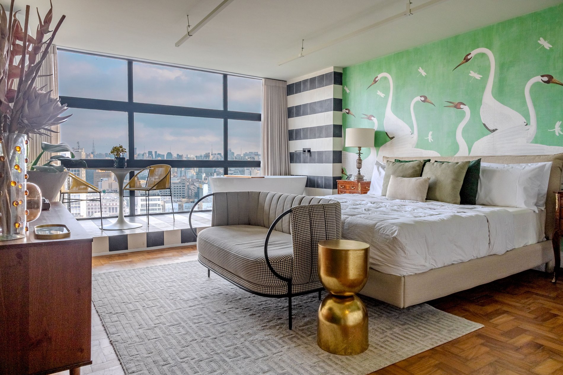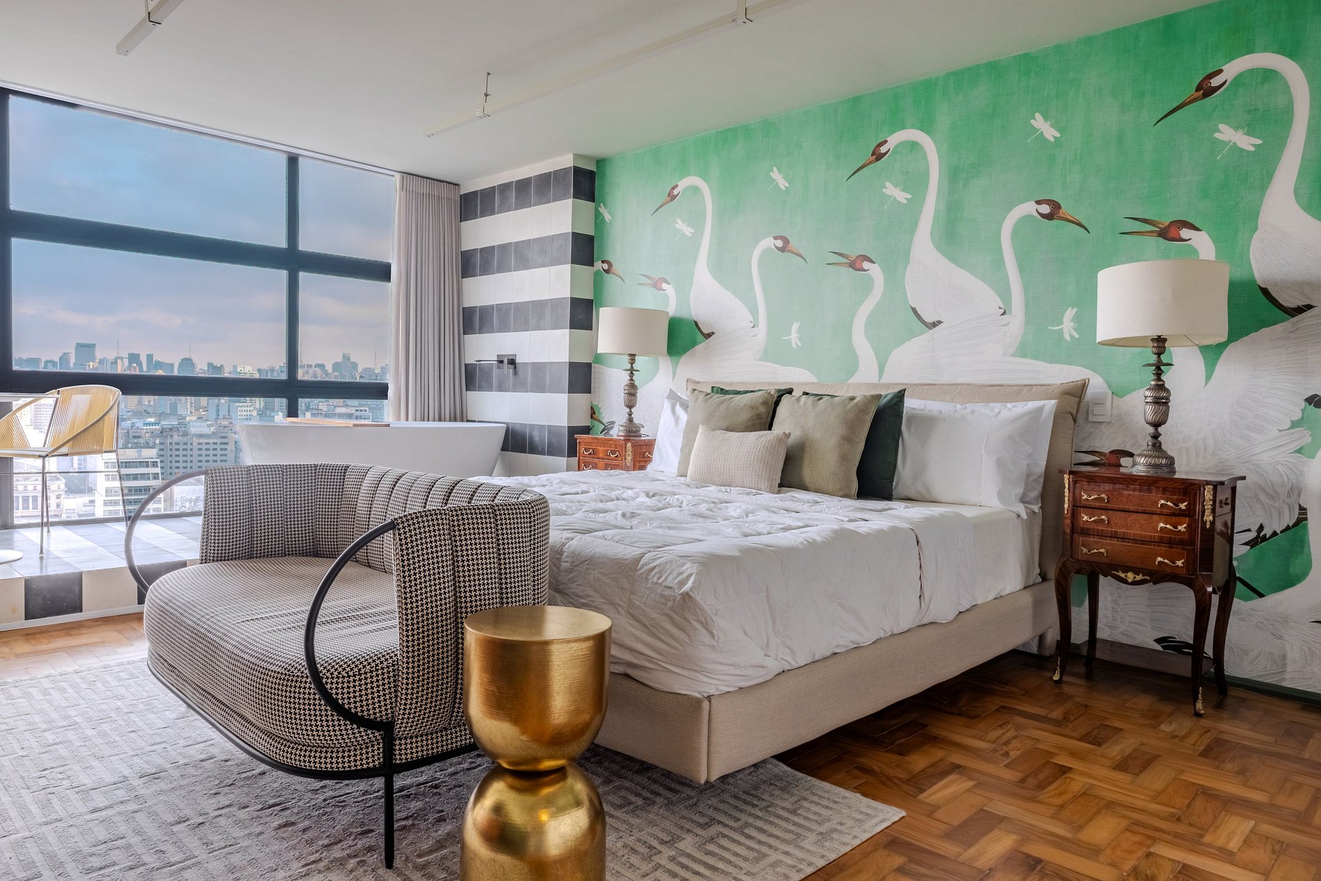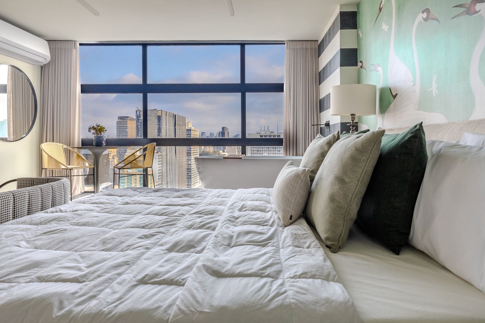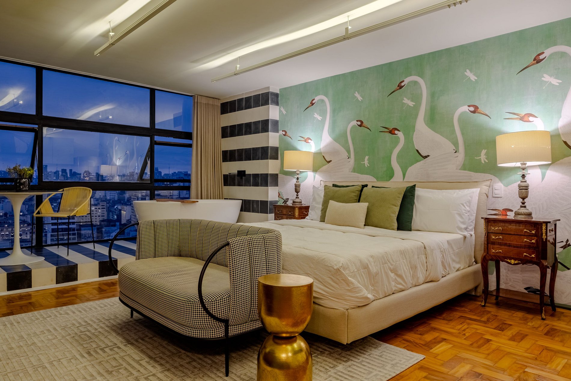 Mirante Sampa Sky Spa, design que mescla arquitetura contemporânea e decoração clássica. O espaço conta com piso de taco, boiseries elegantes e um lindo papel de parede artístico impactante. A paleta de tons verdes e neutros cria uma atmosfera refinada. Cozinha compacta e funcional, mobília curada e uma luxuosa banheira garantem conforto e exclusividade, com uma vista panorâmica de tirar o fôlego.