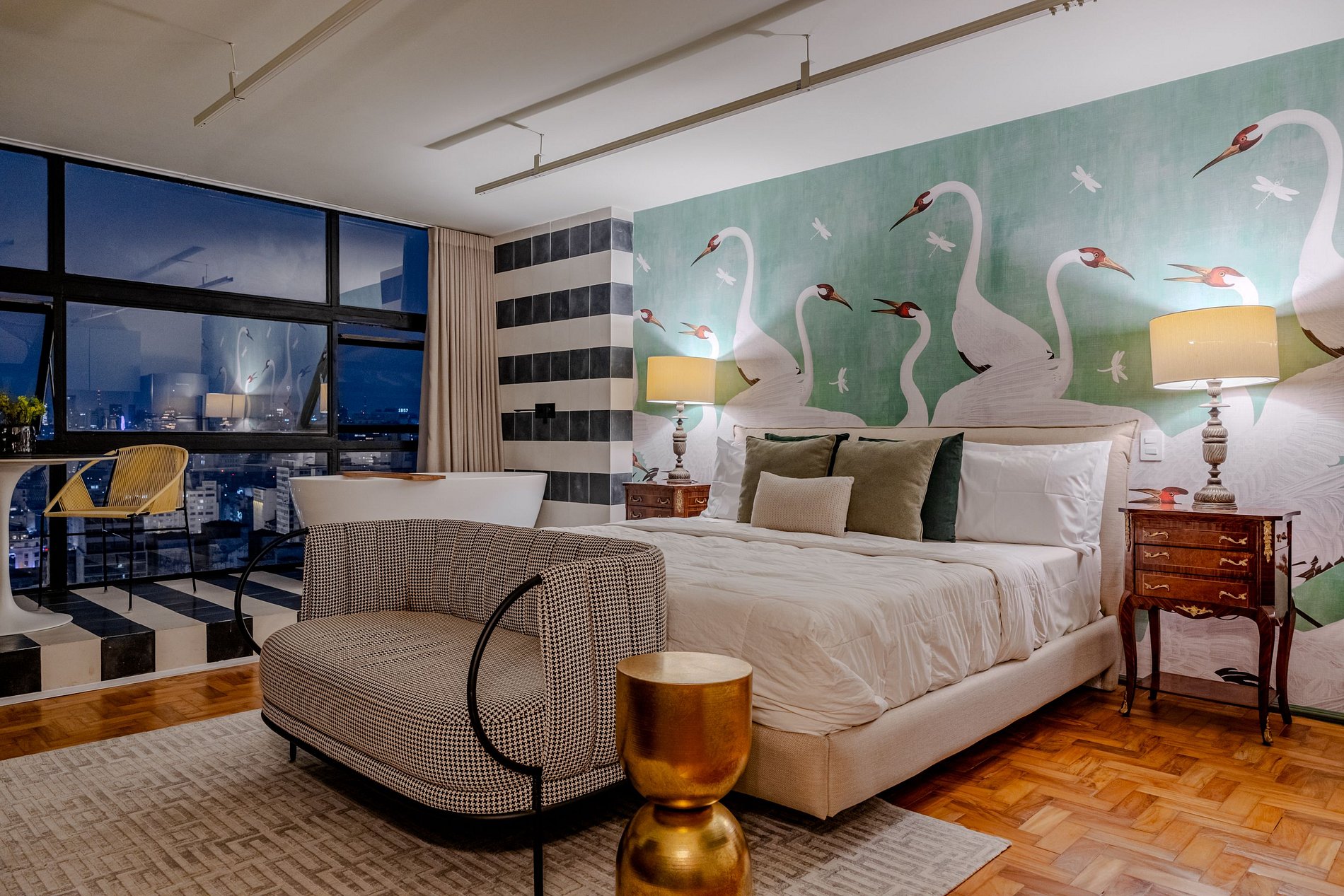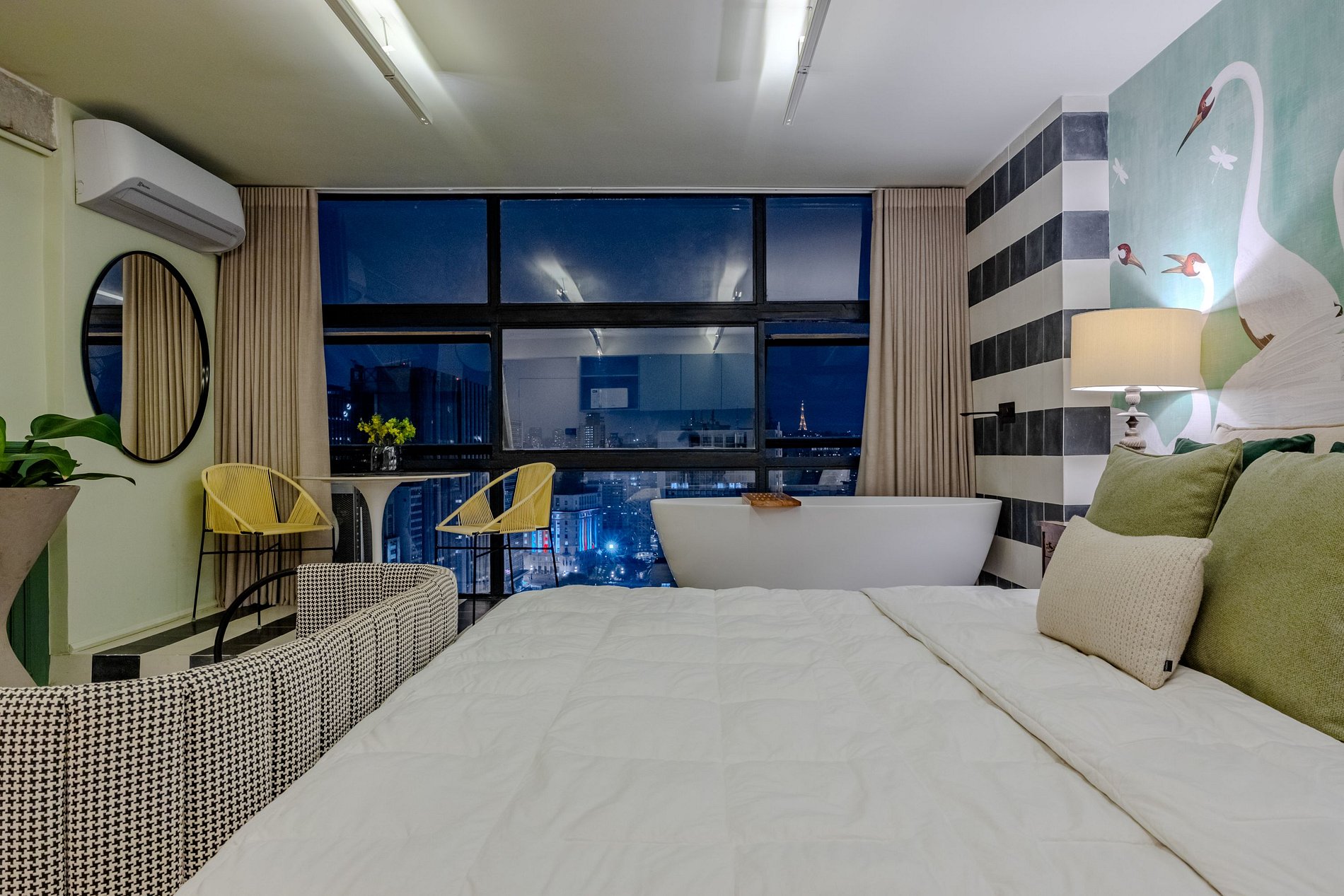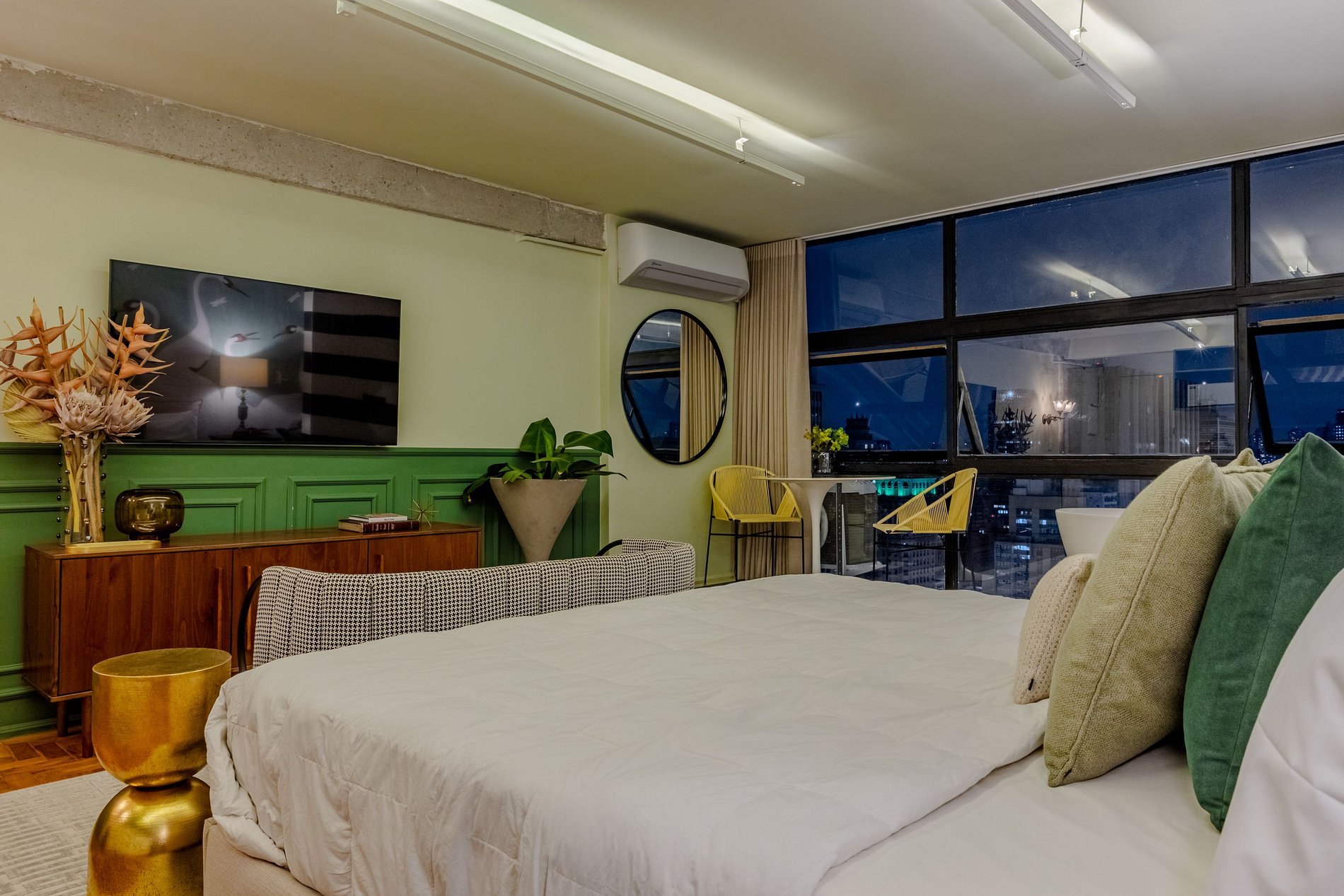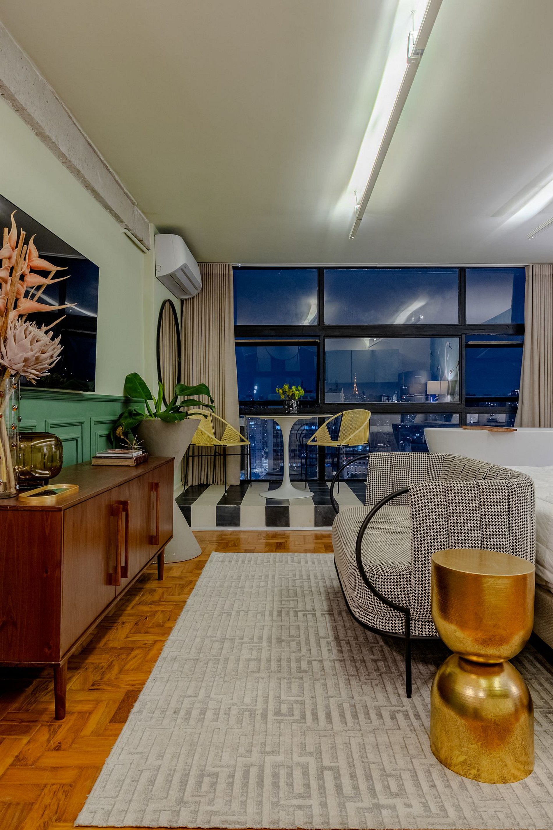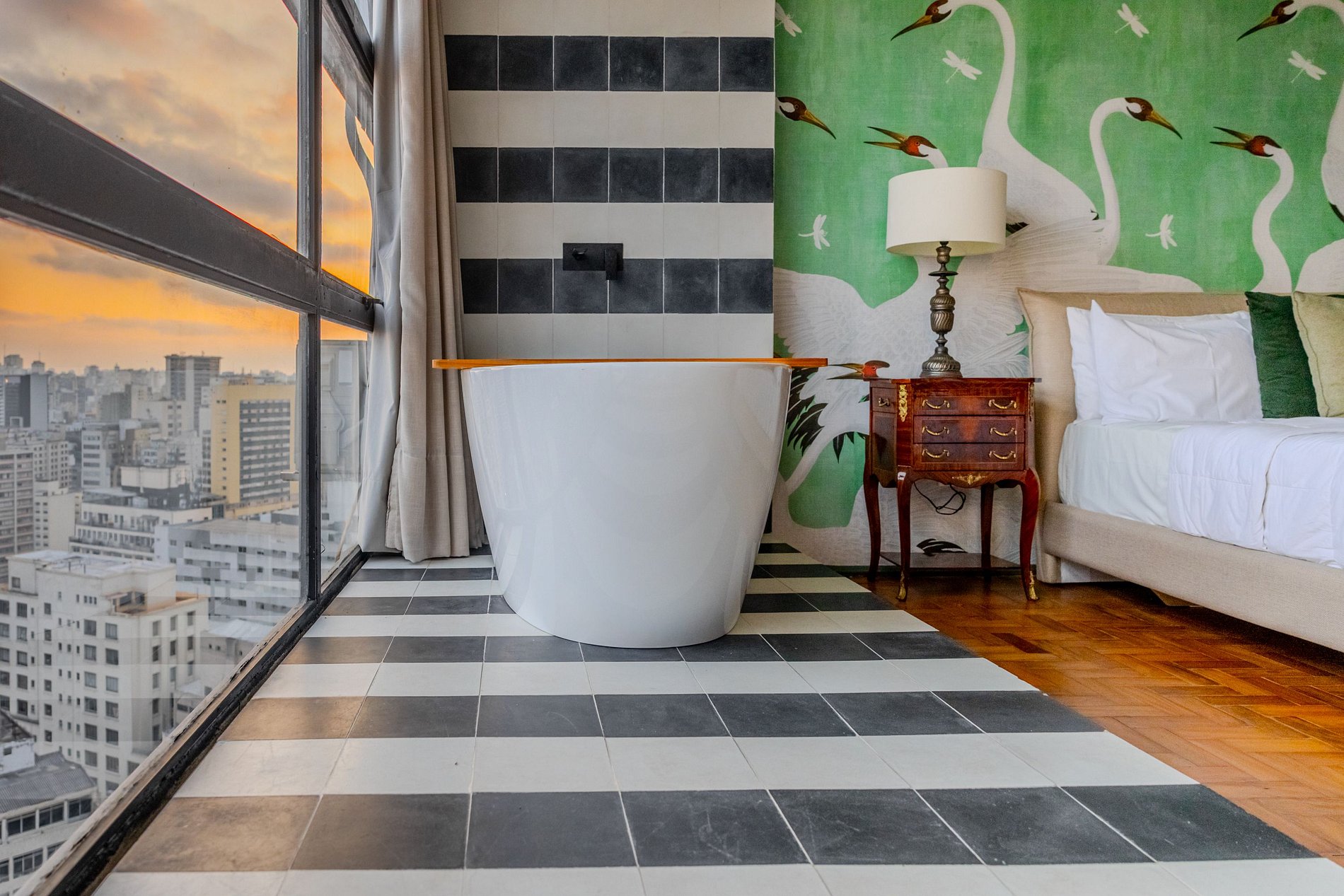 Mirante Sampa Sky Spa, design que mescla arquitetura contemporânea e decoração clássica. O espaço conta com piso de taco, boiseries elegantes e um lindo papel de parede artístico impactante. A paleta de tons verdes e neutros cria uma atmosfera refinada. Cozinha compacta e funcional, mobília curada e uma luxuosa banheira garantem conforto e exclusividade, com uma vista panorâmica de tirar o fôlego.