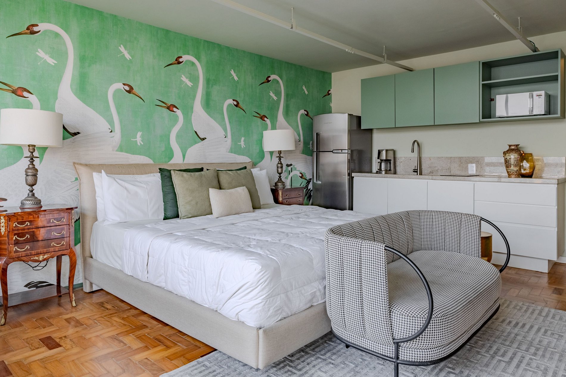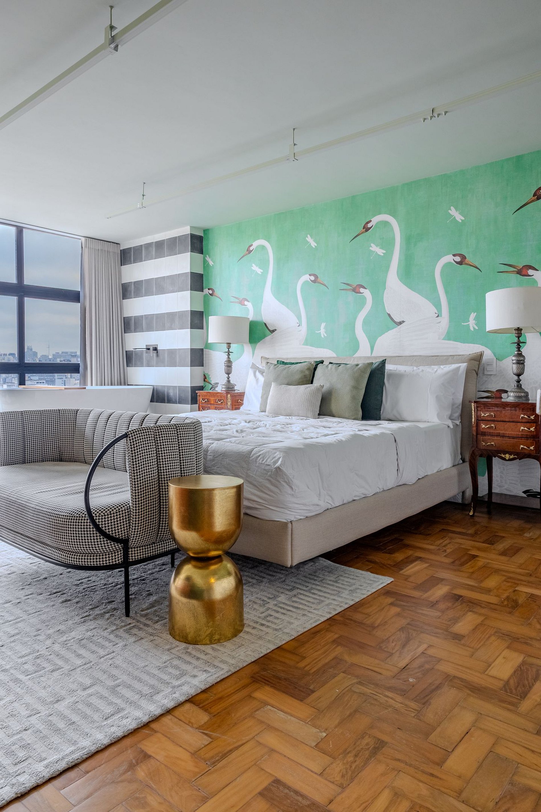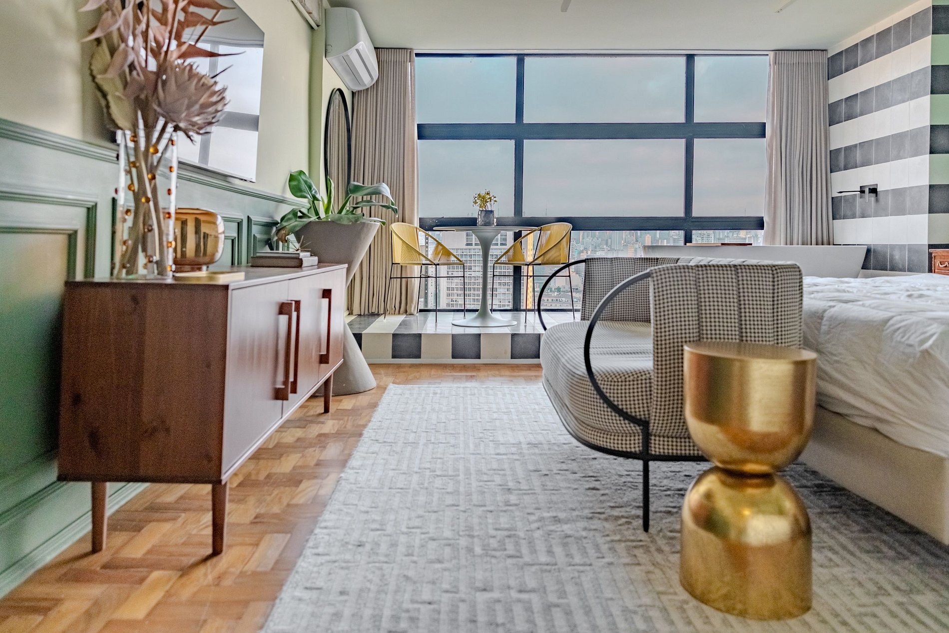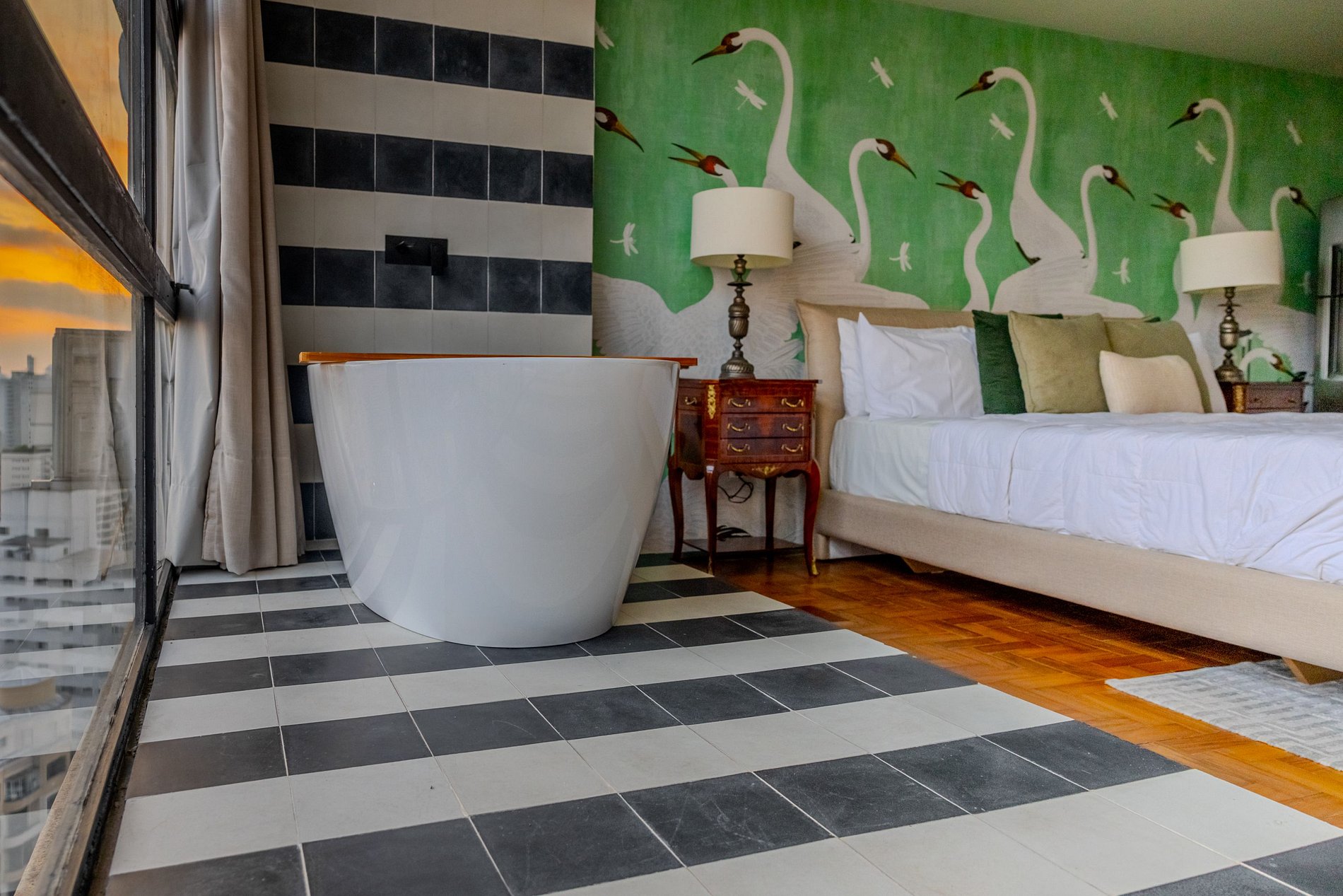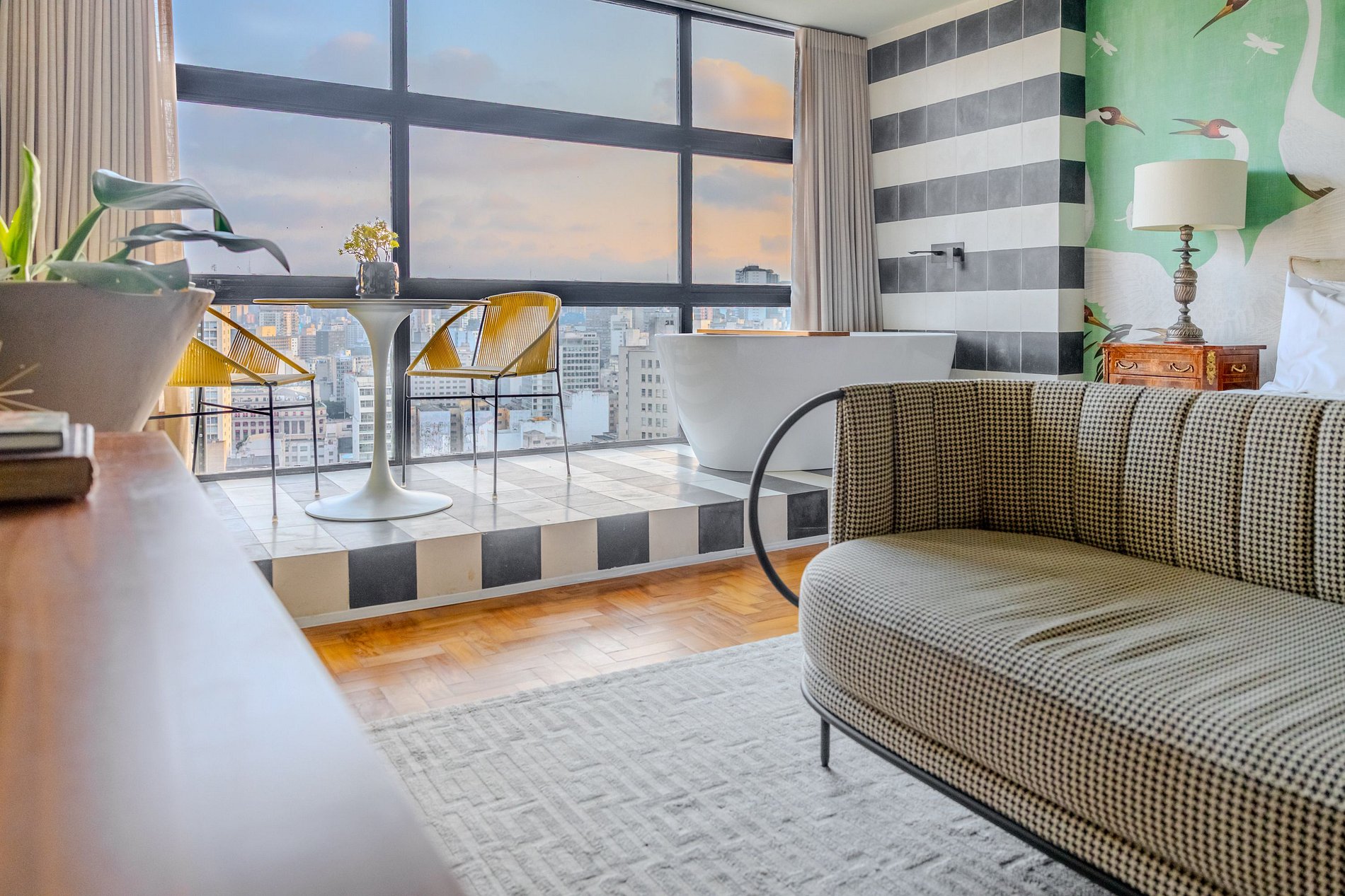 Mirante Sampa Sky Spa, design que mescla arquitetura contemporânea e decoração clássica. O espaço conta com piso de taco, boiseries elegantes e um lindo papel de parede artístico impactante. A paleta de tons verdes e neutros cria uma atmosfera refinada. Cozinha compacta e funcional, mobília curada e uma luxuosa banheira garantem conforto e exclusividade, com uma vista panorâmica de tirar o fôlego.