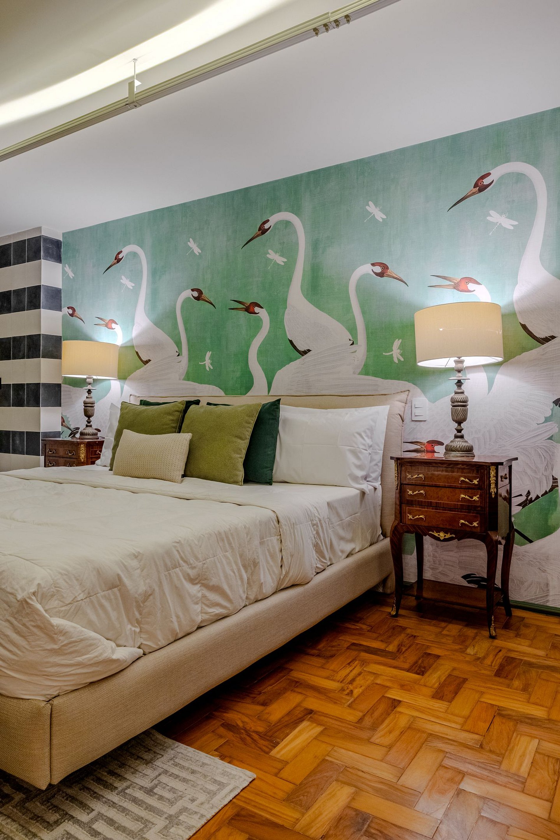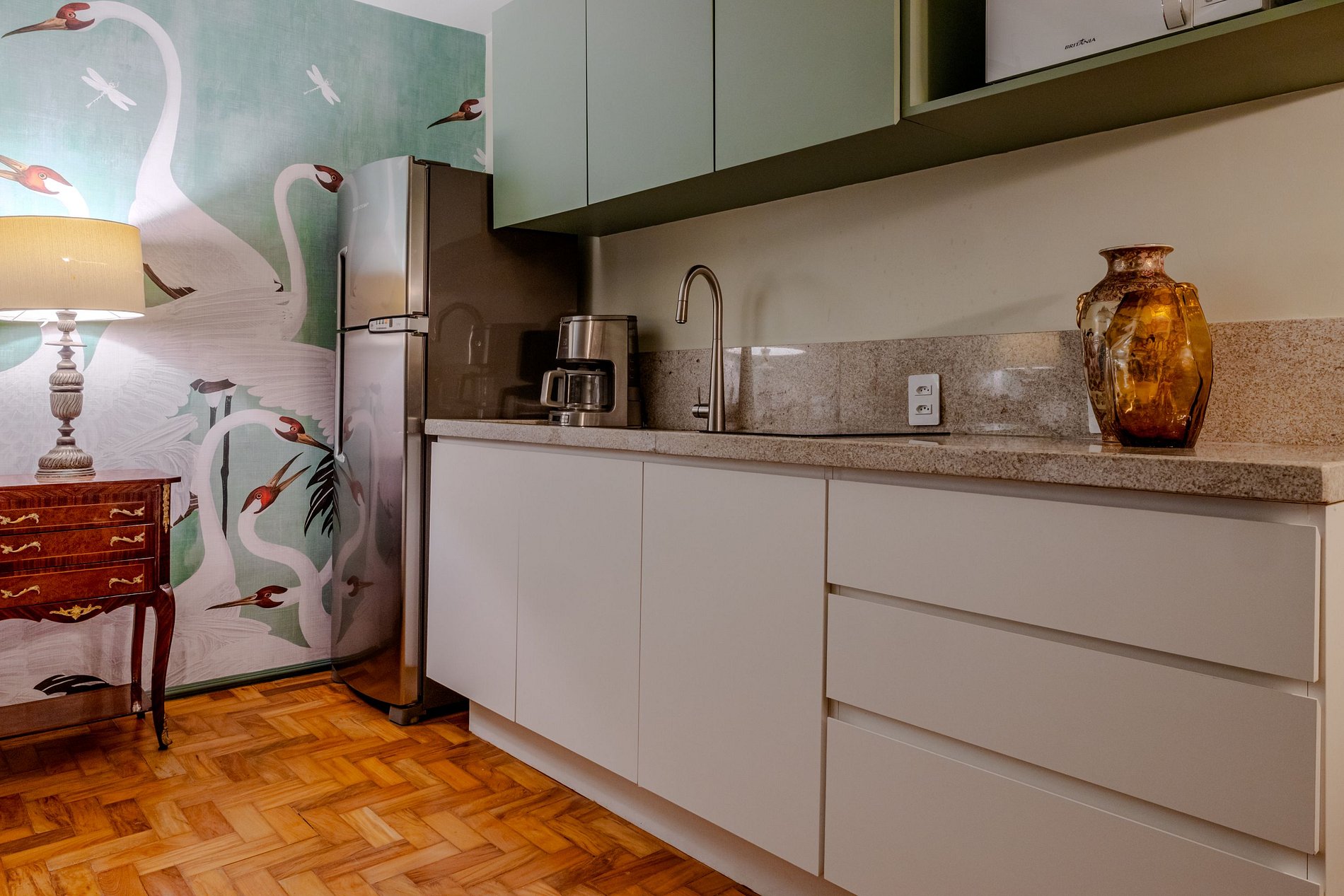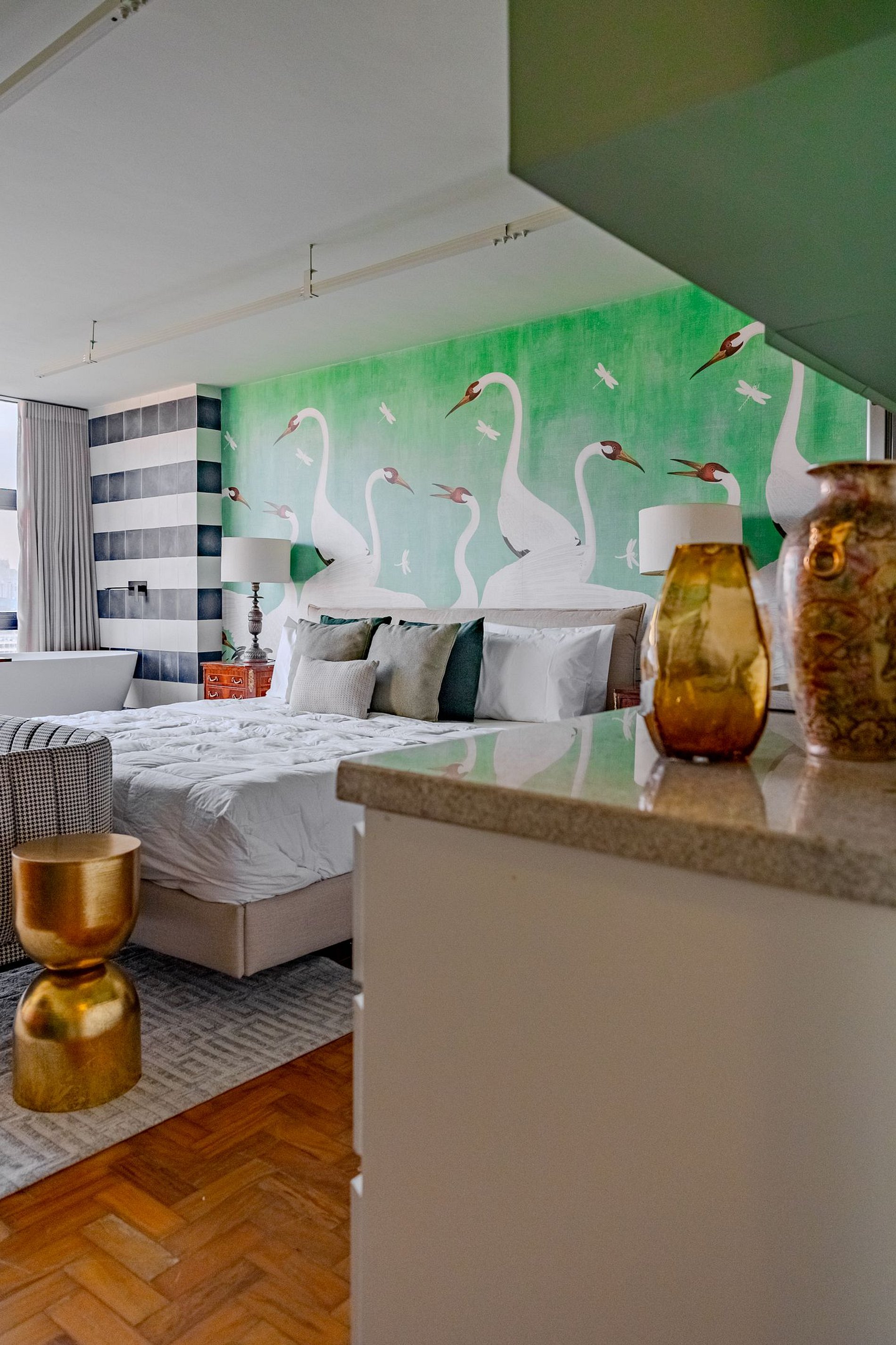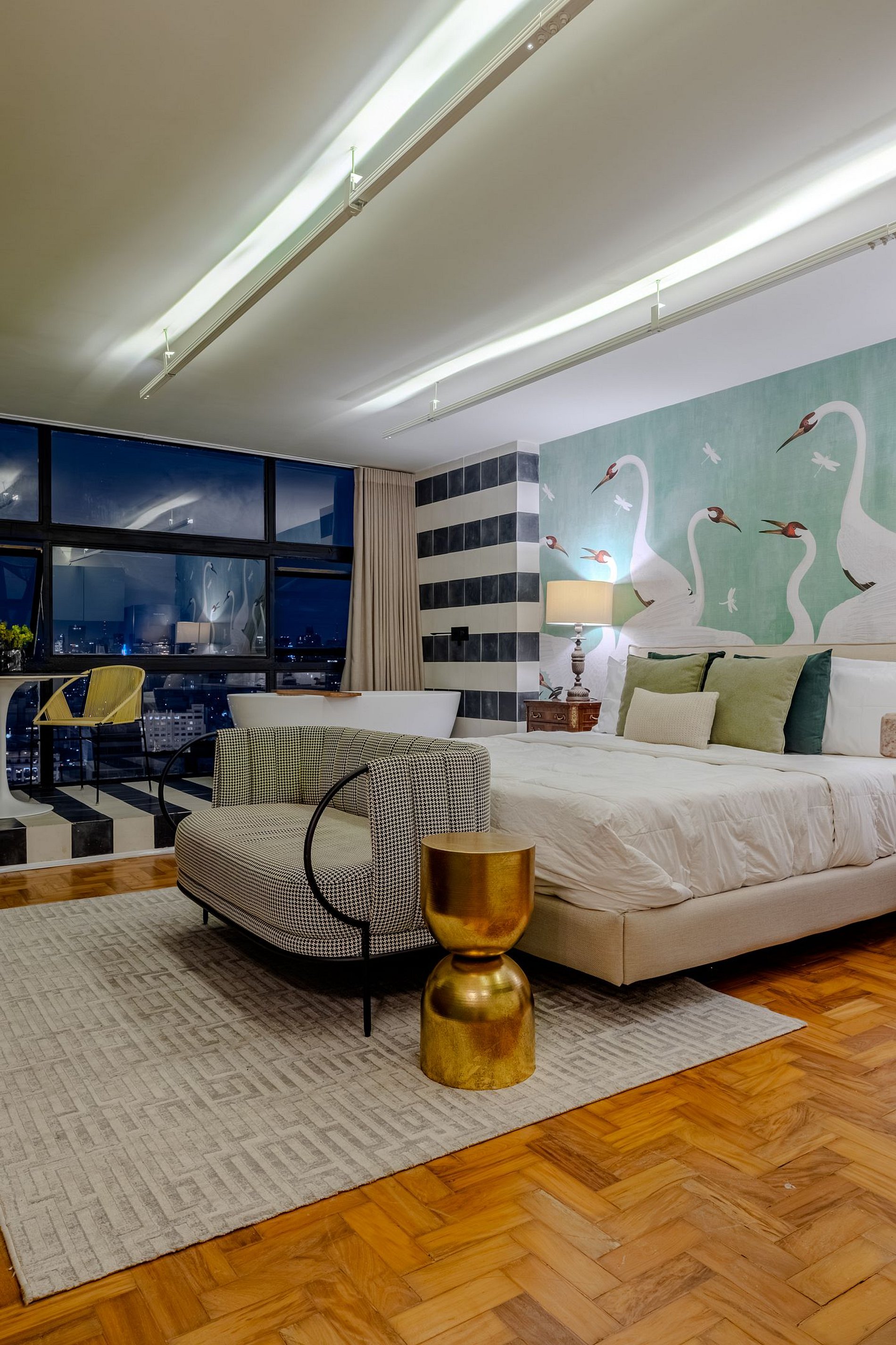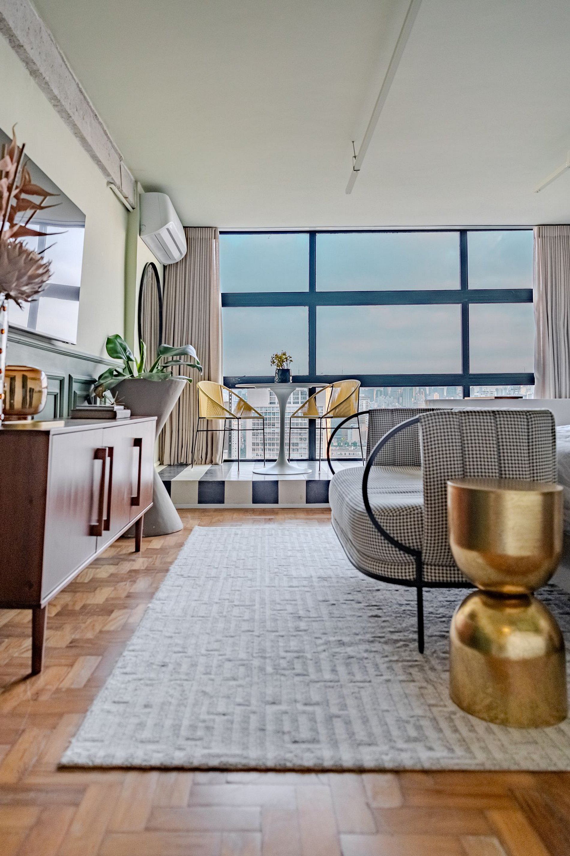 Mirante Sampa Sky Spa, design que mescla arquitetura contemporânea e decoração clássica. O espaço conta com piso de taco, boiseries elegantes e um lindo papel de parede artístico impactante. A paleta de tons verdes e neutros cria uma atmosfera refinada. Cozinha compacta e funcional, mobília curada e uma luxuosa banheira garantem conforto e exclusividade, com uma vista panorâmica de tirar o fôlego.
