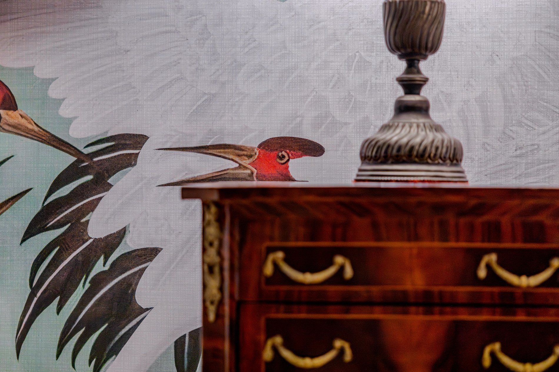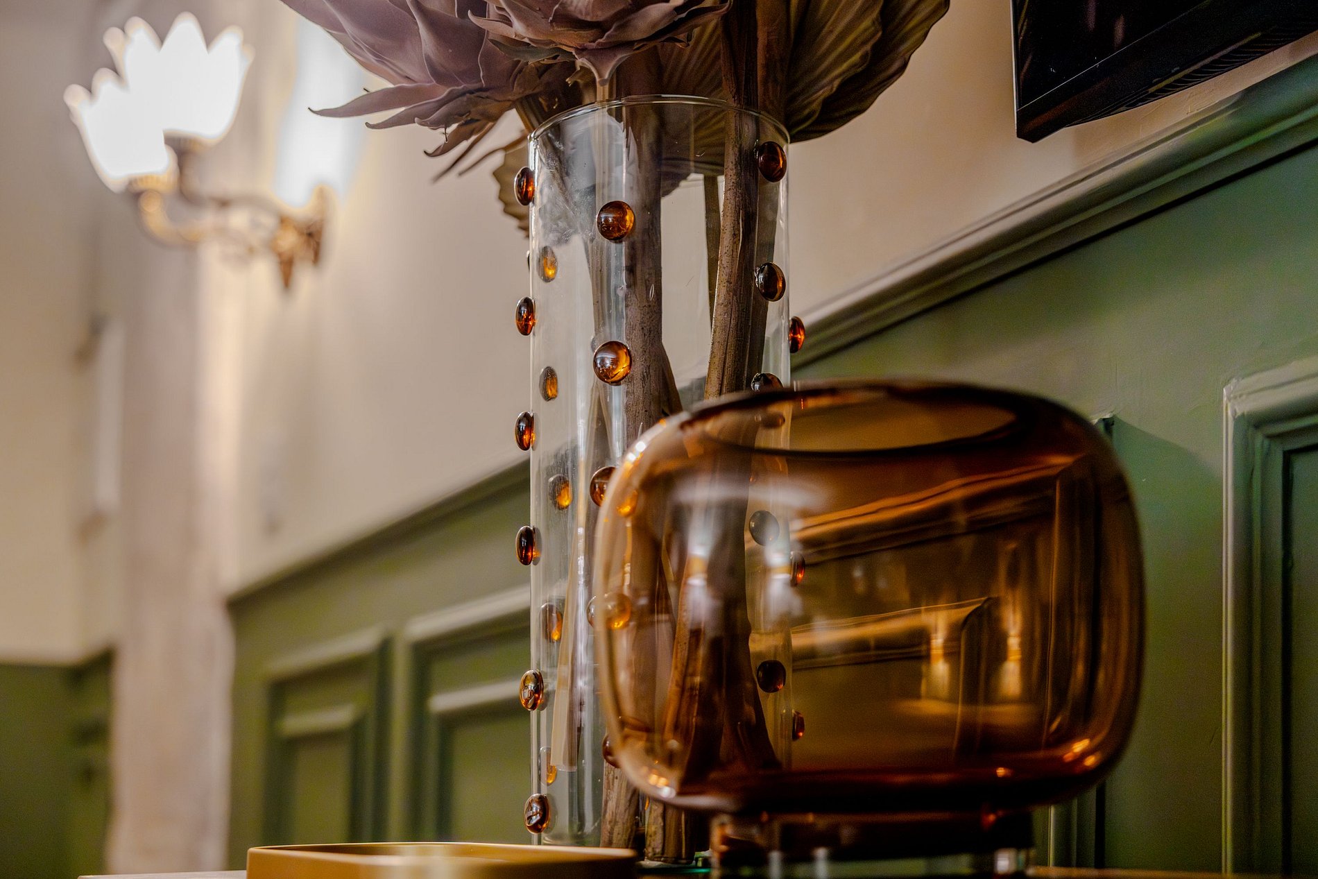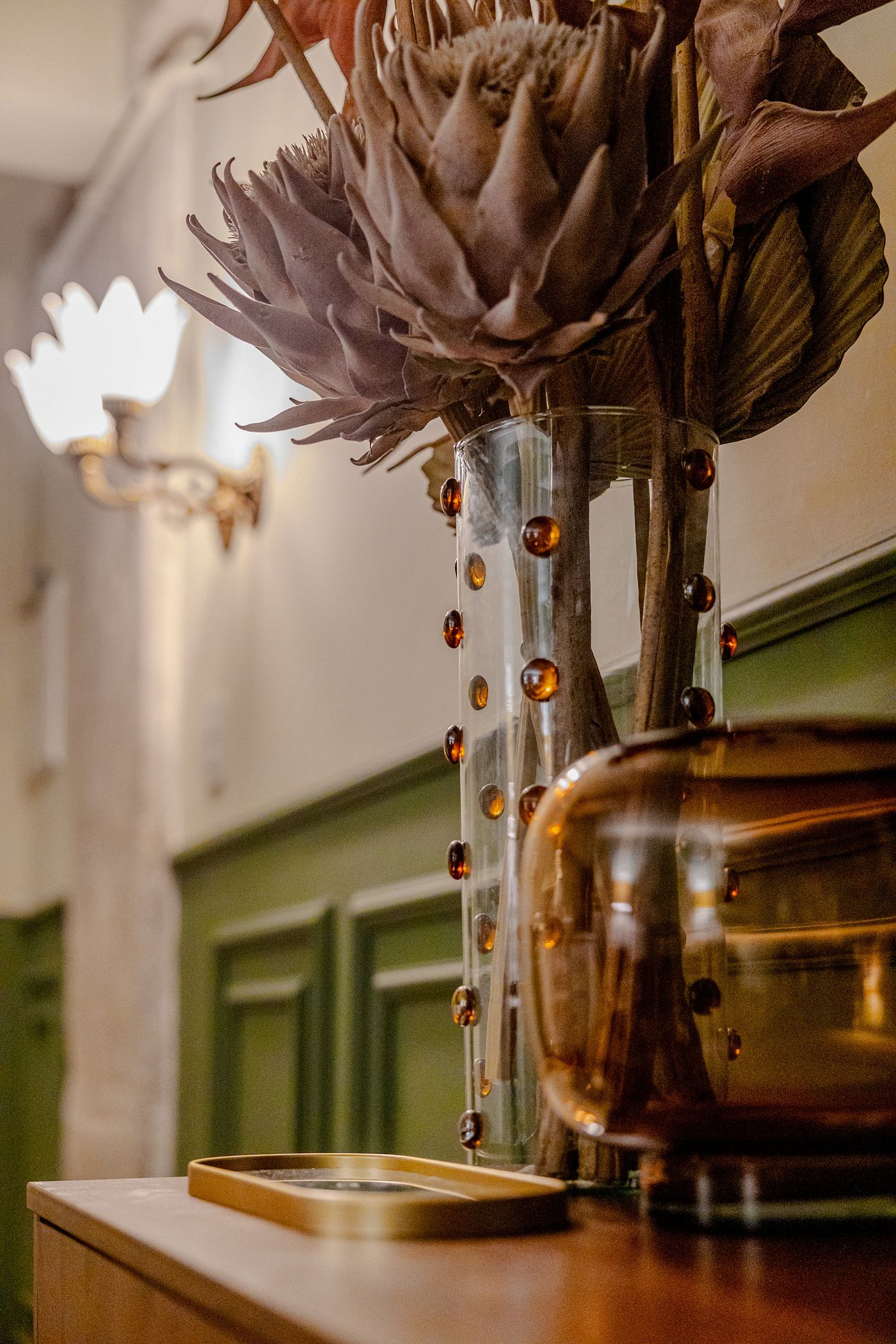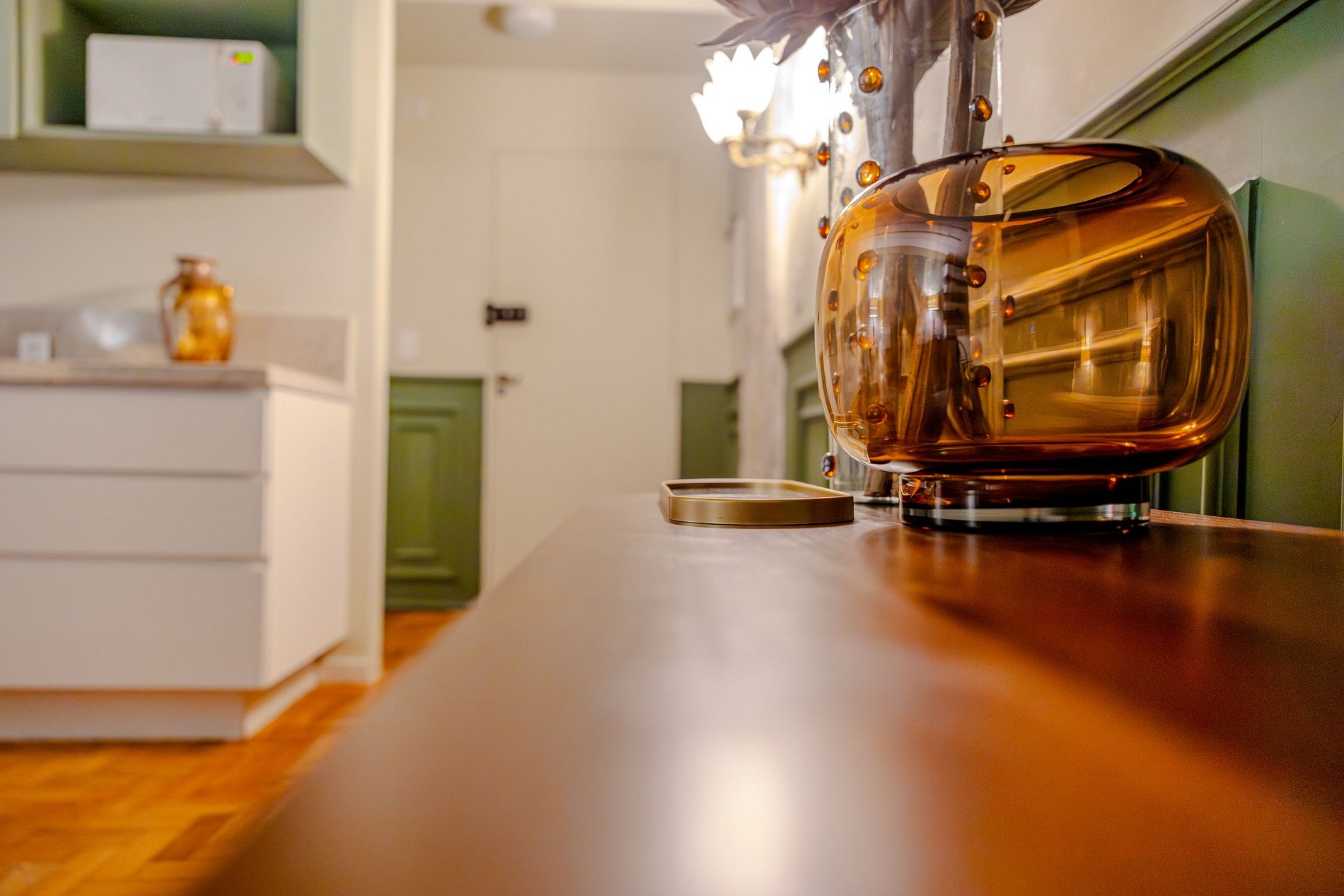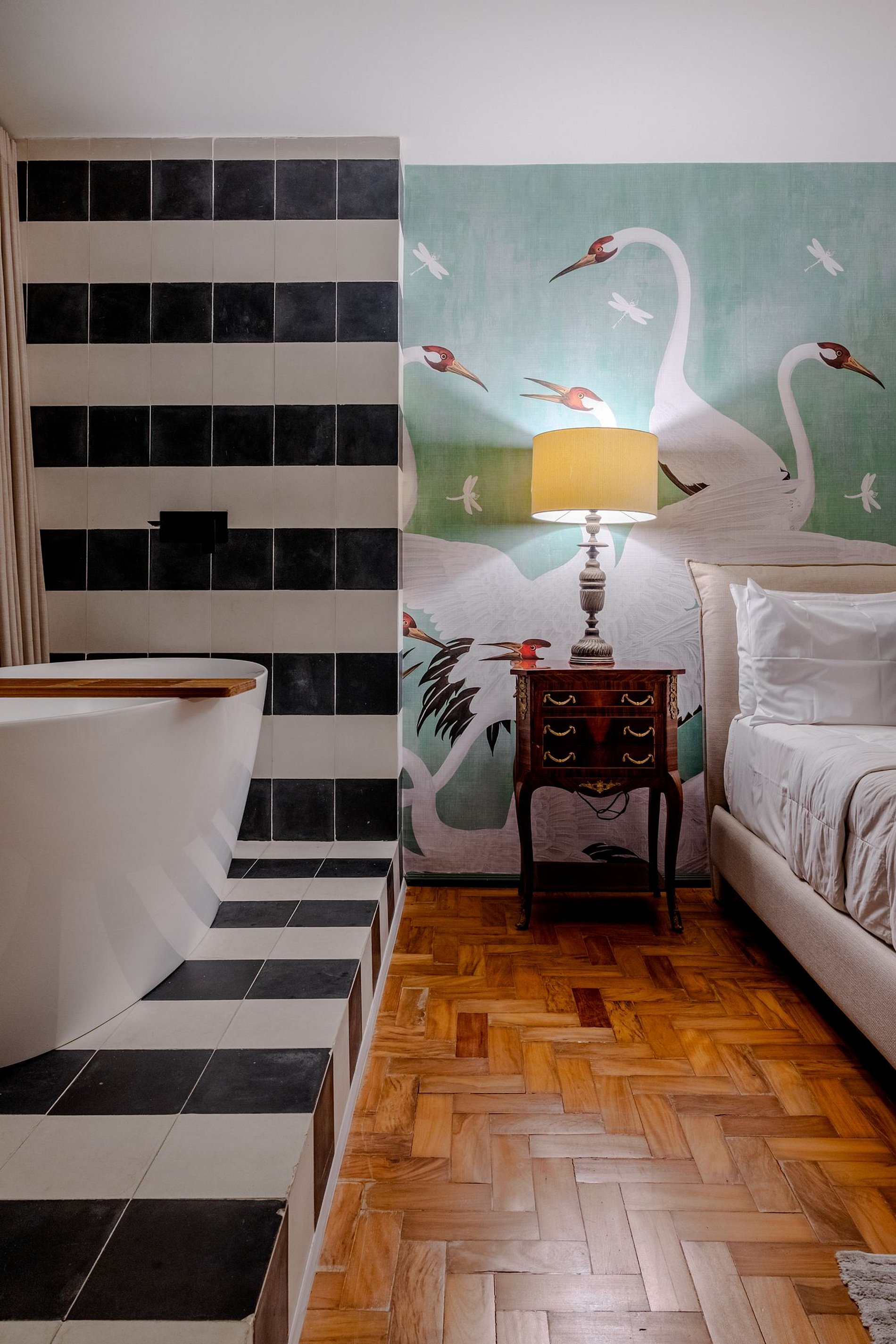 Mirante Sampa Sky Spa, design que mescla arquitetura contemporânea e decoração clássica. O espaço conta com piso de taco, boiseries elegantes e um lindo papel de parede artístico impactante. A paleta de tons verdes e neutros cria uma atmosfera refinada. Cozinha compacta e funcional, mobília curada e uma luxuosa banheira garantem conforto e exclusividade, com uma vista panorâmica de tirar o fôlego.