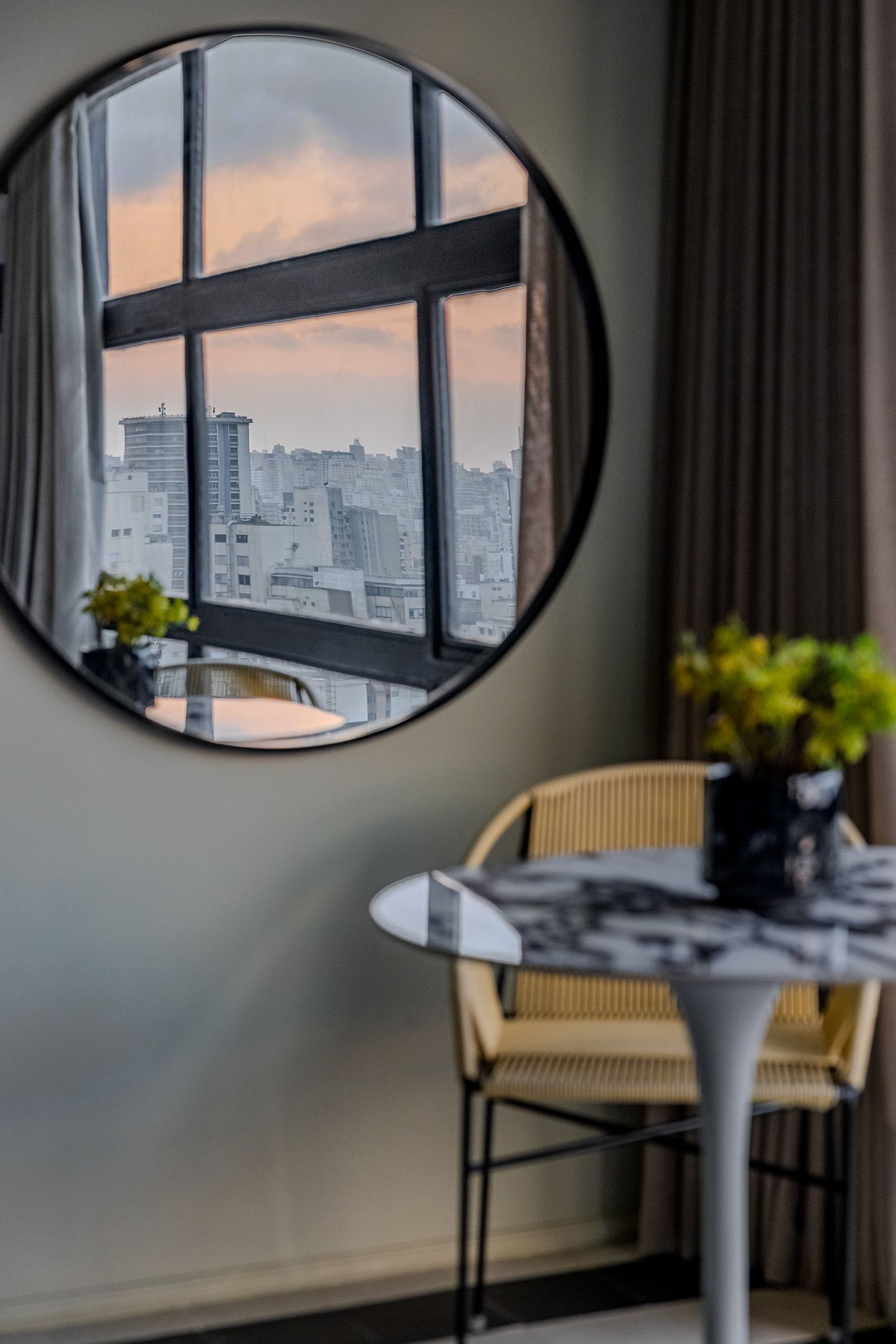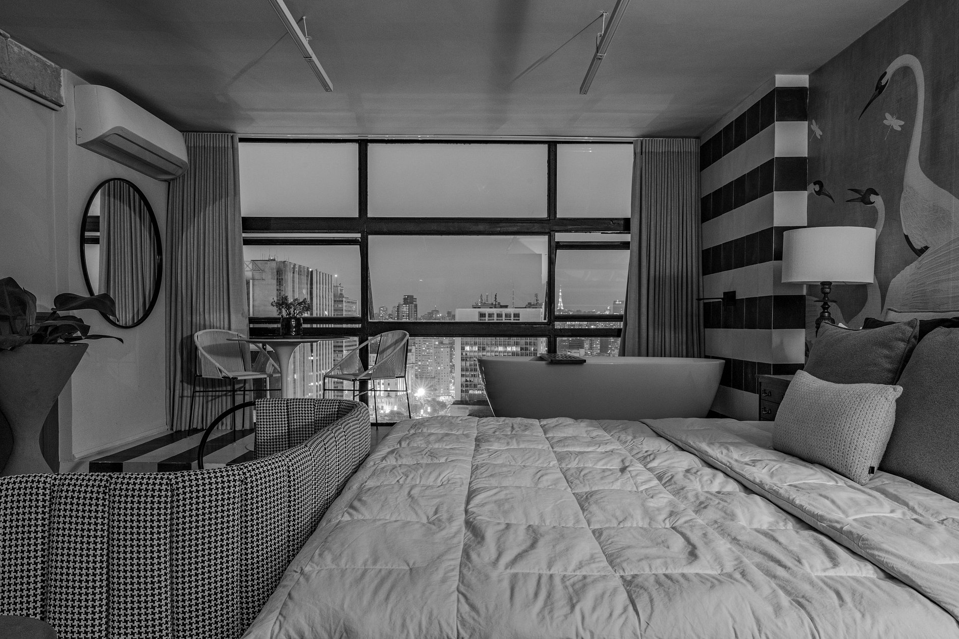 O grande diferencial deste espaço é a sua banheira estrategicamente posicionada próxima à janela, permitindo que você relaxe enquanto aprecia a imensidão da cidade. As persianas automatizadas garantem total controle da luz natural, criando o clima ideal para qualquer momento do dia.